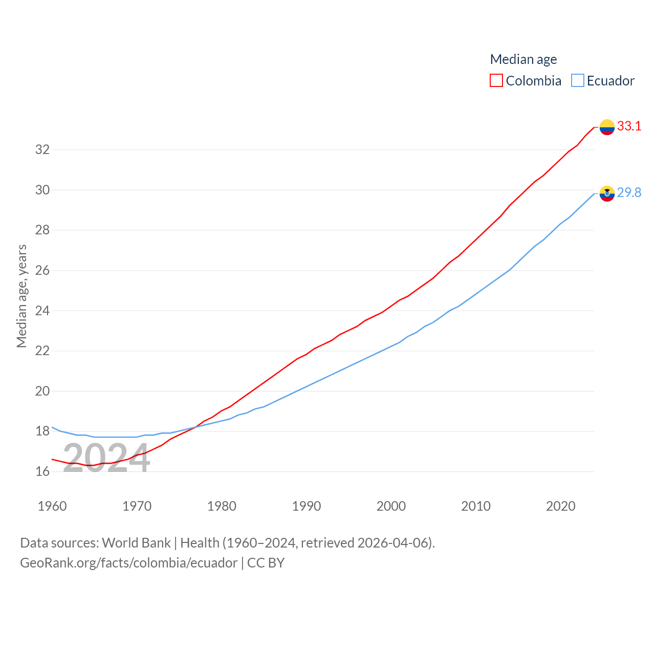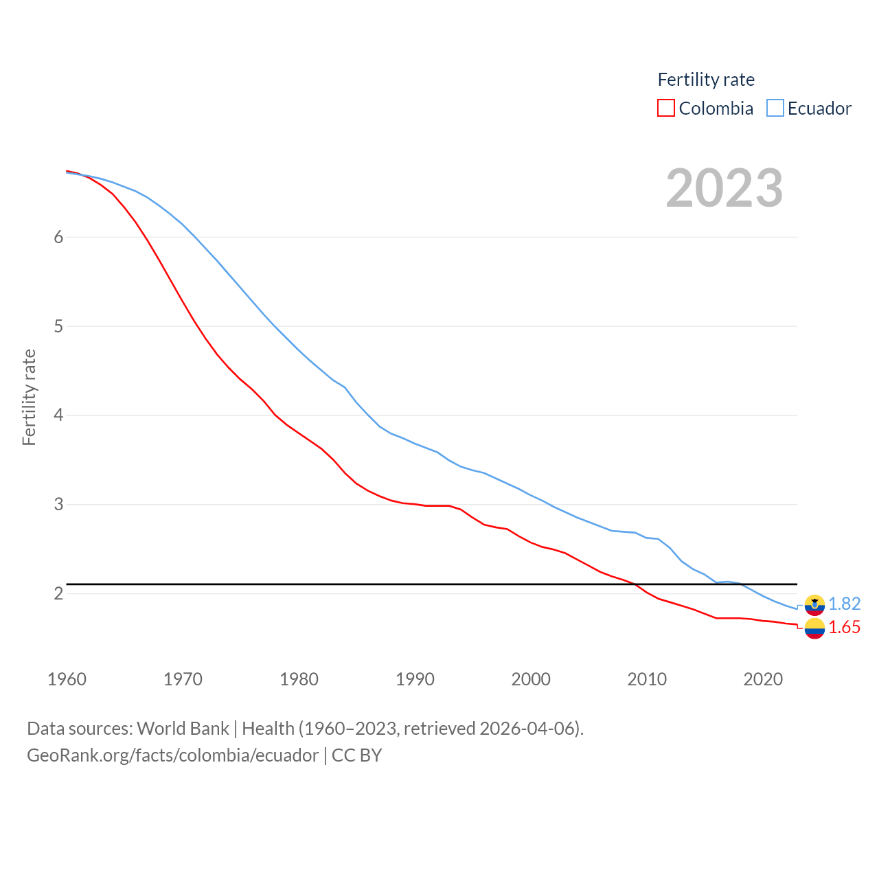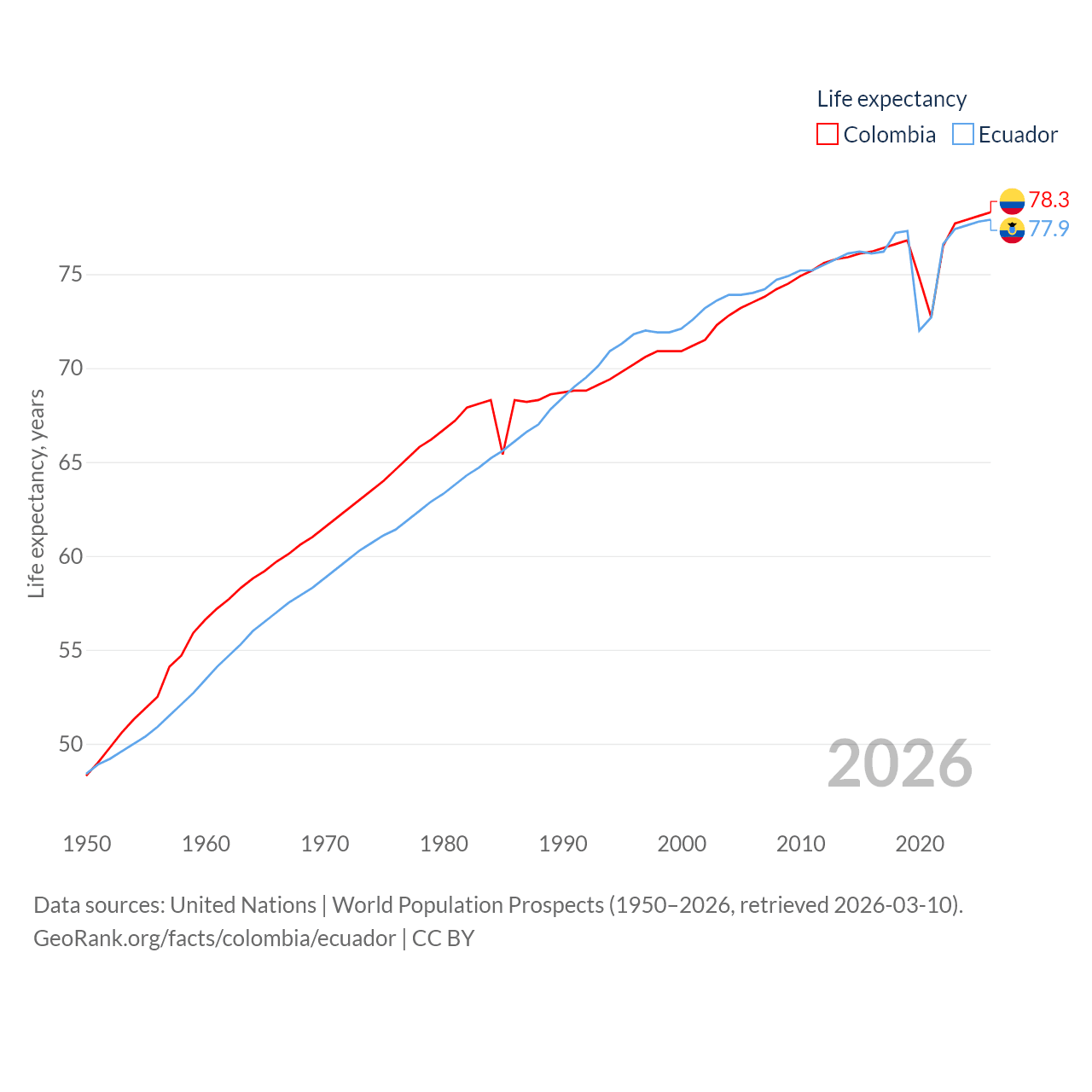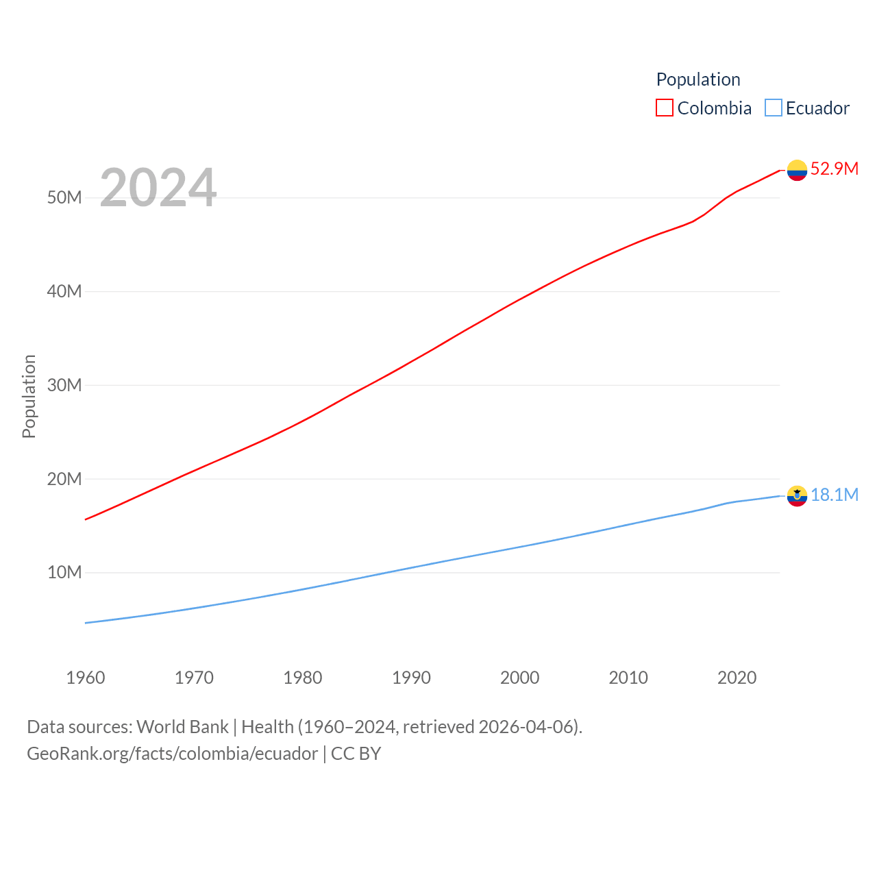 Colombia has a population of 52.9M (ranked 28/197), compared with 18.1M in Ecuador (ranked 71/197). Colombia's land area is 428,380 sq mi versus 95,892 sq mi for Ecuador (ranked 26th vs. 76th).