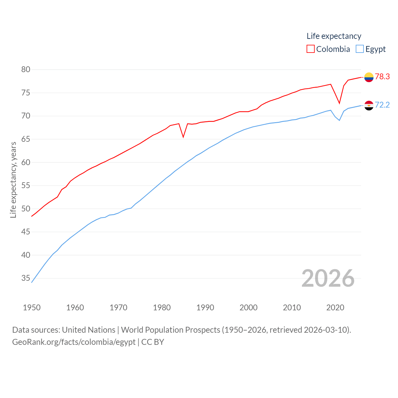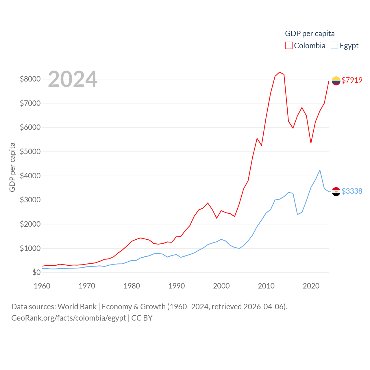 By GDP, Colombia ranks 39/197 ($419B) and Egypt ranks 41/197 ($389B). By GDP per capita, Colombia ranks 94/197 ($7,919), while Egypt ranks 138/197 ($3,338).
