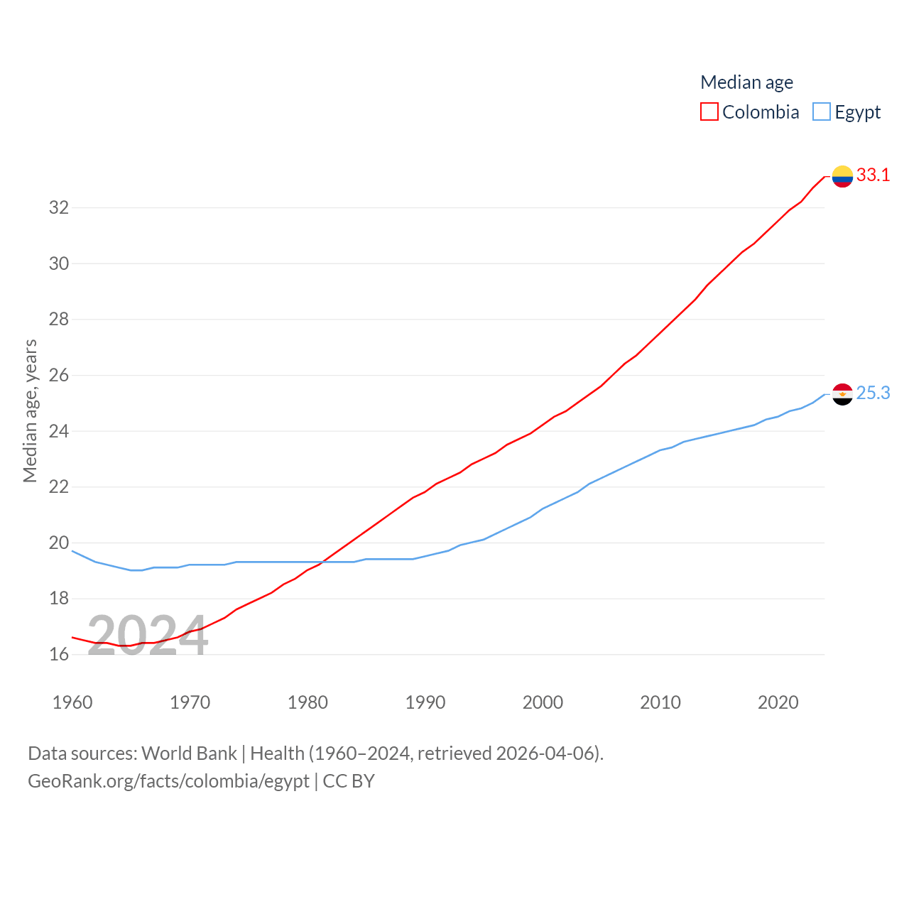 Colombia has a population of 52.9M (ranked 28/197), compared with 117M in Egypt (ranked 13/197). Colombia's land area is 428,380 sq mi versus 384,345 sq mi for Egypt (ranked 26th vs. 29th).