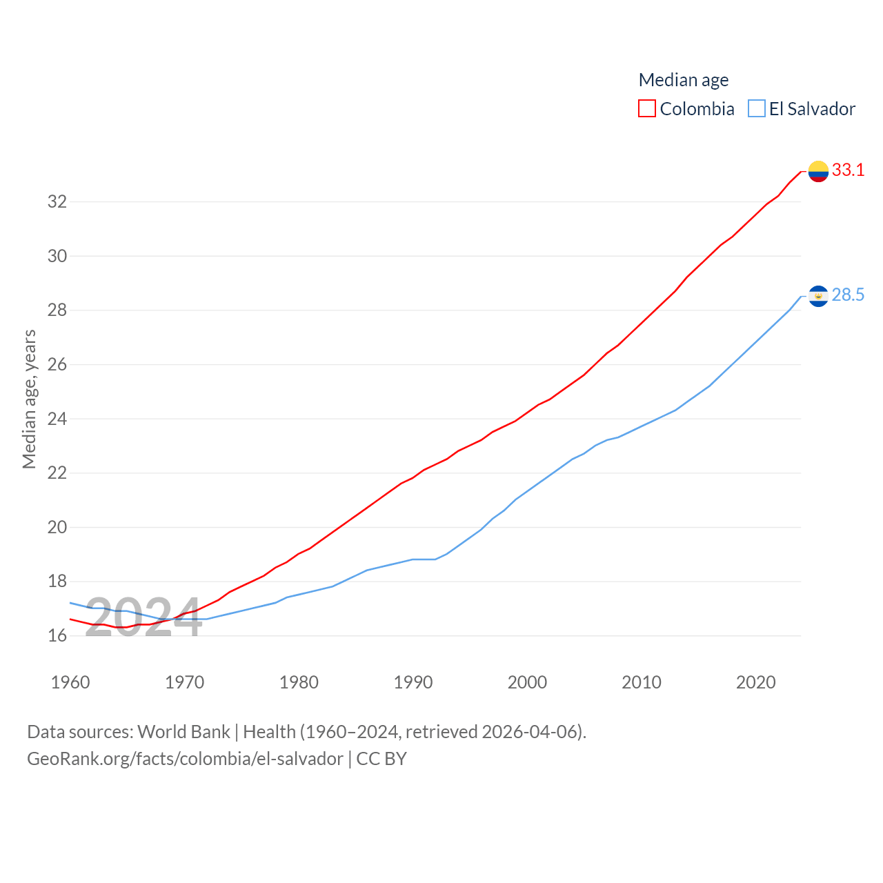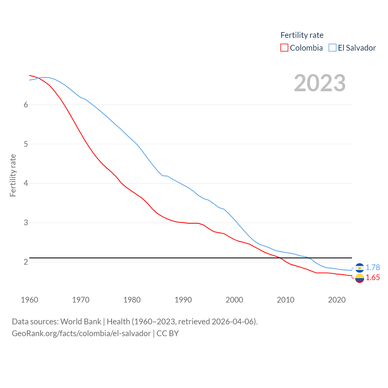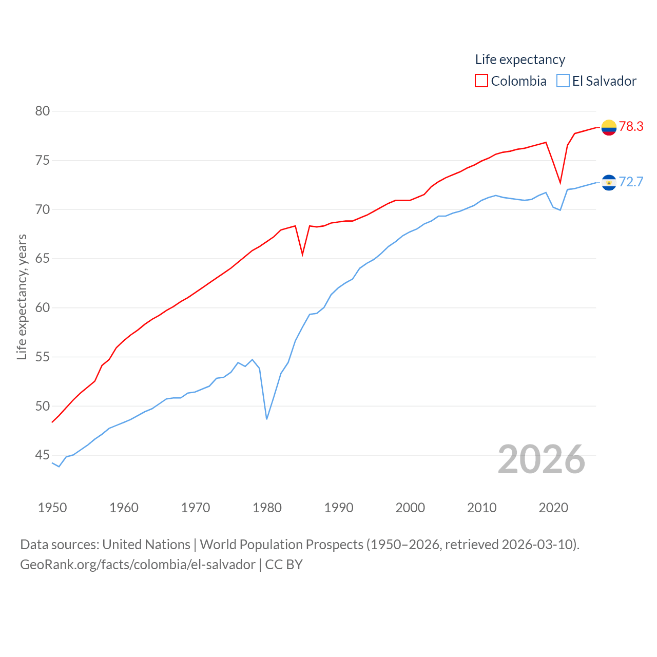 Colombia has a population of 52.9M (ranked 28/197), compared with 6.34M in El Salvador (ranked 111/197). Colombia's land area is 428,380 sq mi versus 8,000 sq mi for El Salvador (ranked 26th vs. 150th).