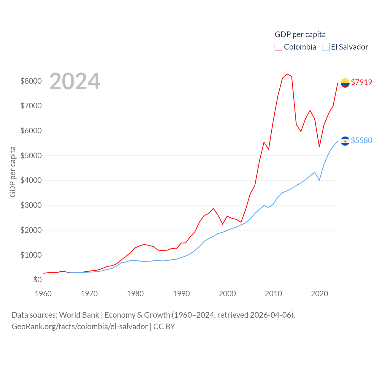 By GDP, Colombia ranks 39/197 ($419B) and El Salvador ranks 105/197 ($35.4B). By GDP per capita, Colombia ranks 94/197 ($7,919), while El Salvador ranks 116/197 ($5,580).