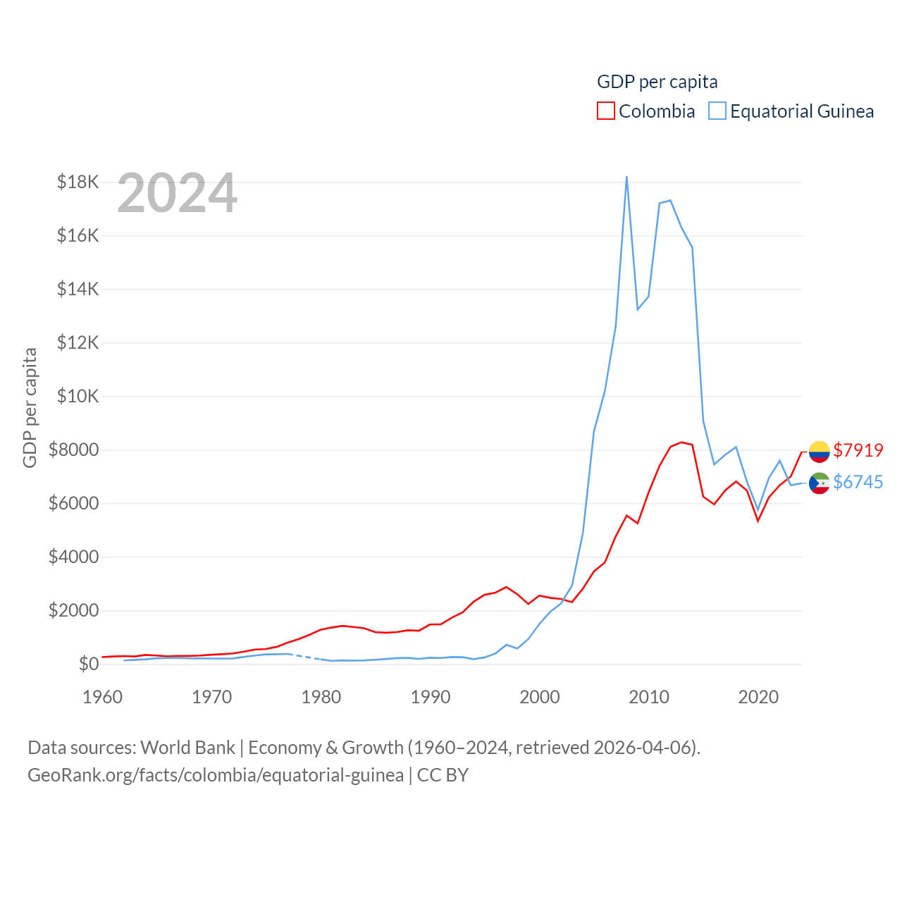 By GDP, Colombia ranks 39/197 ($419B) and Equatorial Guinea ranks 148/197 ($12.8B). By GDP per capita, Colombia ranks 94/197 ($7,919), while Equatorial Guinea ranks 106/197 ($6,745).