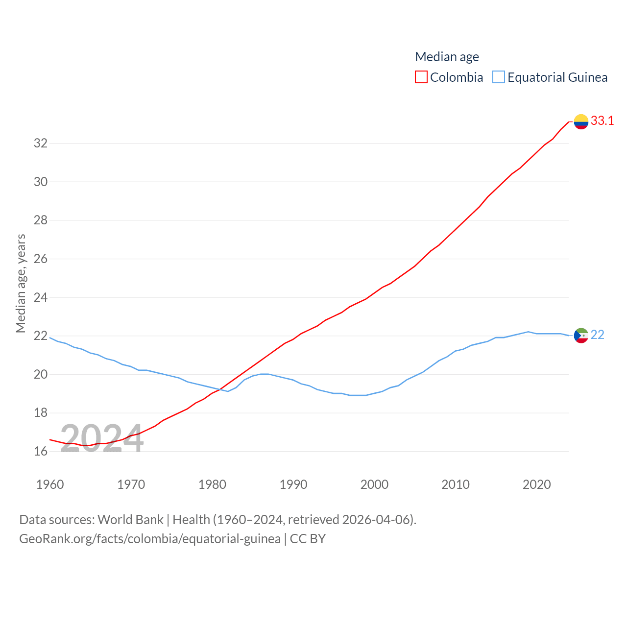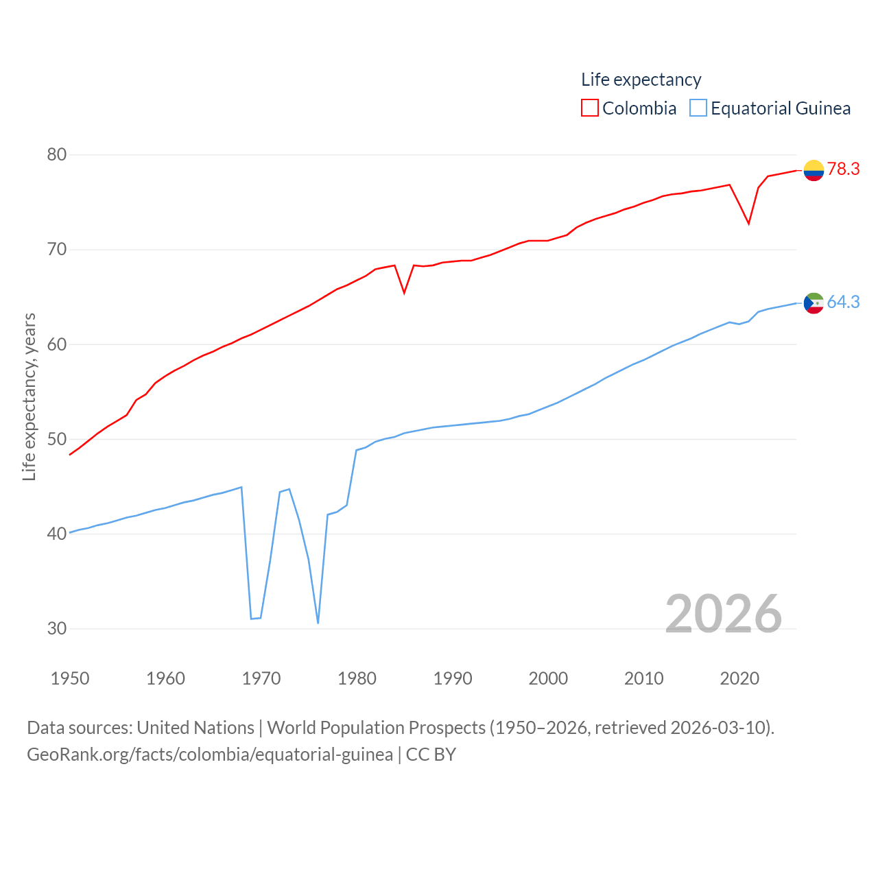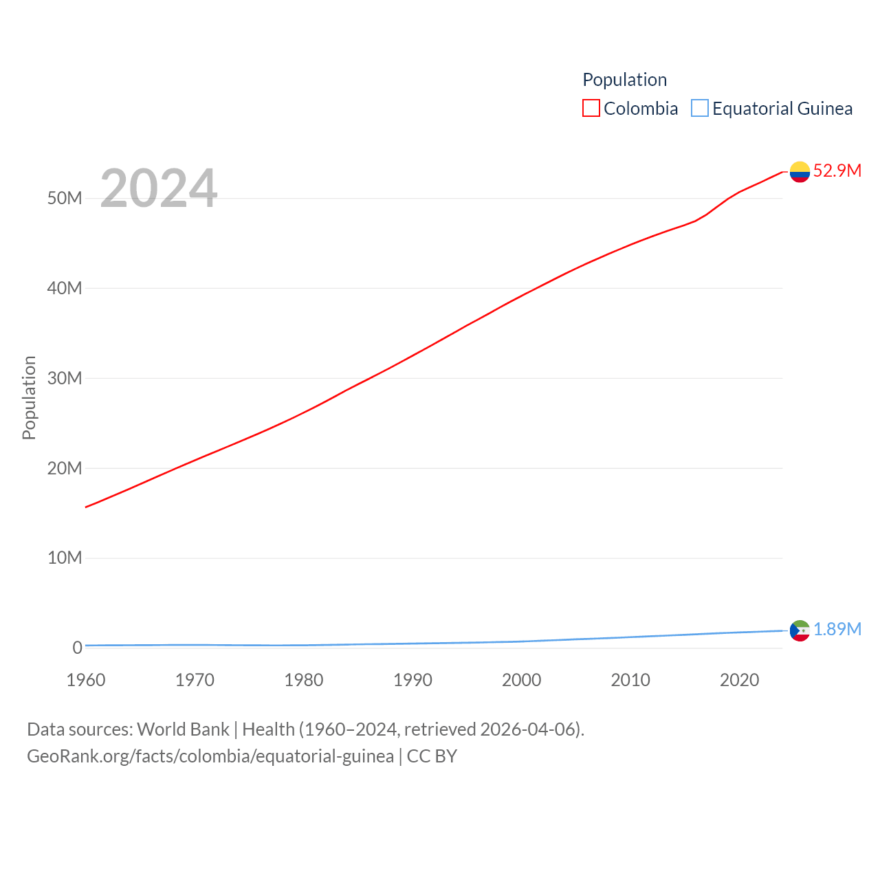 Colombia has a population of 52.9M (ranked 28/197), compared with 1.89M in Equatorial Guinea (ranked 148/197). Colombia's land area is 428,380 sq mi versus 10,830 sq mi for Equatorial Guinea (ranked 26th vs. 140th).