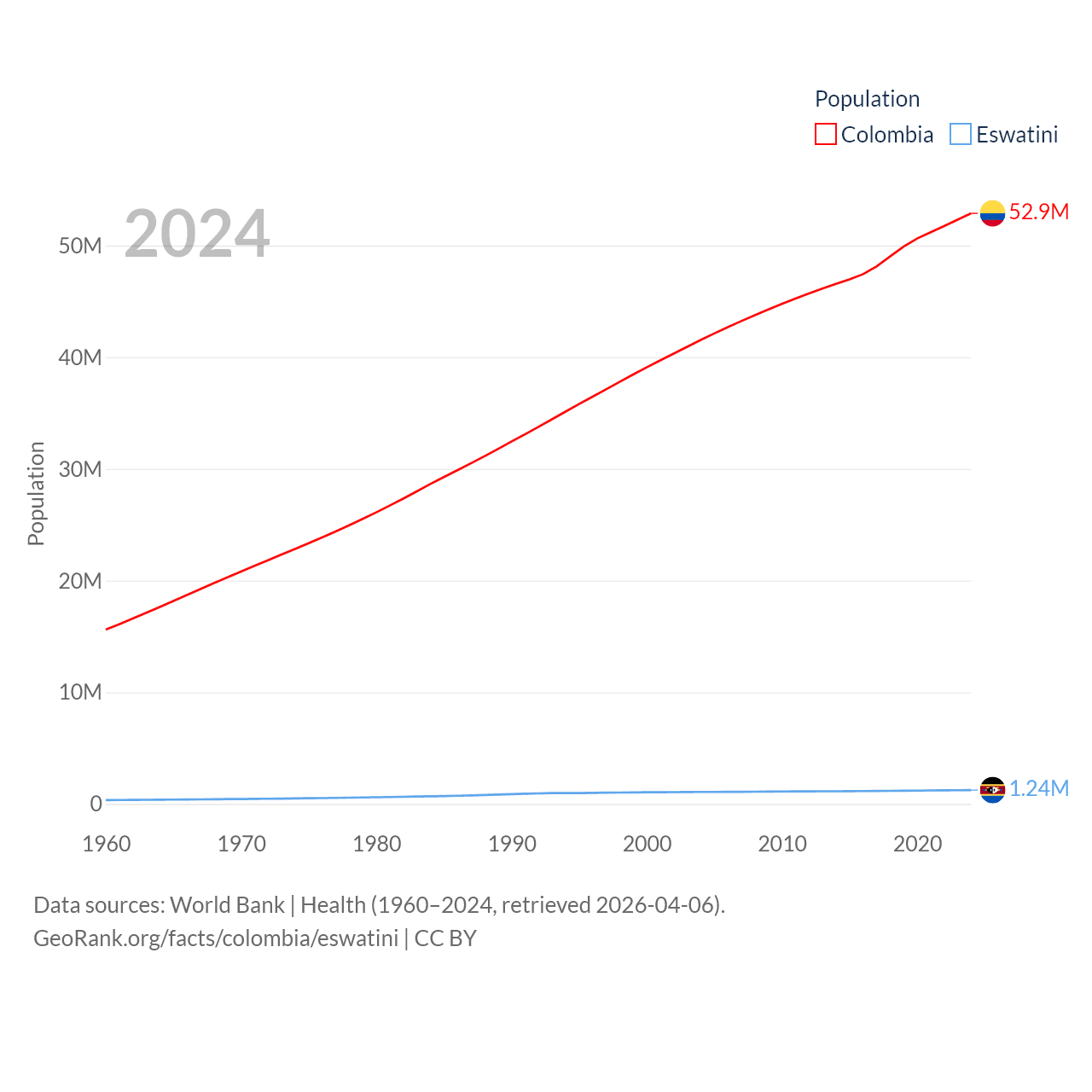 Colombia has a population of 52.9M (ranked 28/197), compared with 1.24M in Eswatini (ranked 157/197). Colombia's land area is 428,380 sq mi versus 6,641 sq mi for Eswatini (ranked 26th vs. 154th).