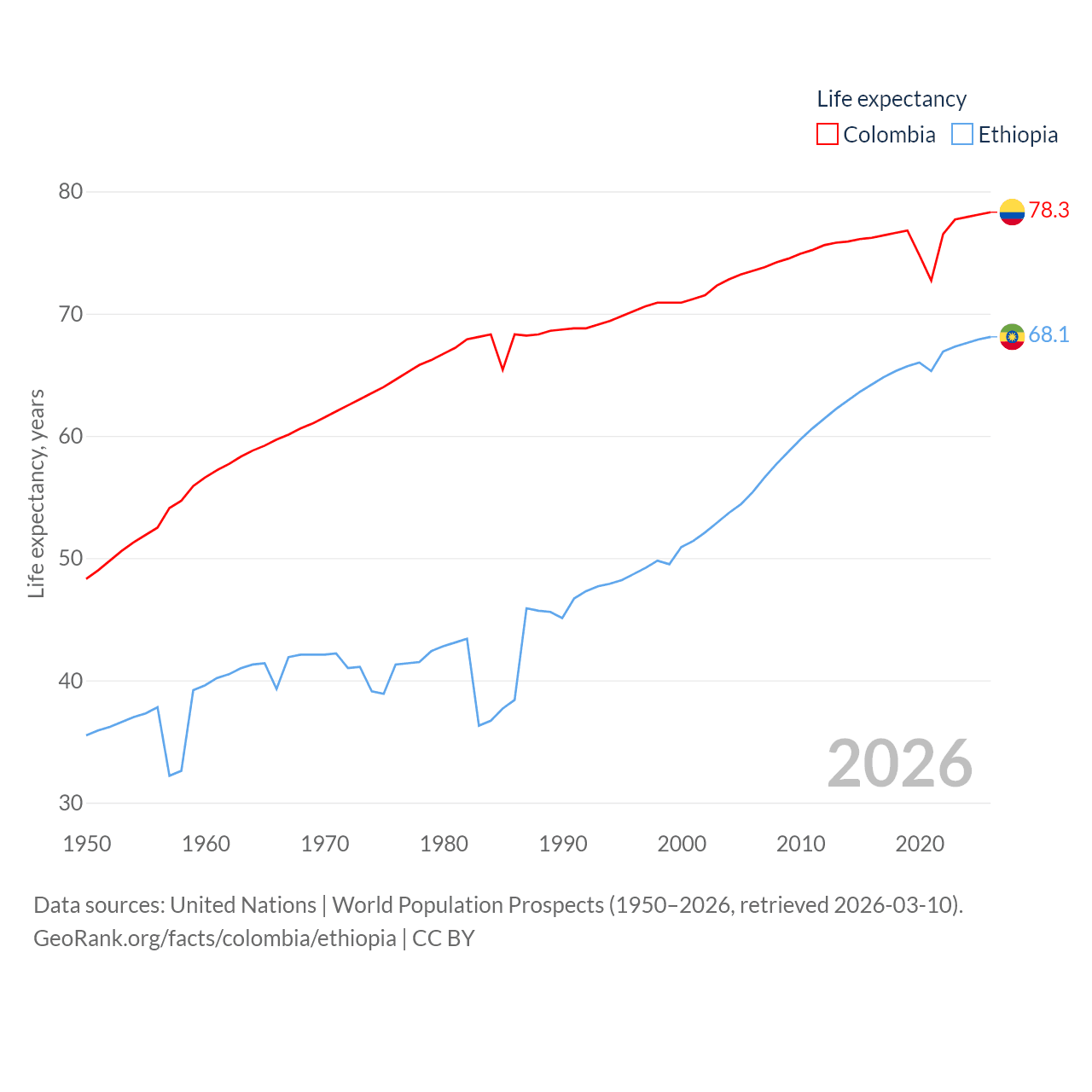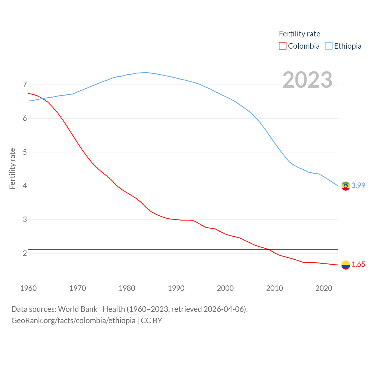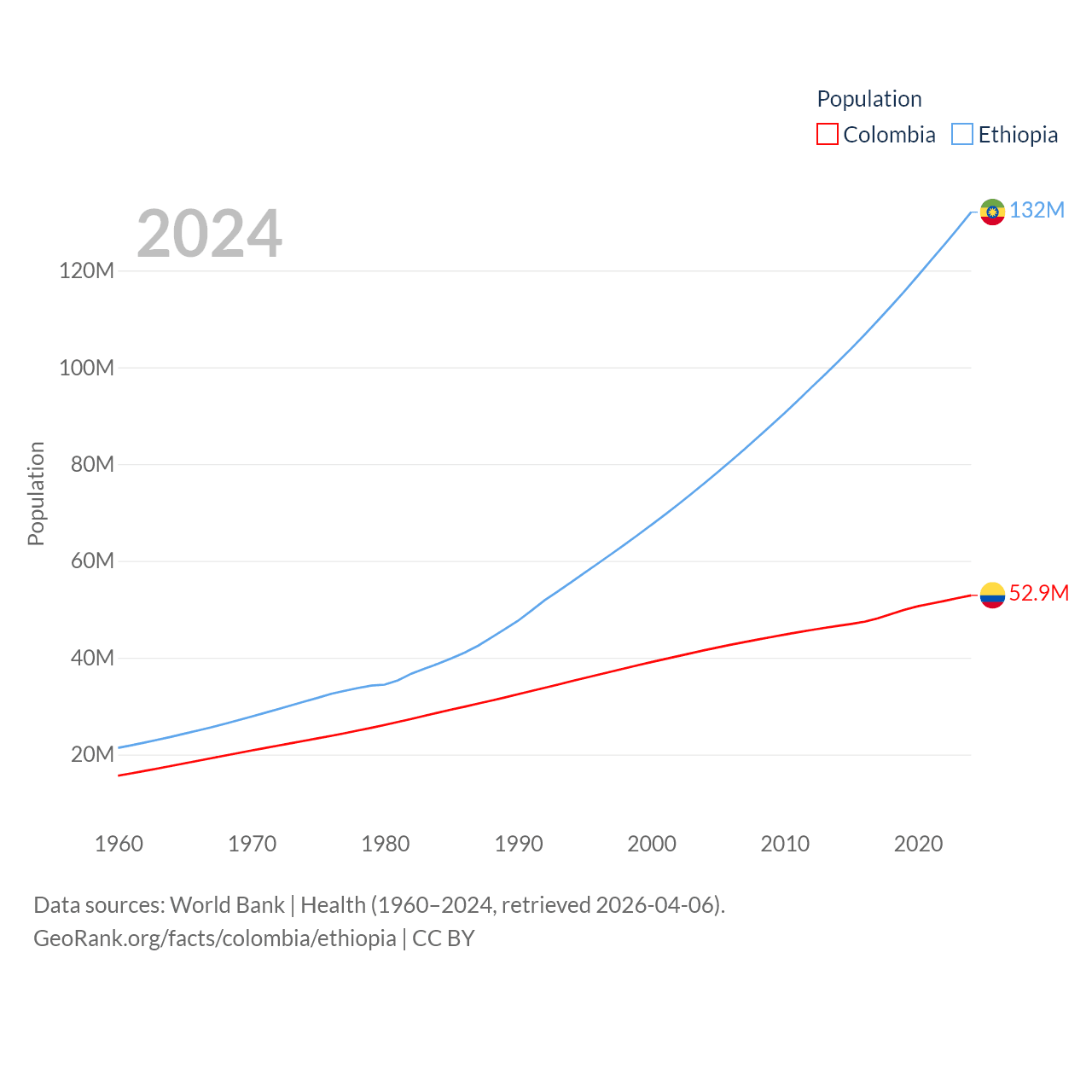 Colombia has a population of 52.9M (ranked 28/197), compared with 132M in Ethiopia (ranked 10/197). Colombia's land area is 428,380 sq mi versus 435,716 sq mi for Ethiopia (ranked 26th vs. 25th).