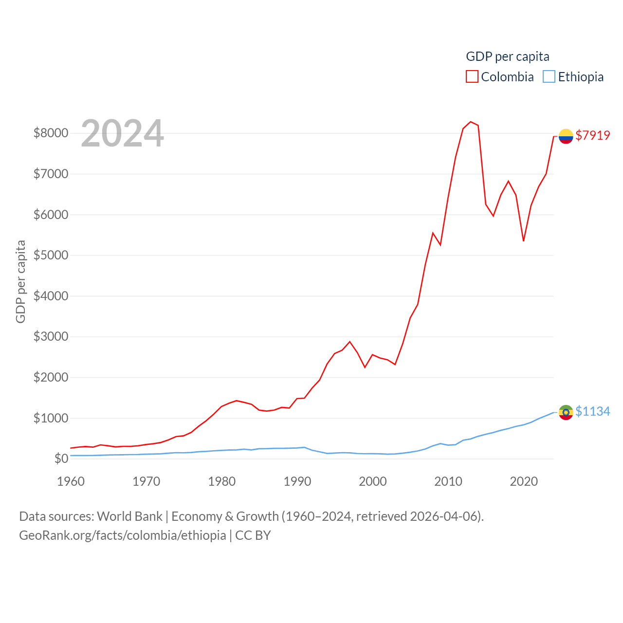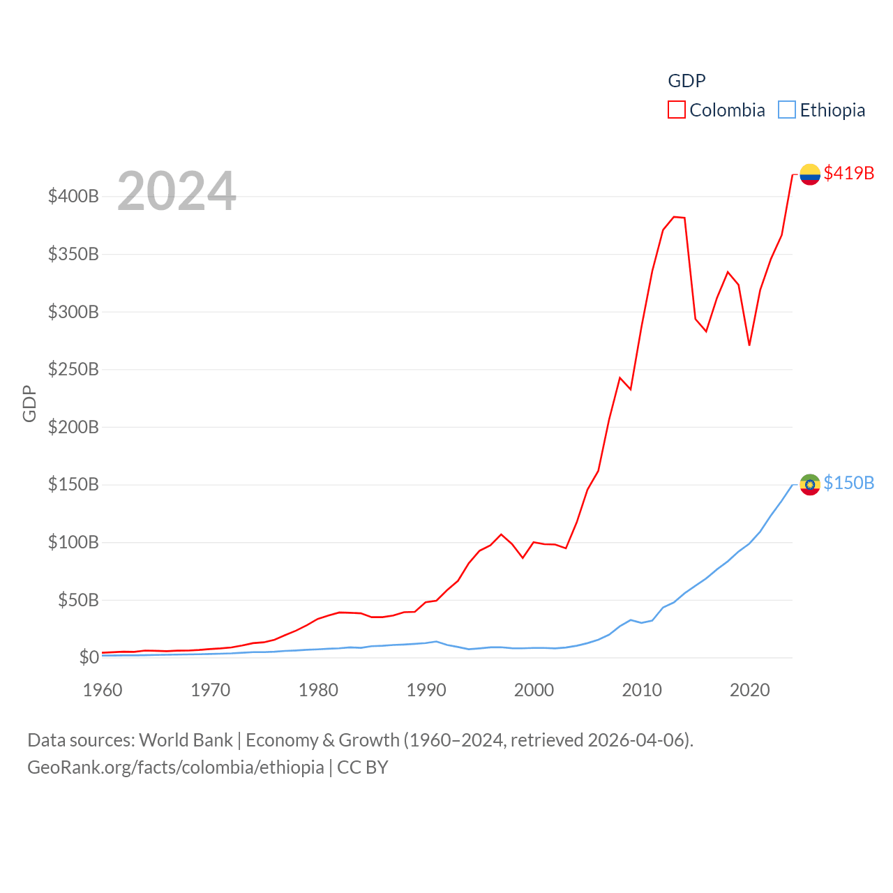 By GDP, Colombia ranks 39/197 ($419B) and Ethiopia ranks 60/197 ($150B). By GDP per capita, Colombia ranks 94/197 ($7,919), while Ethiopia ranks 171/197 ($1,134).