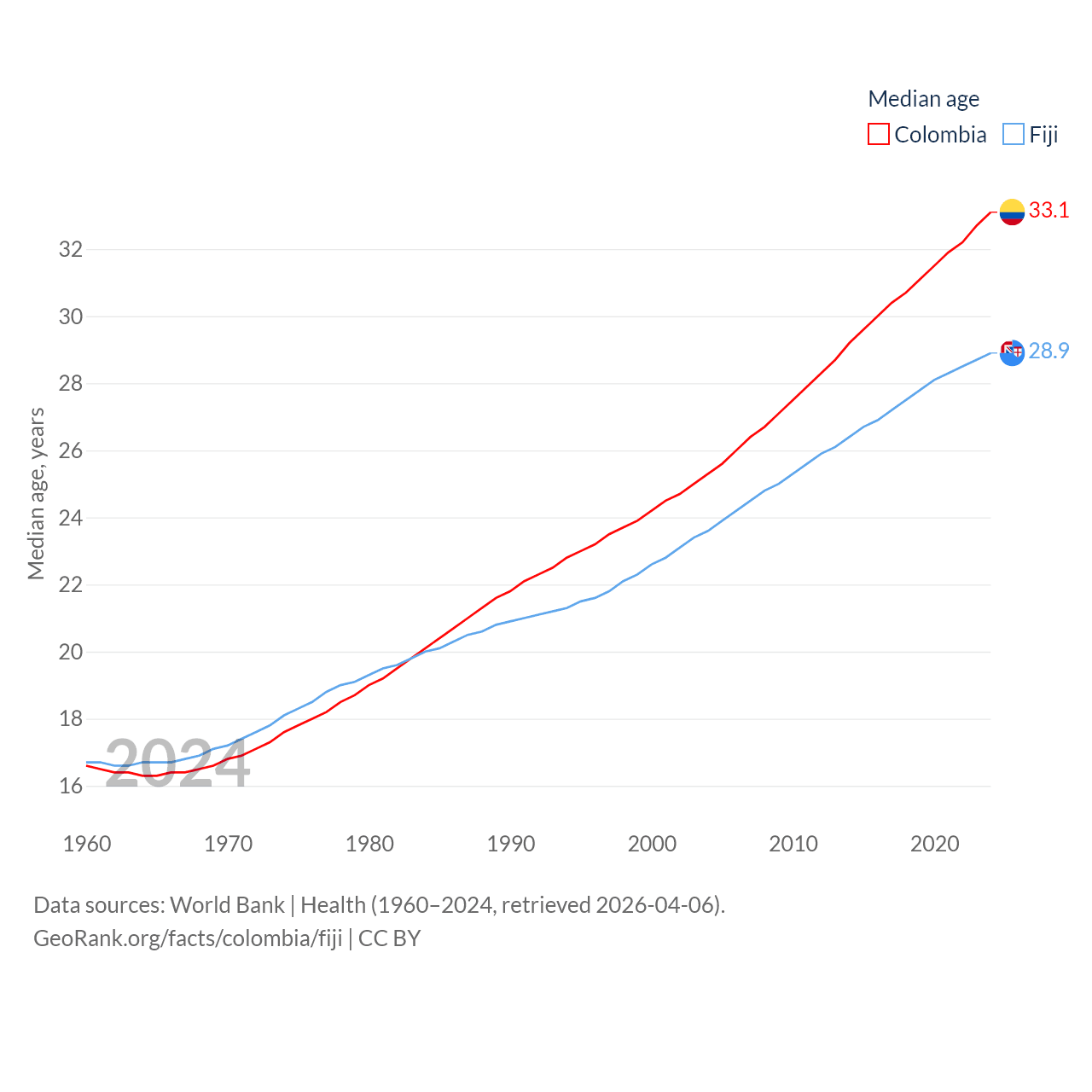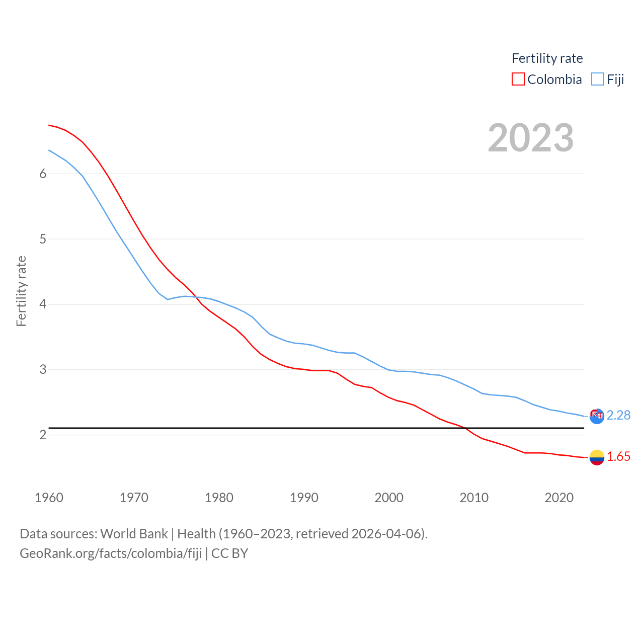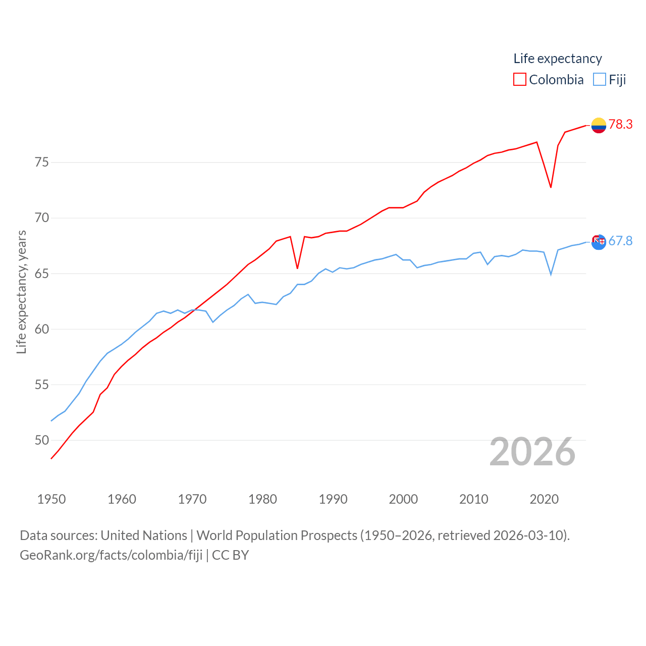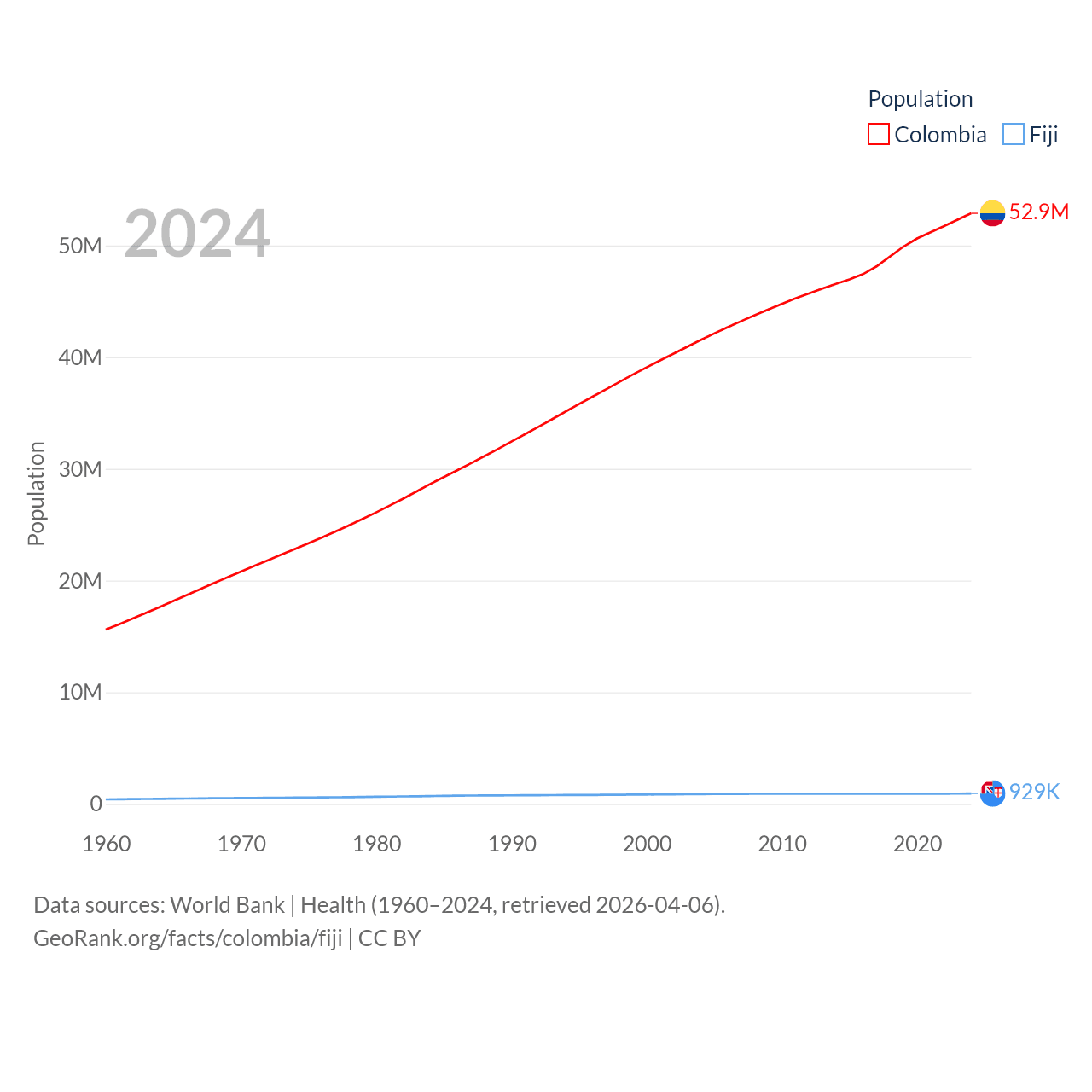 Colombia has a population of 52.9M (ranked 28/197), compared with 929K in Fiji (ranked 159/197). Colombia's land area is 428,380 sq mi versus 7,054 sq mi for Fiji (ranked 26th vs. 152nd).