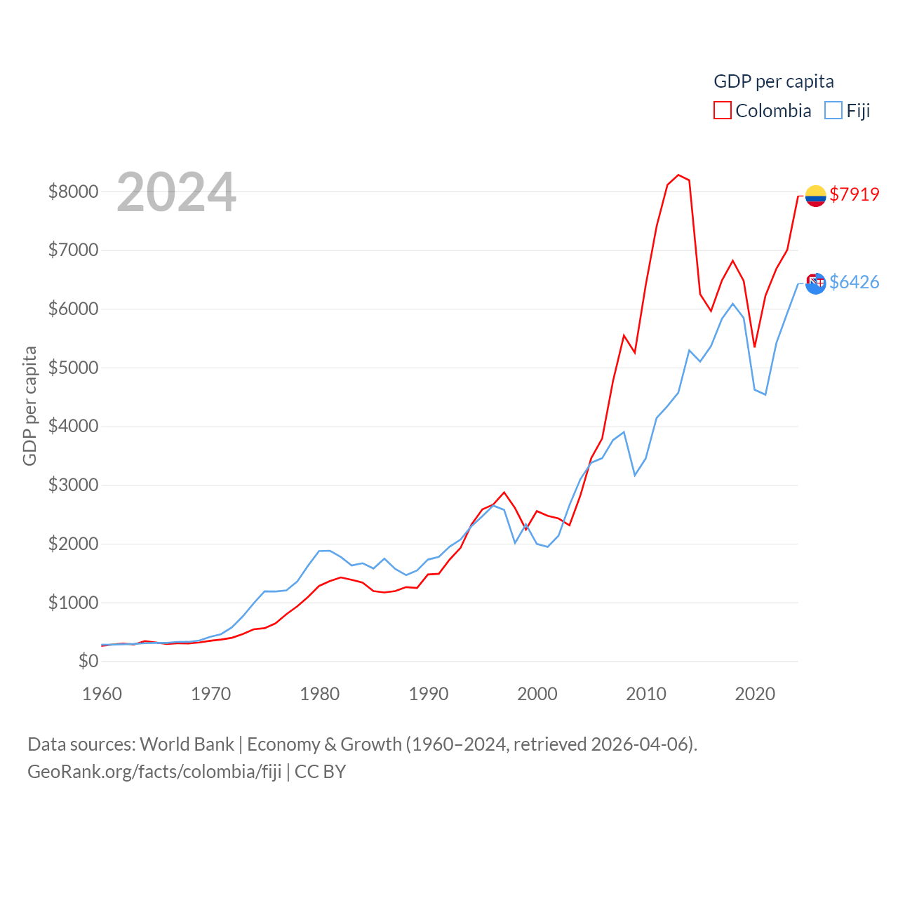 By GDP, Colombia ranks 39/197 ($419B) and Fiji ranks 161/197 ($5.97B). By GDP per capita, Colombia ranks 94/197 ($7,919), while Fiji ranks 108/197 ($6,426).
