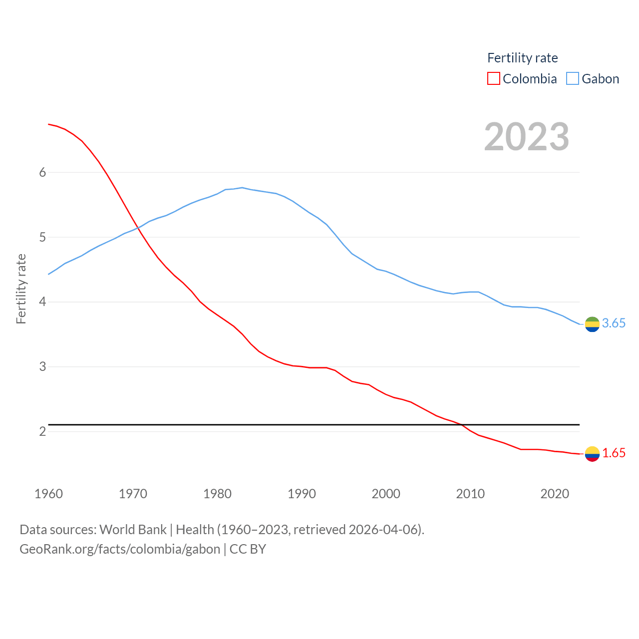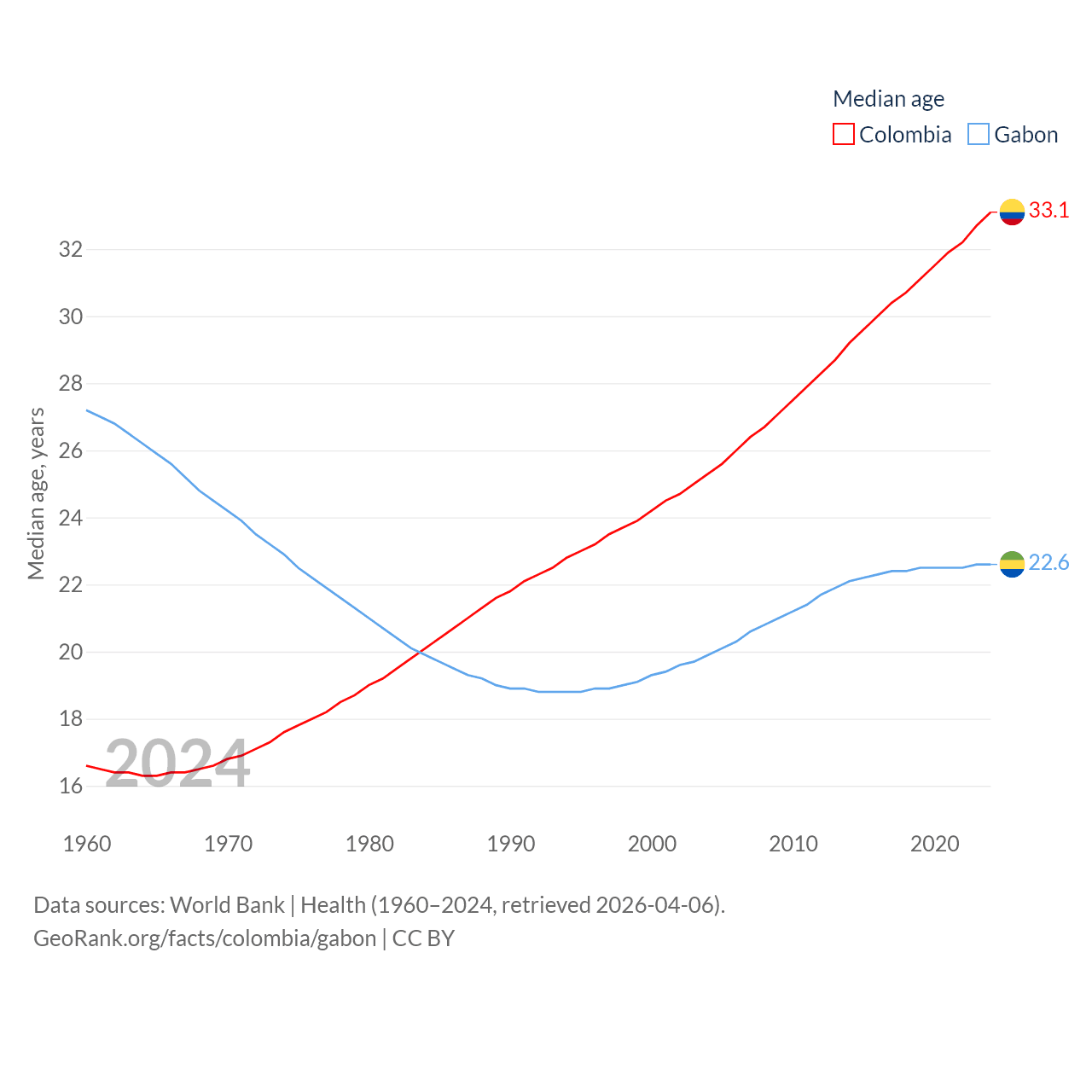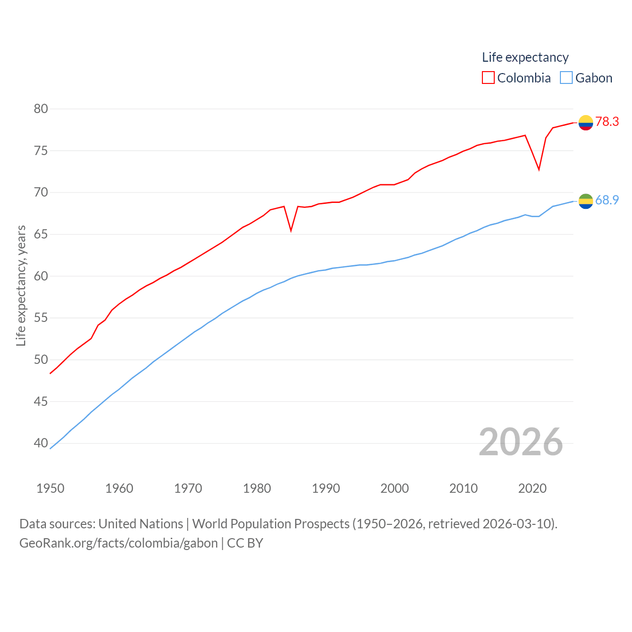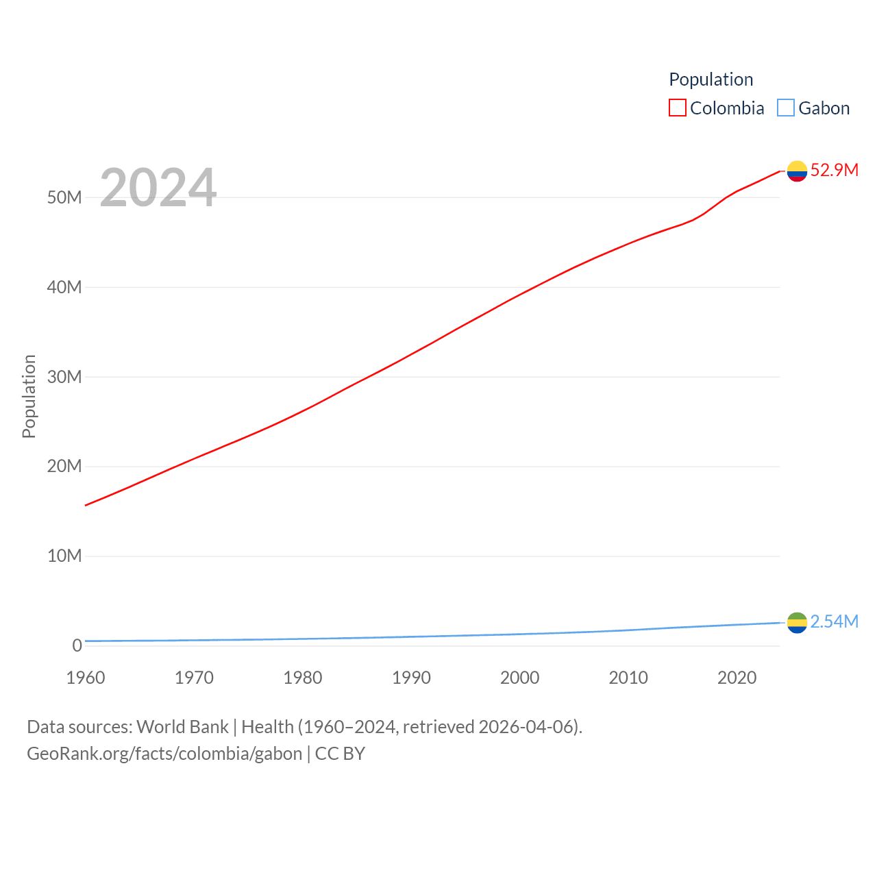Colombia has a population of 52.9M (ranked 28/197), compared with 2.54M in Gabon (ranked 141/197). Colombia's land area is 428,380 sq mi versus 99,487 sq mi for Gabon (ranked 26th vs. 75th).