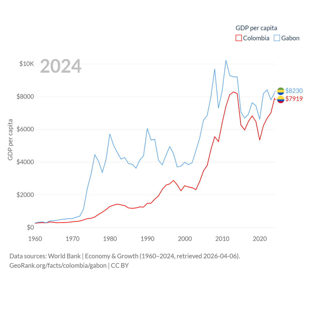 By GDP, Colombia ranks 39/197 ($419B) and Gabon ranks 127/197 ($20.9B). By GDP per capita, Colombia ranks 94/197 ($7,919), while Gabon ranks 93/197 ($8,230).