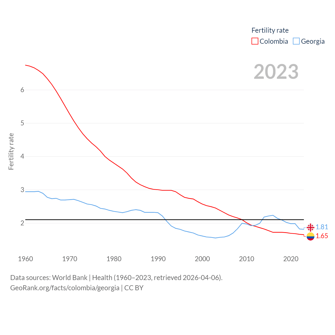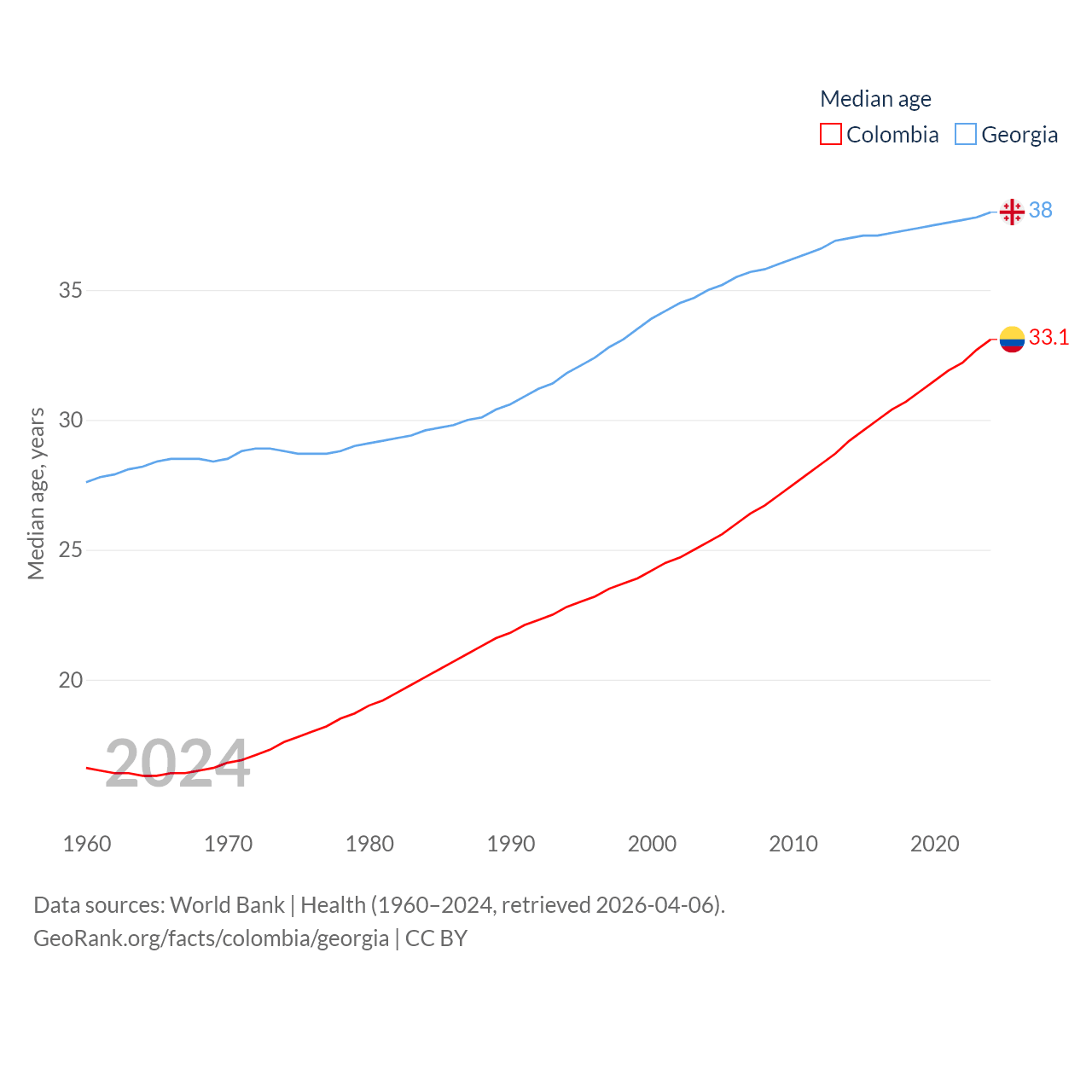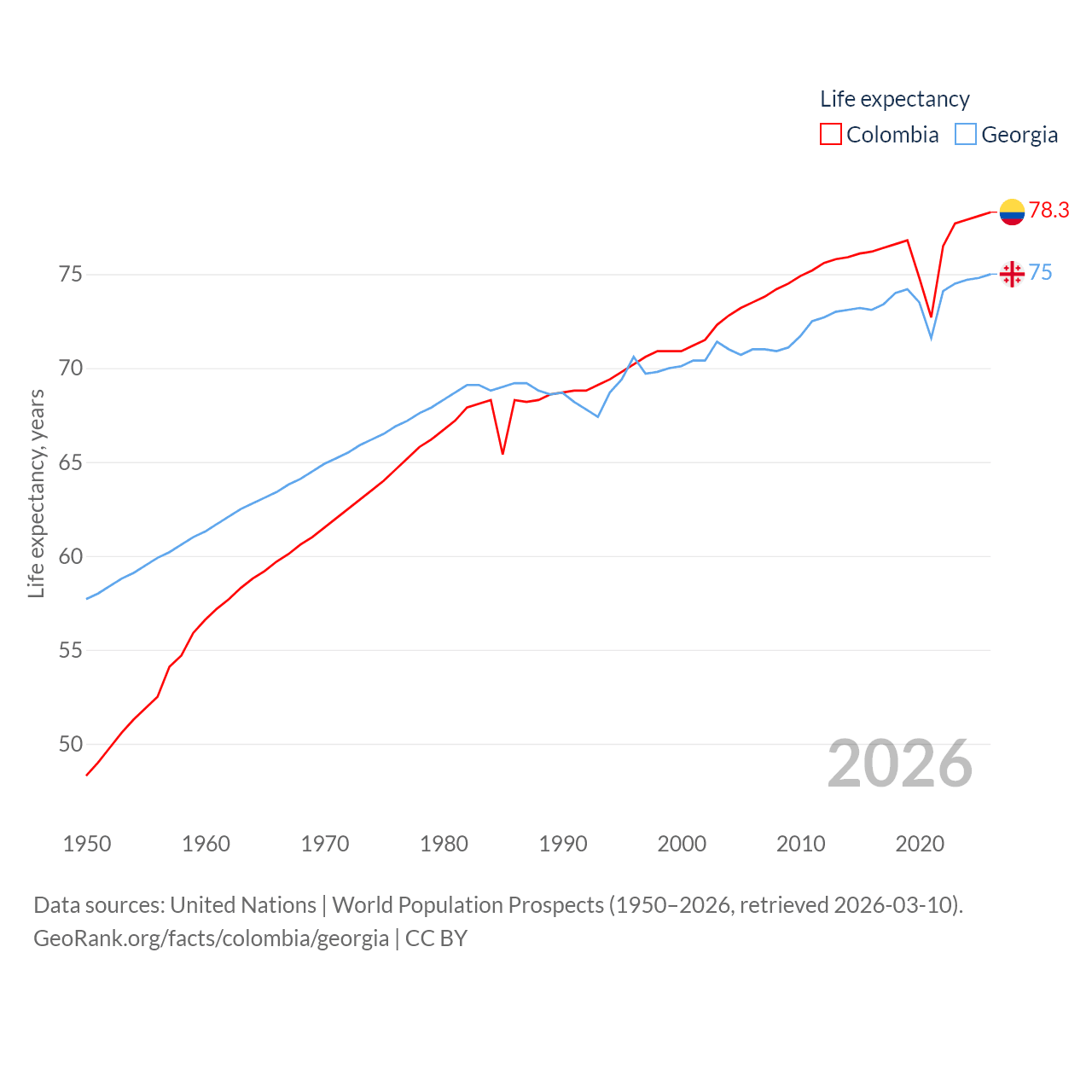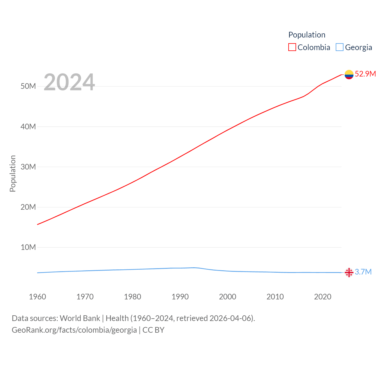 Colombia has a population of 52.9M (ranked 28/197), compared with 3.7M in Georgia (ranked 130/197). Colombia's land area is 428,380 sq mi versus 26,830 sq mi for Georgia (ranked 26th vs. 118th).