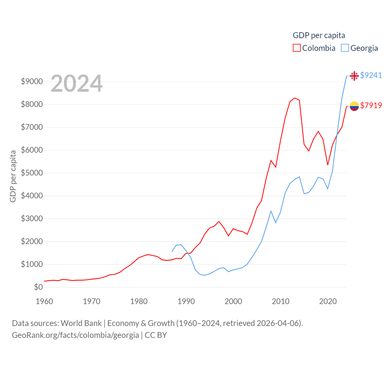 By GDP, Colombia ranks 39/197 ($419B) and Georgia ranks 107/197 ($34.2B). By GDP per capita, Colombia ranks 94/197 ($7,919), while Georgia ranks 89/197 ($9,241).