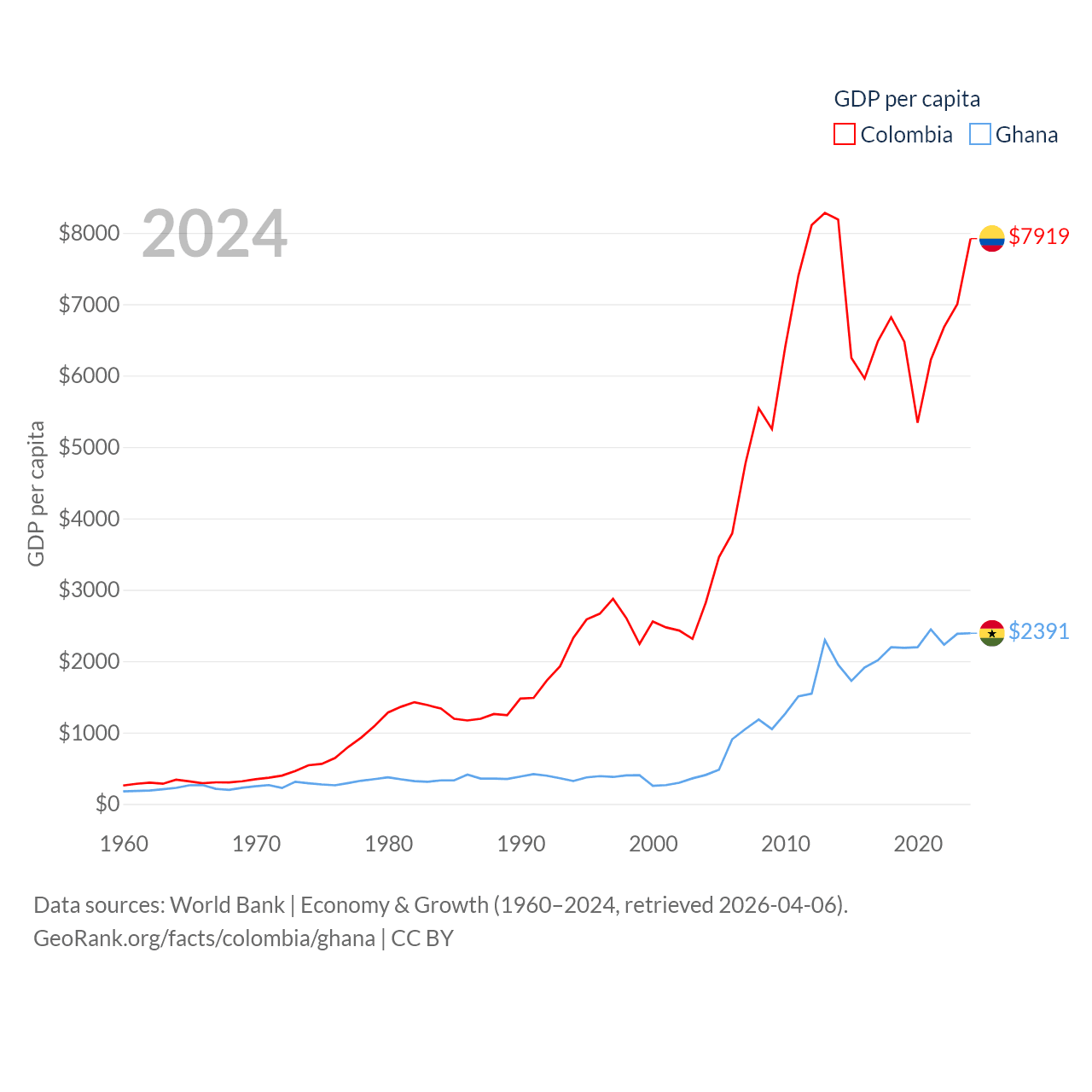 By GDP, Colombia ranks 39/197 ($419B) and Ghana ranks 80/197 ($82.3B). By GDP per capita, Colombia ranks 94/197 ($7,919), while Ghana ranks 151/197 ($2,391).