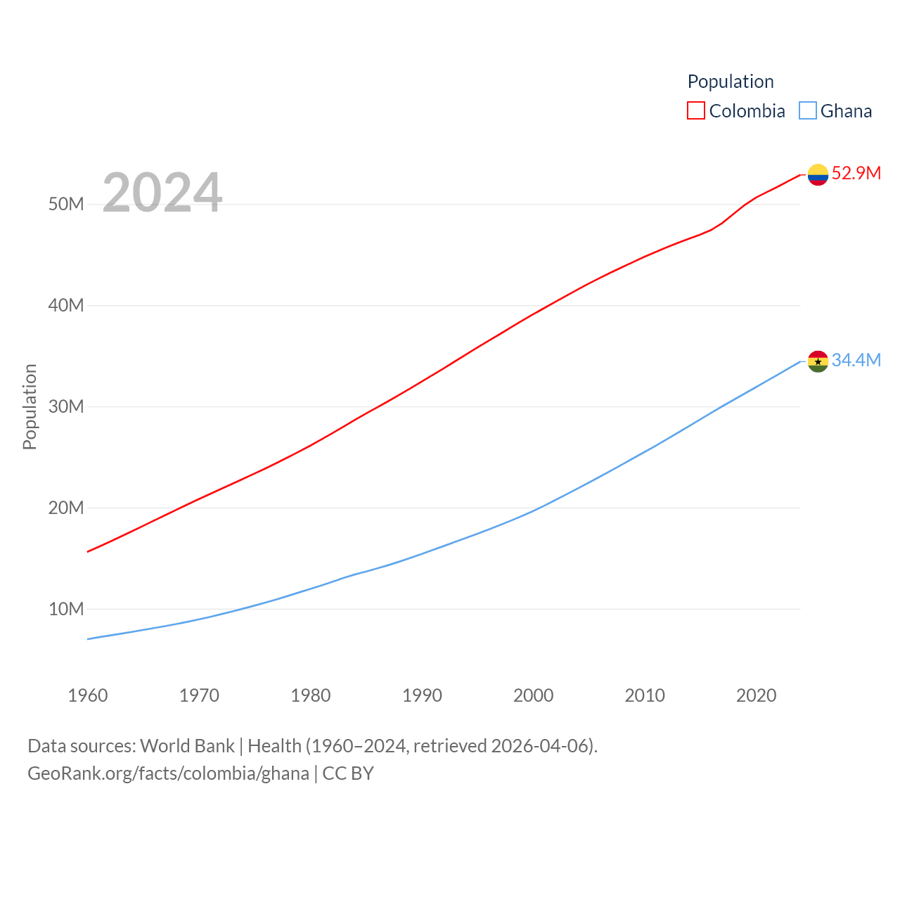Colombia has a population of 52.9M (ranked 28/197), compared with 34.4M in Ghana (ranked 47/197). Colombia's land area is 428,380 sq mi versus 87,851 sq mi for Ghana (ranked 26th vs. 81st).