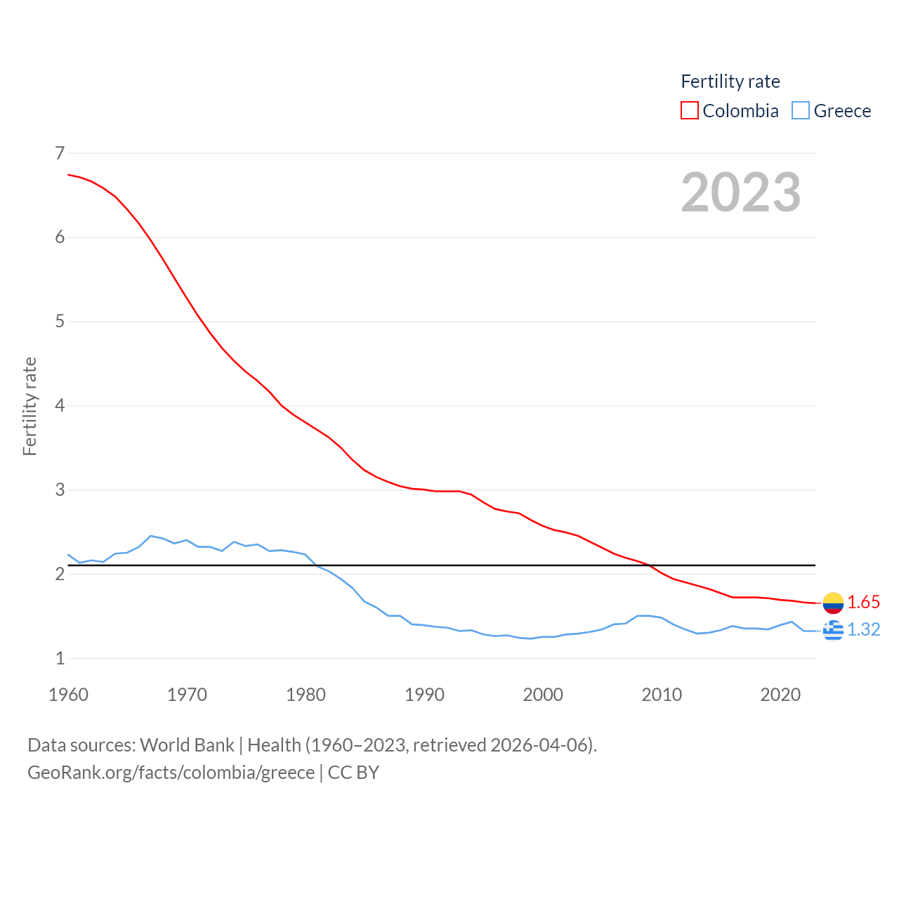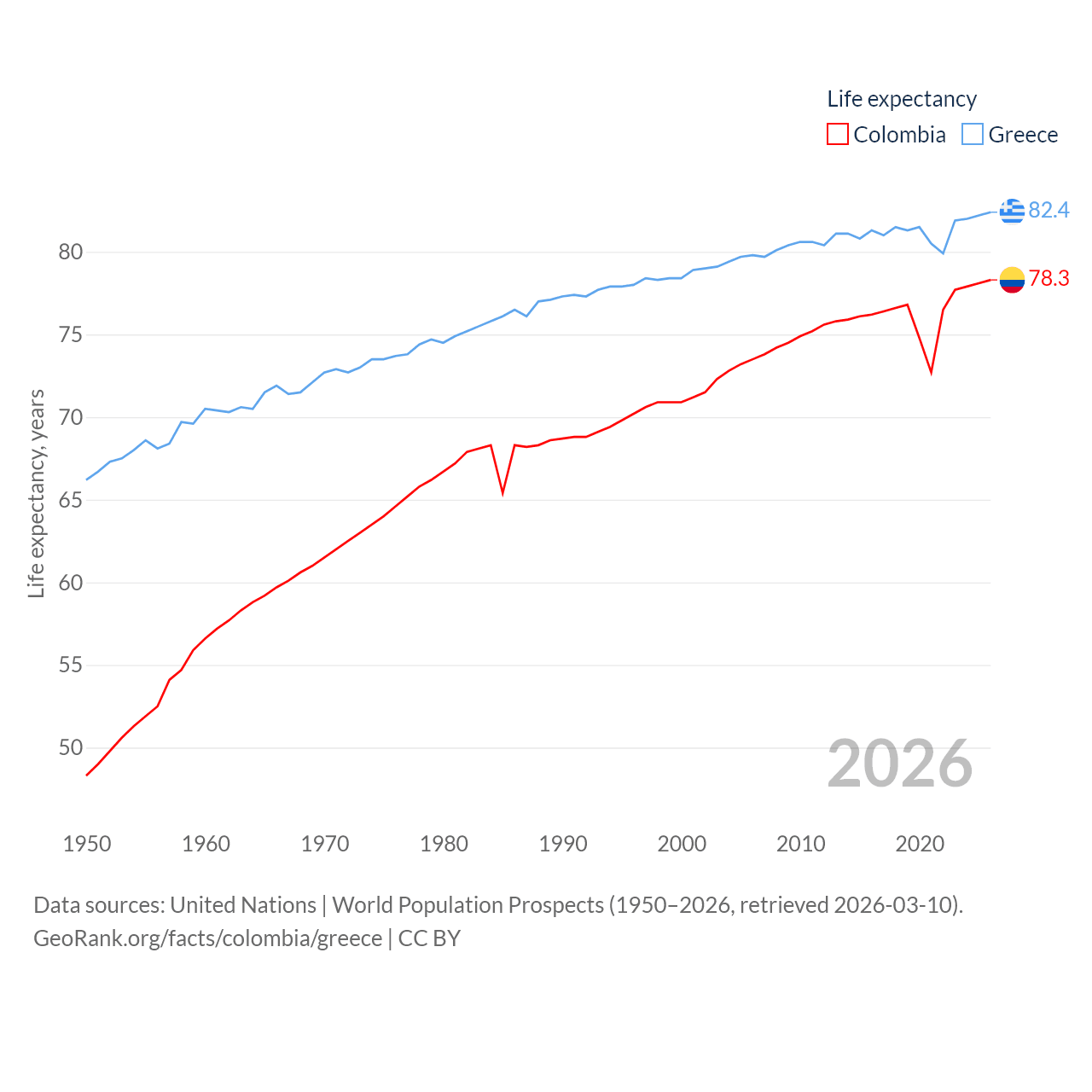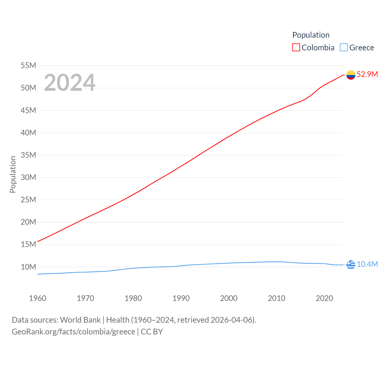 Colombia has a population of 52.9M (ranked 28/197), compared with 10.4M in Greece (ranked 94/197). Colombia's land area is 428,380 sq mi versus 49,769 sq mi for Greece (ranked 26th vs. 95th).