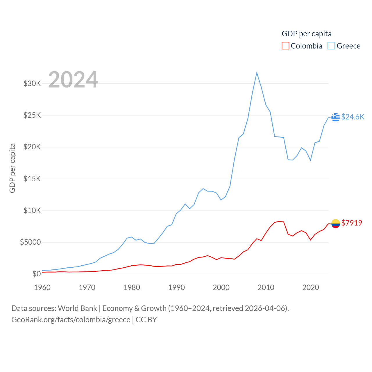 By GDP, Colombia ranks 39/197 ($419B) and Greece ranks 53/197 ($256B). By GDP per capita, Colombia ranks 94/197 ($7,919), while Greece ranks 49/197 ($24,626).