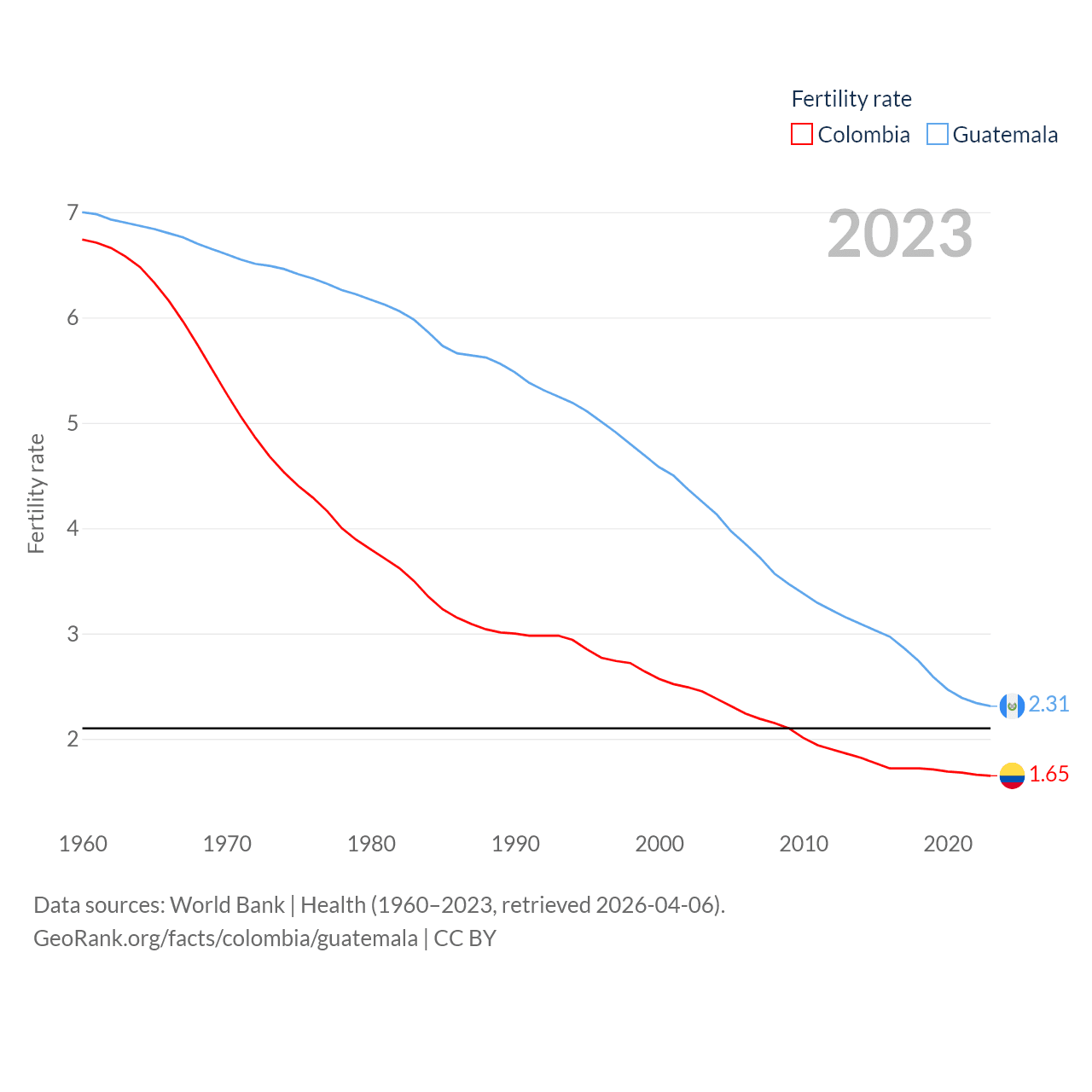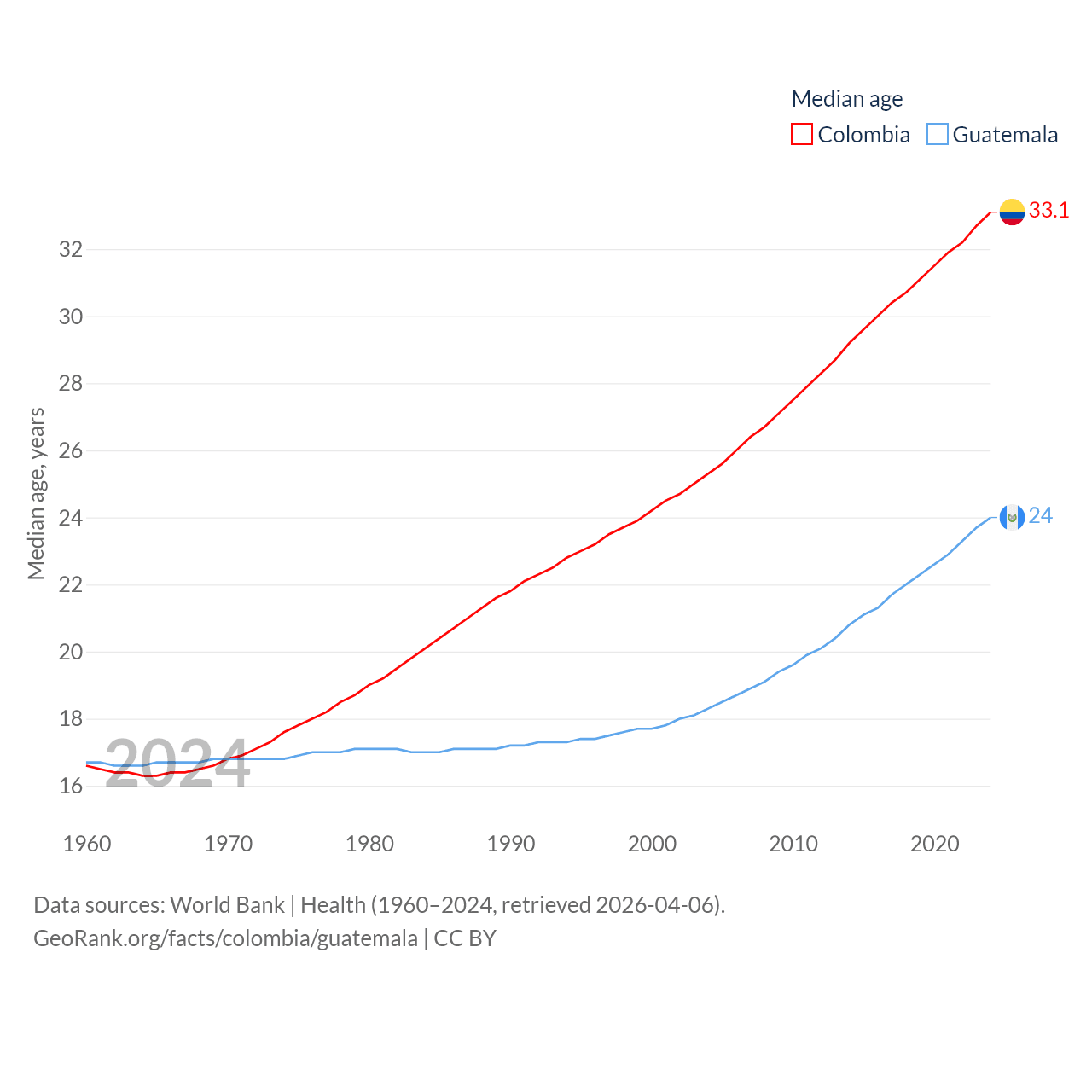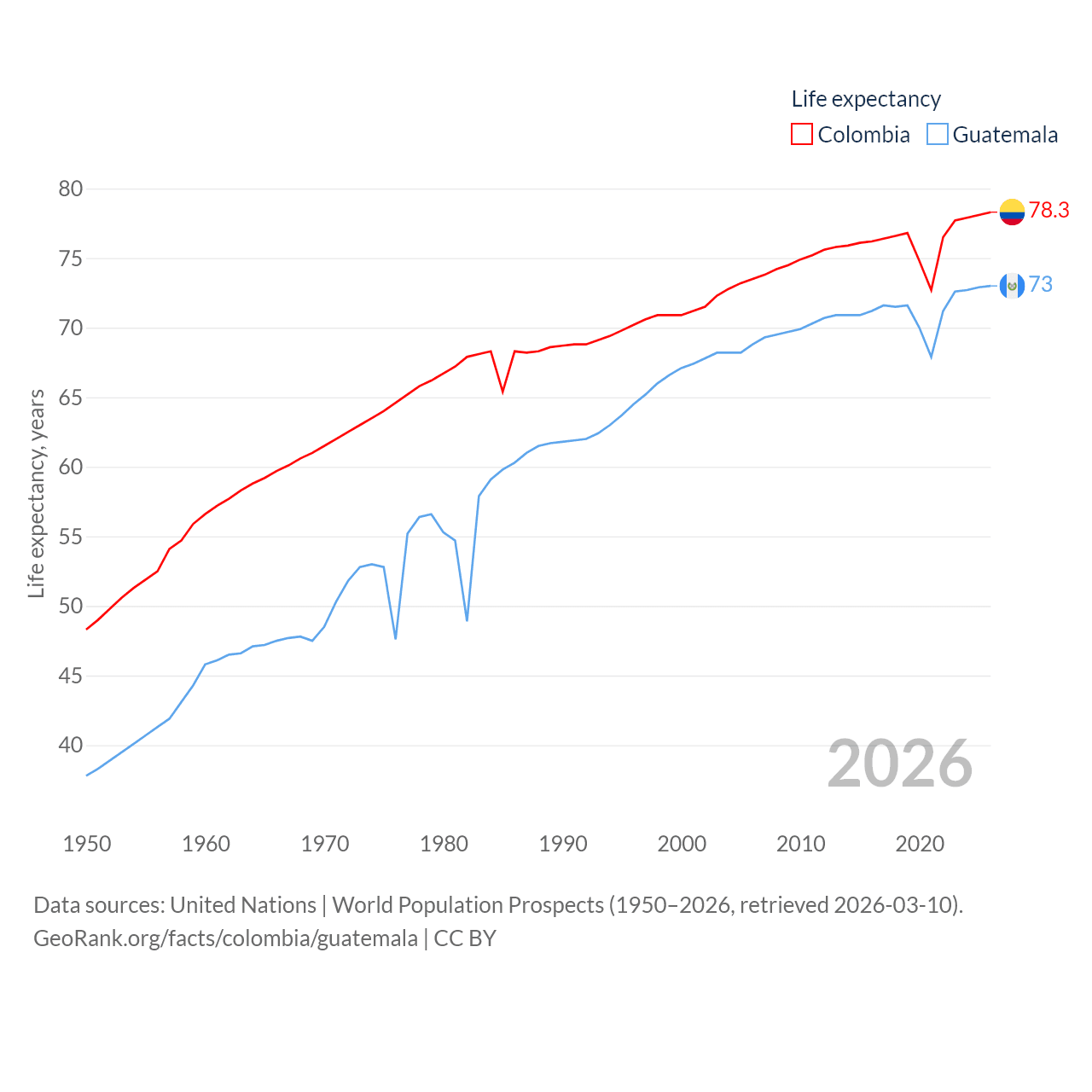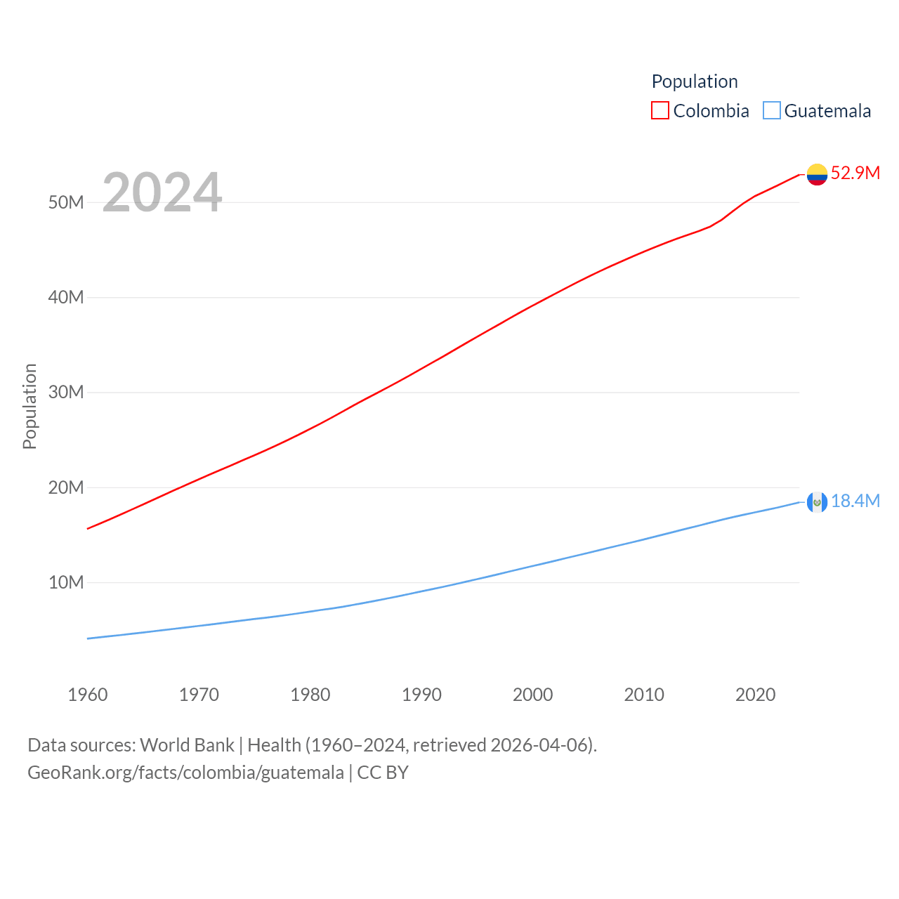 Colombia has a population of 52.9M (ranked 28/197), compared with 18.4M in Guatemala (ranked 70/197). Colombia's land area is 428,380 sq mi versus 41,375 sq mi for Guatemala (ranked 26th vs. 102nd).