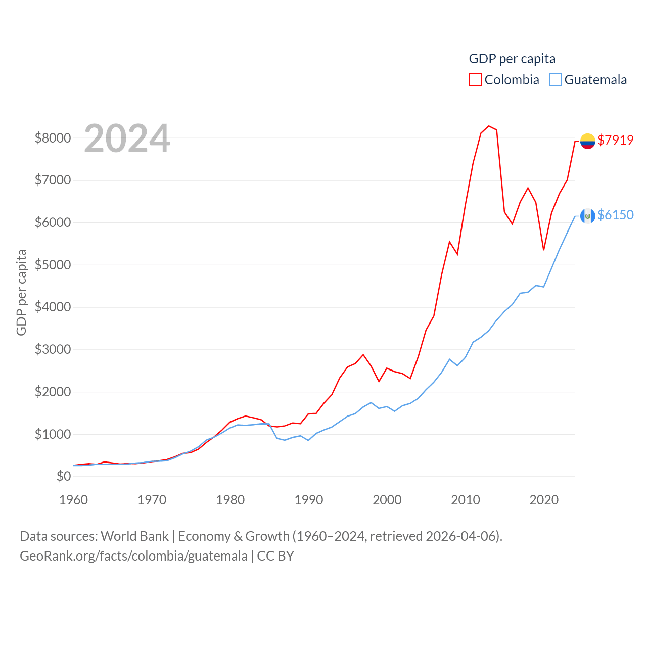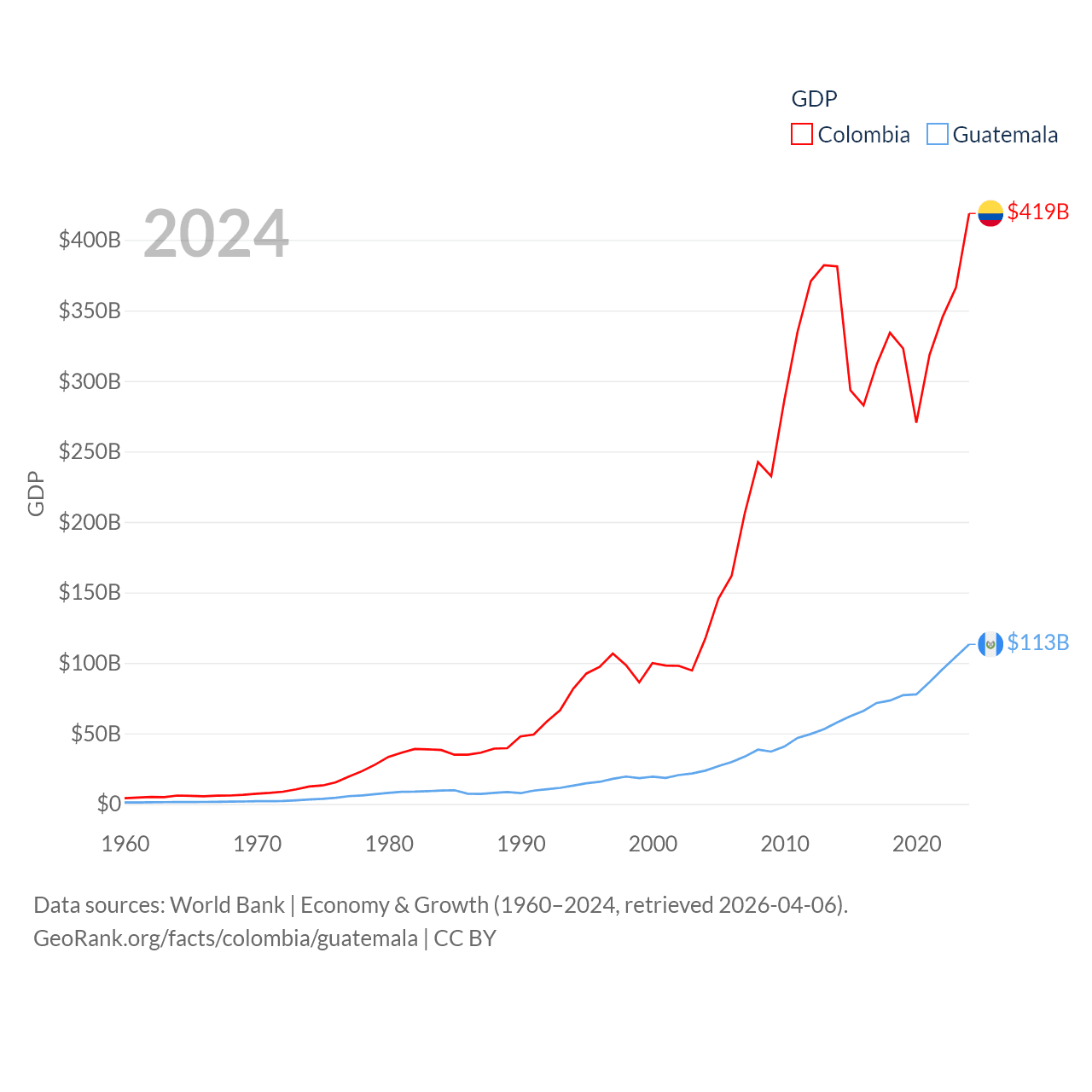 By GDP, Colombia ranks 39/197 ($419B) and Guatemala ranks 68/197 ($113B). By GDP per capita, Colombia ranks 94/197 ($7,919), while Guatemala ranks 112/197 ($6,150).