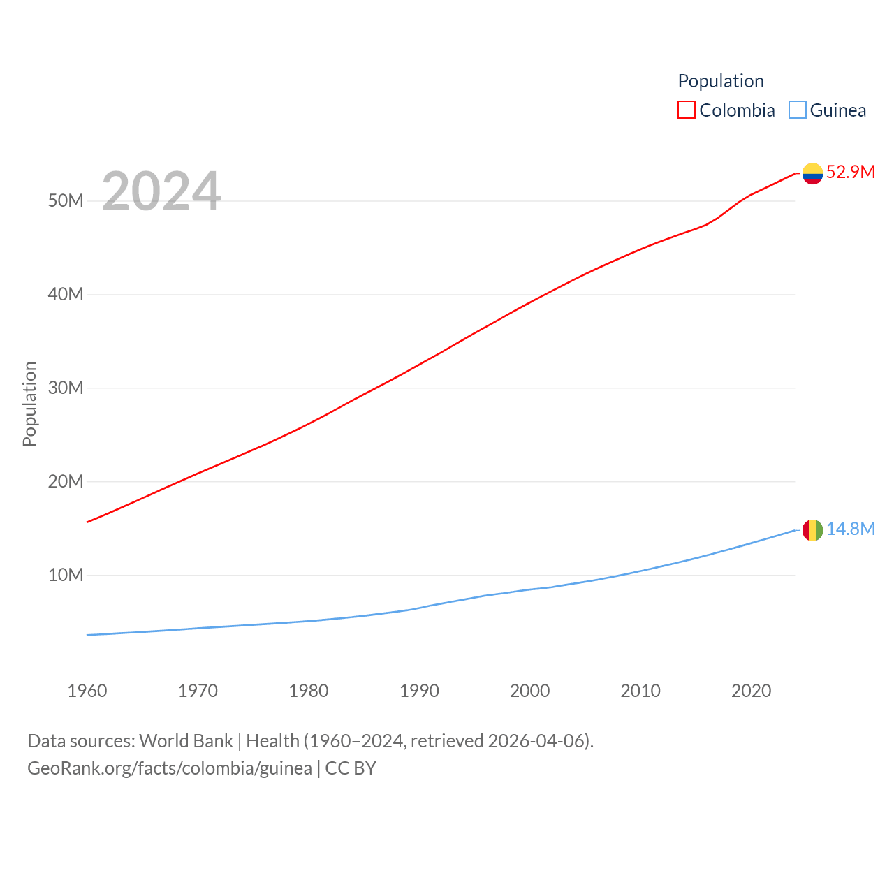 Colombia has a population of 52.9M (ranked 28/197), compared with 14.8M in Guinea (ranked 75/197). Colombia's land area is 428,380 sq mi versus 94,873 sq mi for Guinea (ranked 26th vs. 77th).