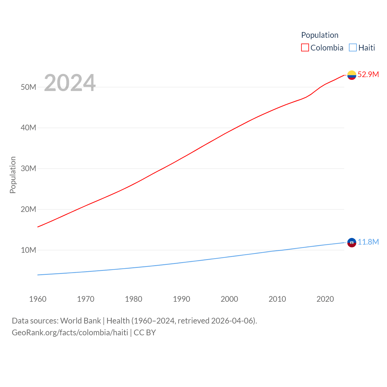 Colombia has a population of 52.9M (ranked 28/197), compared with 11.8M in Haiti (ranked 83/197). Colombia's land area is 428,380 sq mi versus 10,641 sq mi for Haiti (ranked 26th vs. 142nd).
