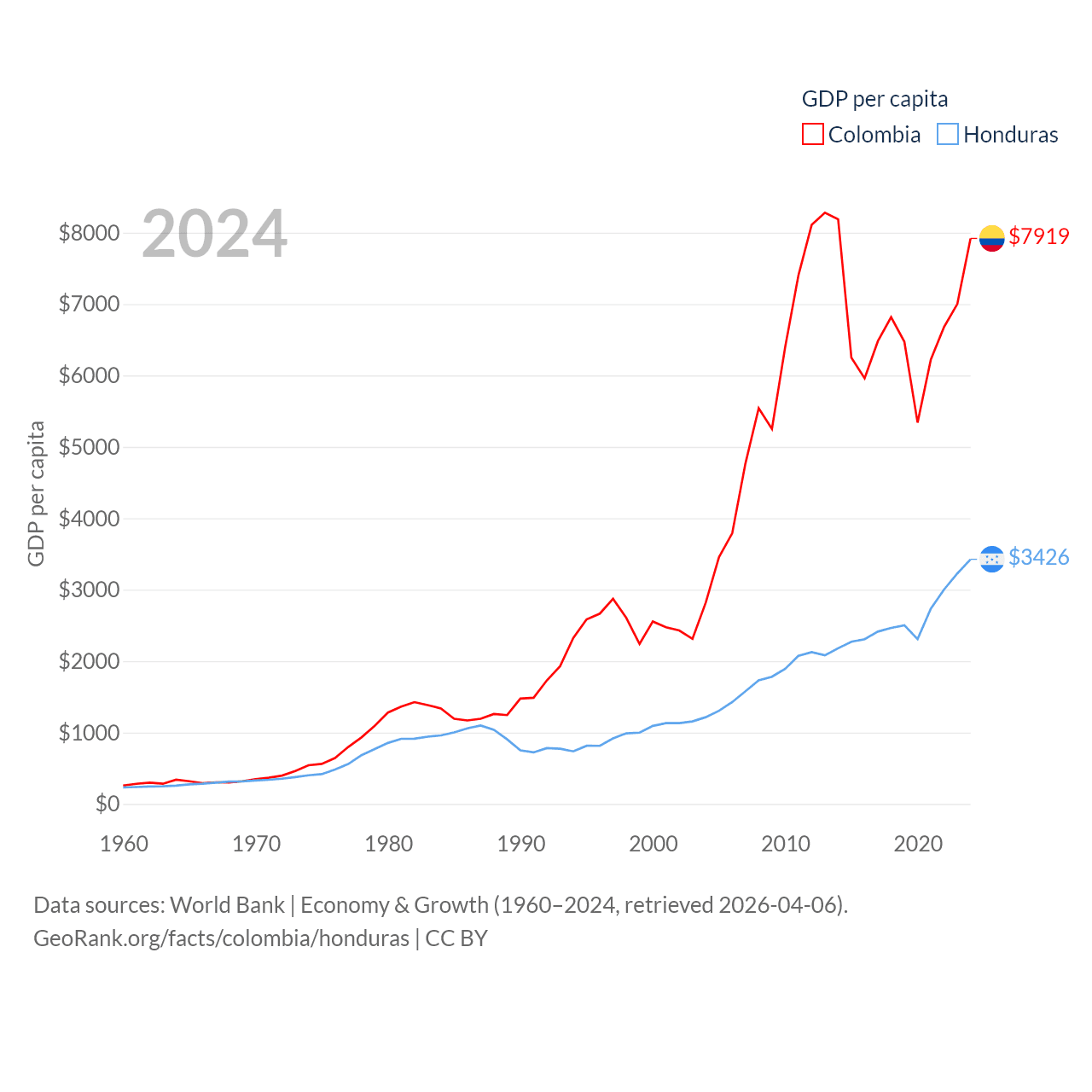 By GDP, Colombia ranks 39/197 ($419B) and Honduras ranks 104/197 ($37.1B). By GDP per capita, Colombia ranks 94/197 ($7,919), while Honduras ranks 136/197 ($3,426).