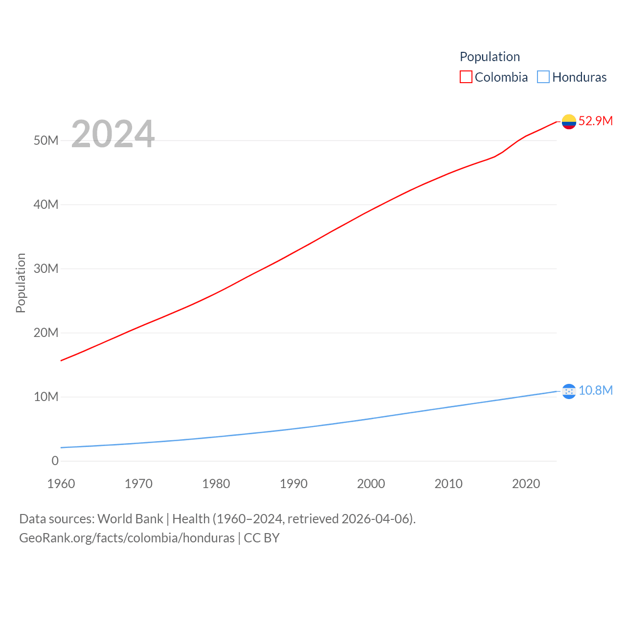 Colombia has a population of 52.9M (ranked 28/197), compared with 10.8M in Honduras (ranked 89/197). Colombia's land area is 428,380 sq mi versus 43,201 sq mi for Honduras (ranked 26th vs. 100th).