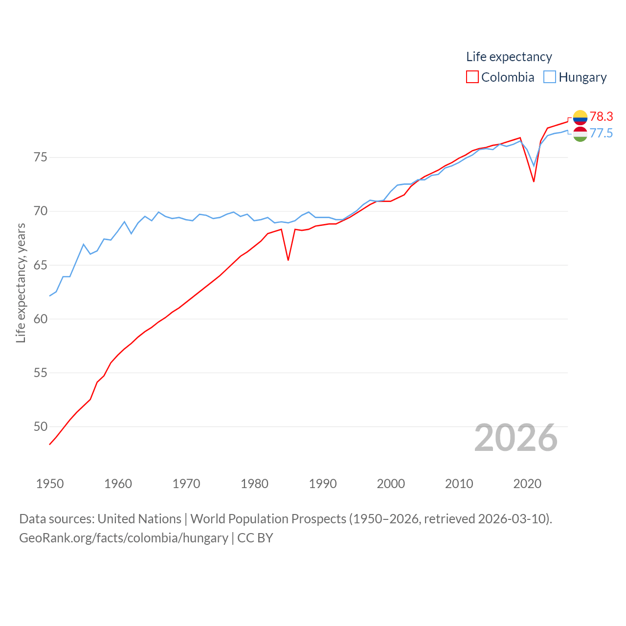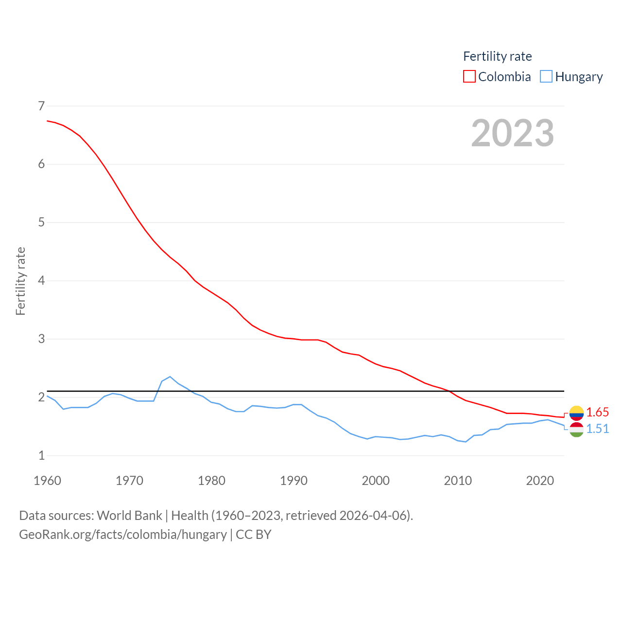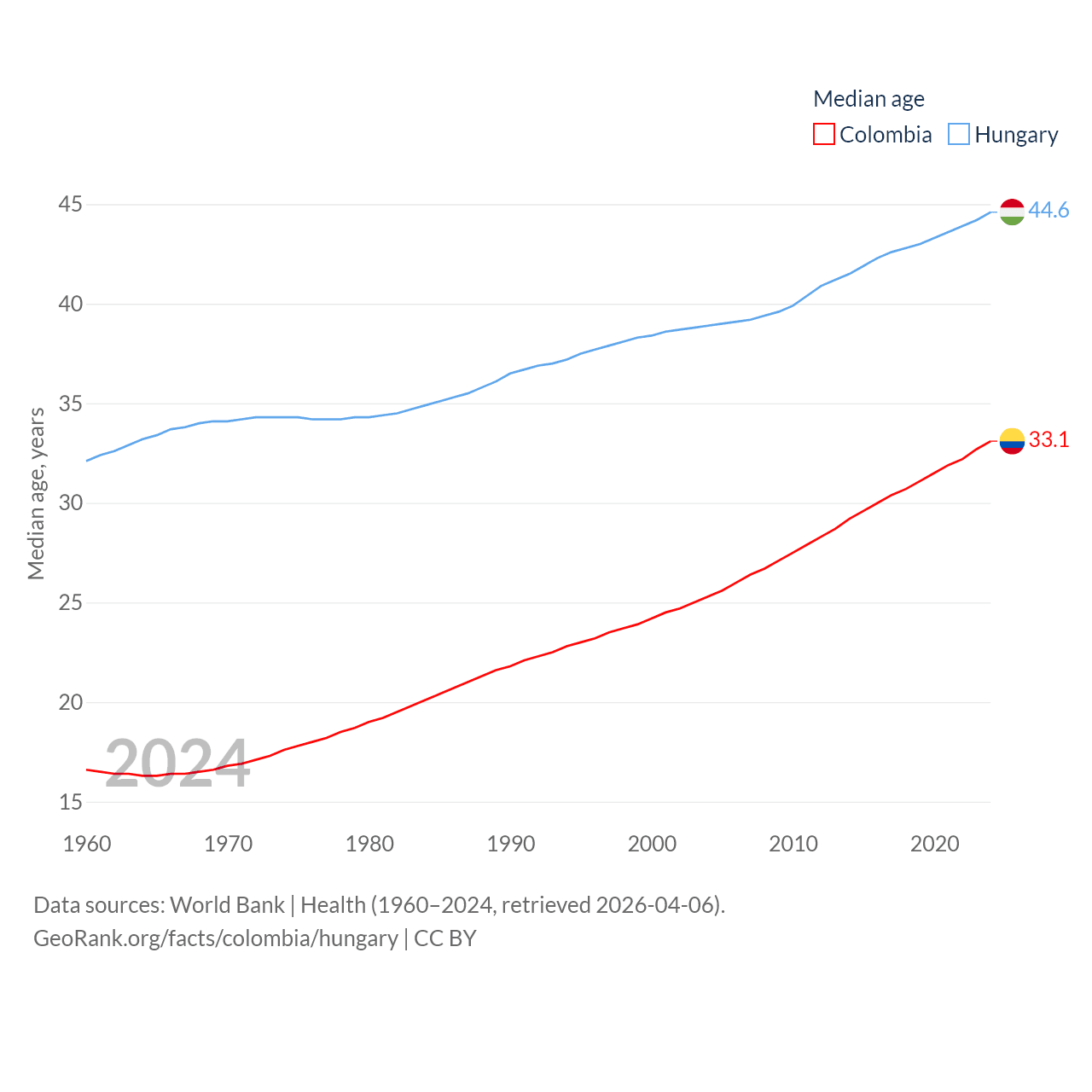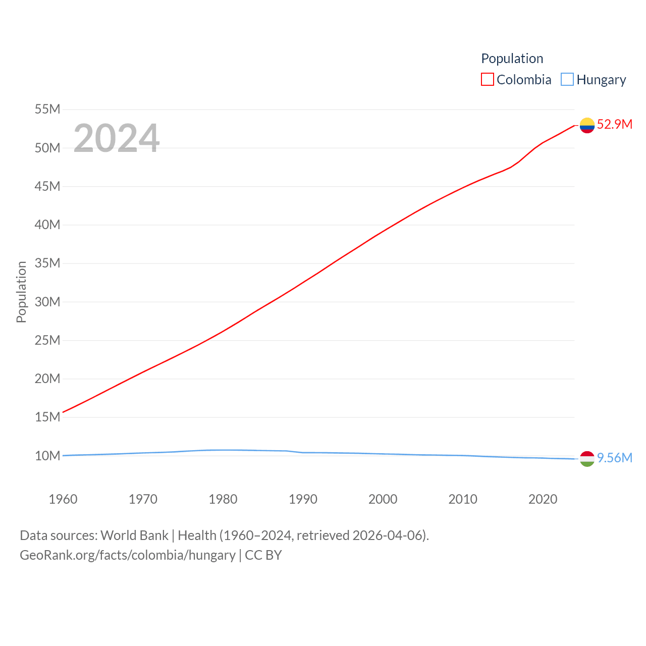 Colombia has a population of 52.9M (ranked 28/197), compared with 9.56M in Hungary (ranked 97/197). Colombia's land area is 428,380 sq mi versus 35,236 sq mi for Hungary (ranked 26th vs. 109th).