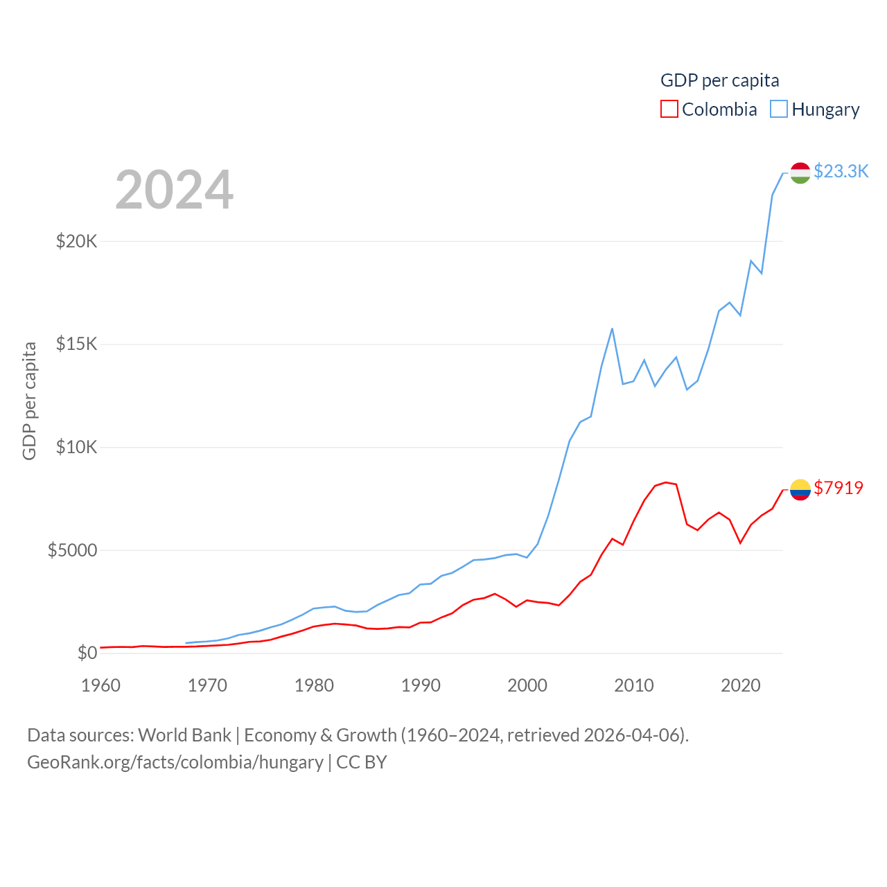 By GDP, Colombia ranks 39/197 ($419B) and Hungary ranks 55/197 ($223B). By GDP per capita, Colombia ranks 94/197 ($7,919), while Hungary ranks 55/197 ($23,292).