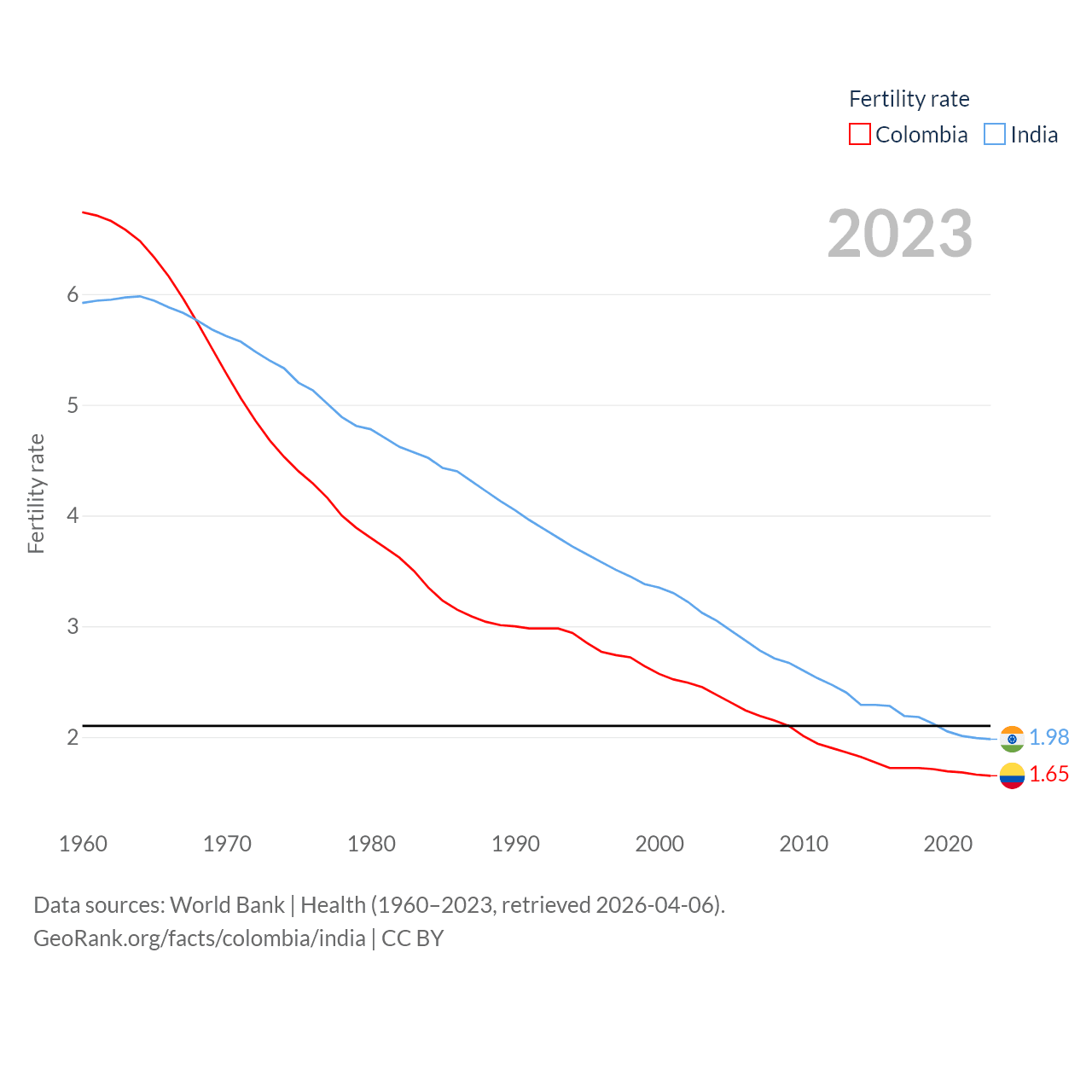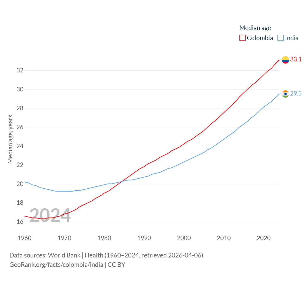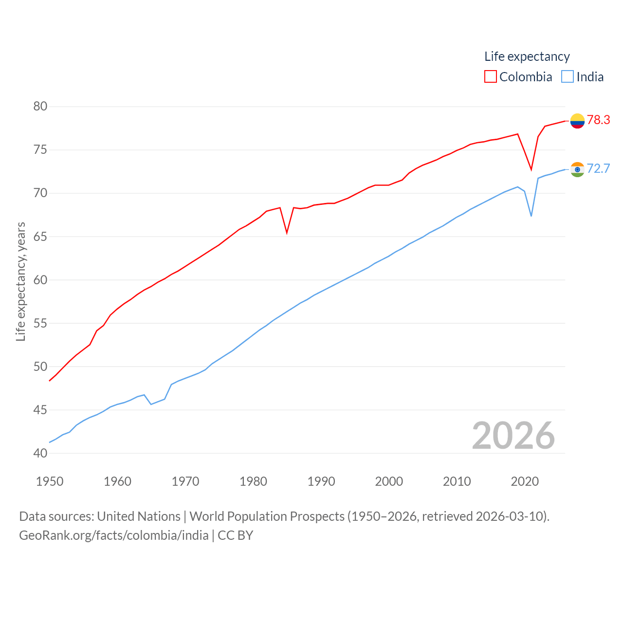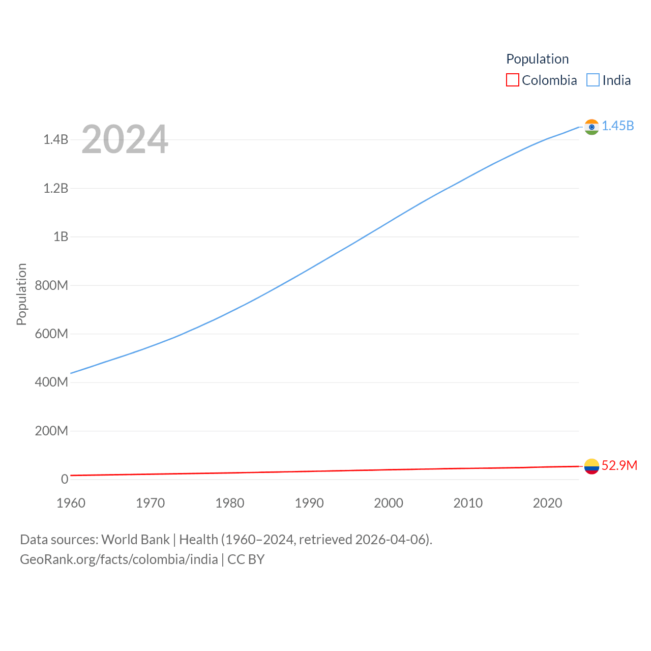 Colombia has a population of 52.9M (ranked 28/197), compared with 1.45B in India (ranked 1/197). Colombia's land area is 428,380 sq mi versus 1,147,955 sq mi for India (ranked 26th vs. 7th).