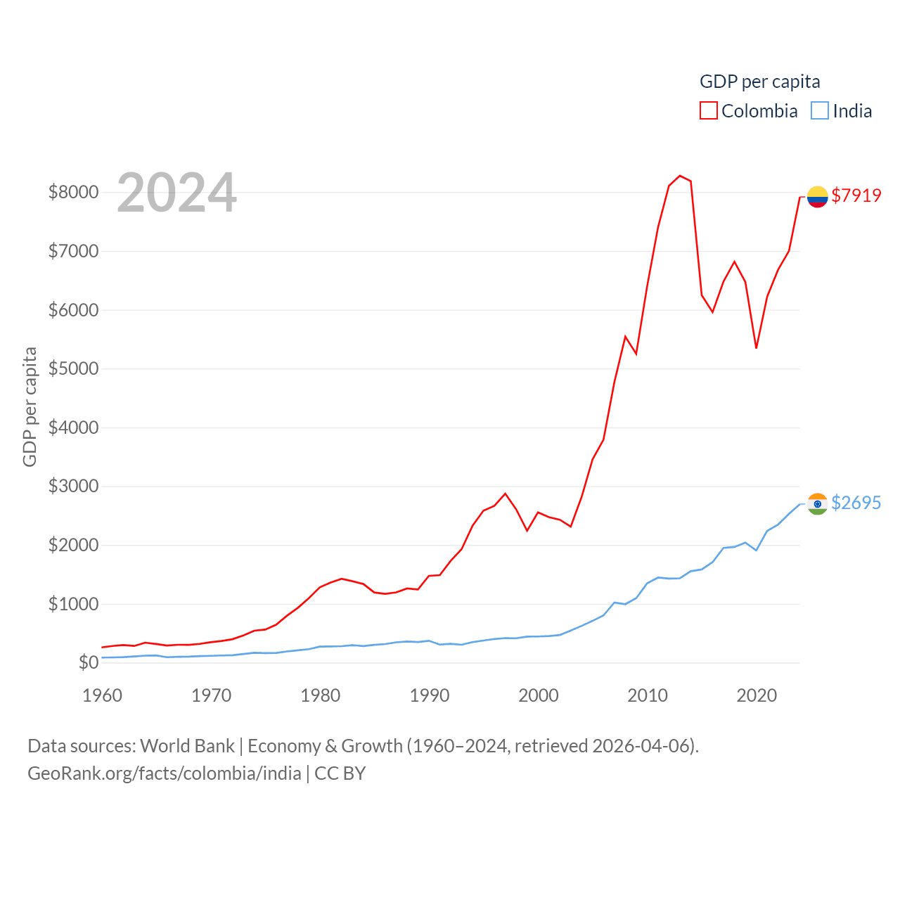 By GDP, Colombia ranks 39/197 ($419B) and India ranks 5/197 ($3.91T). By GDP per capita, Colombia ranks 94/197 ($7,919), while India ranks 143/197 ($2,695).