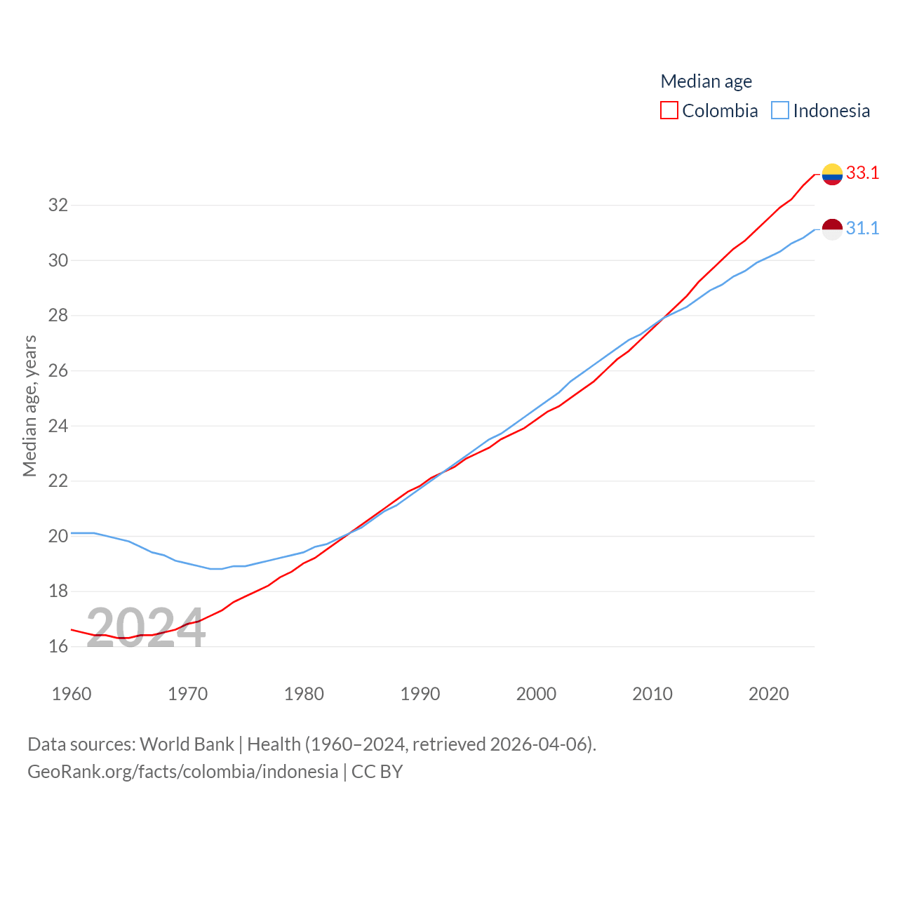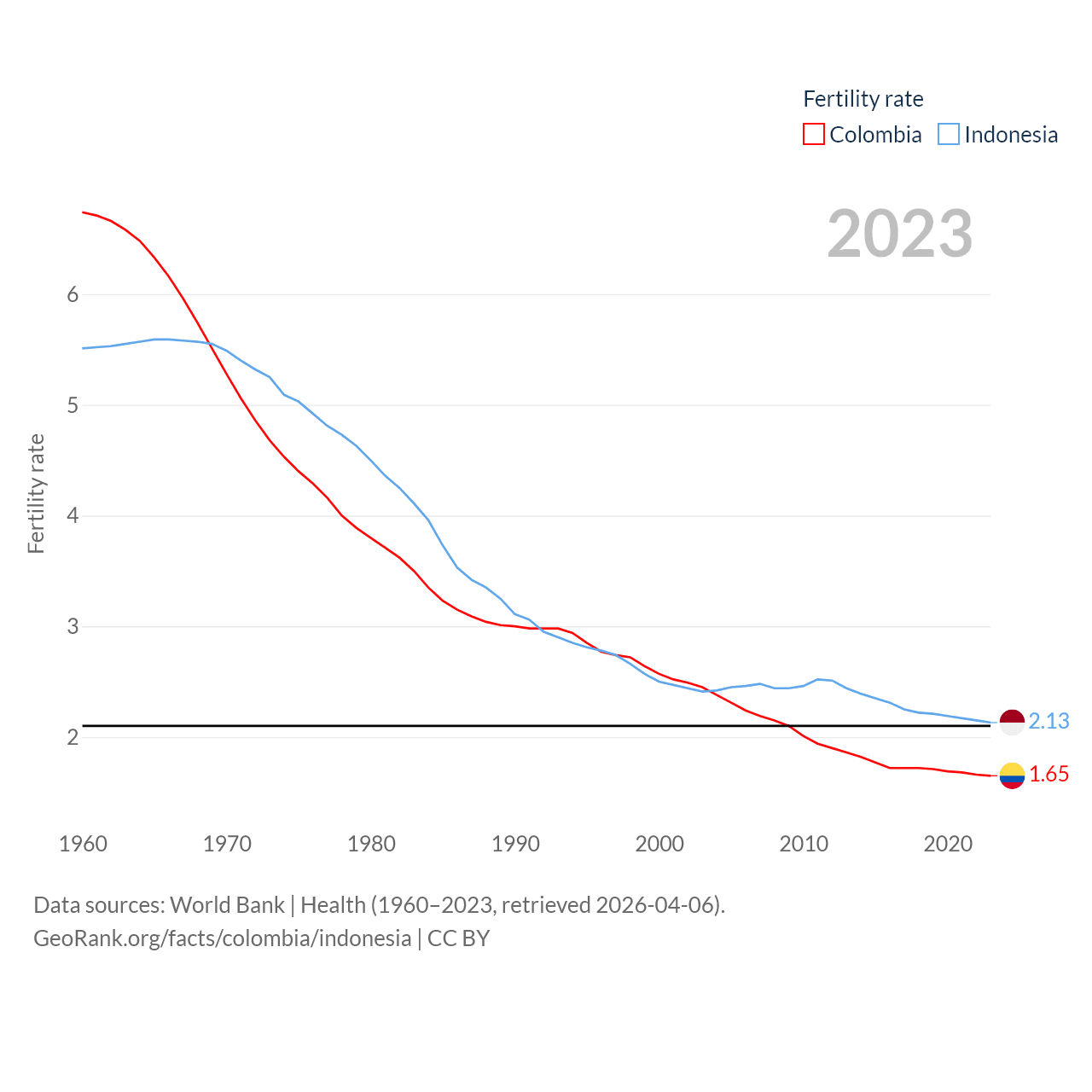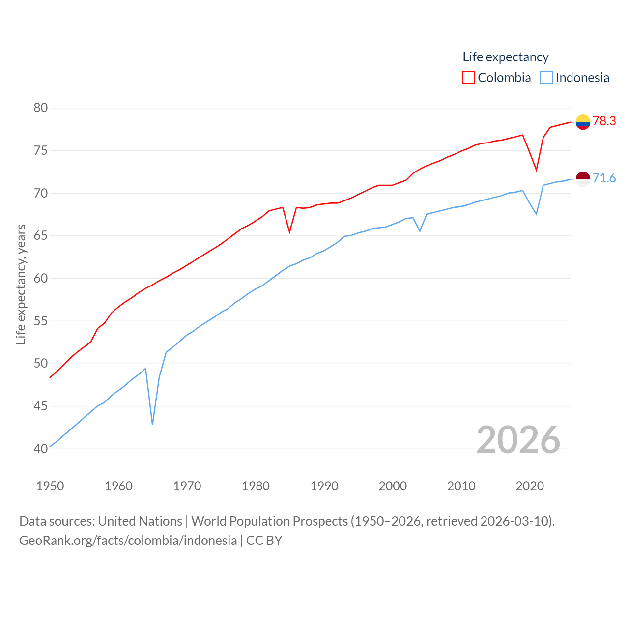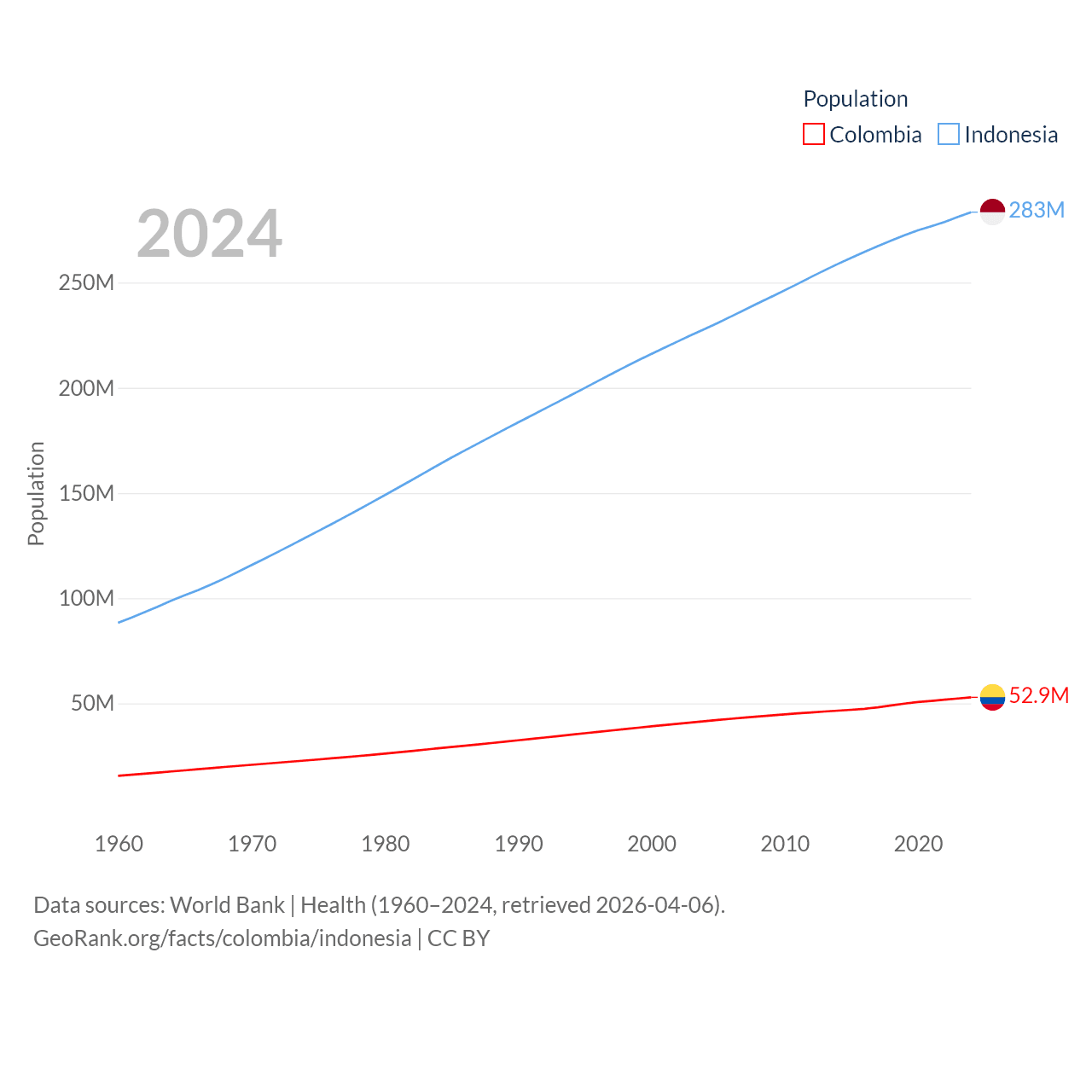 Colombia has a population of 52.9M (ranked 28/197), compared with 283M in Indonesia (ranked 4/197). Colombia's land area is 428,380 sq mi versus 730,720 sq mi for Indonesia (ranked 26th vs. 14th).