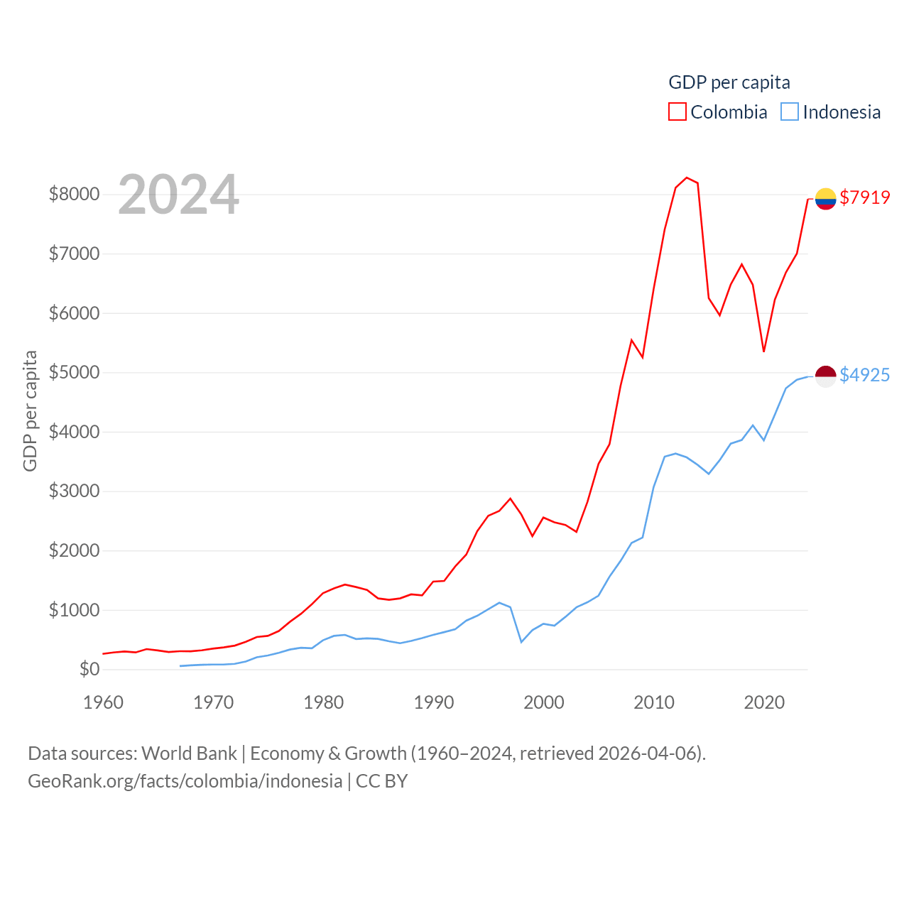 By GDP, Colombia ranks 39/197 ($419B) and Indonesia ranks 16/197 ($1.4T). By GDP per capita, Colombia ranks 94/197 ($7,919), while Indonesia ranks 121/197 ($4,925).