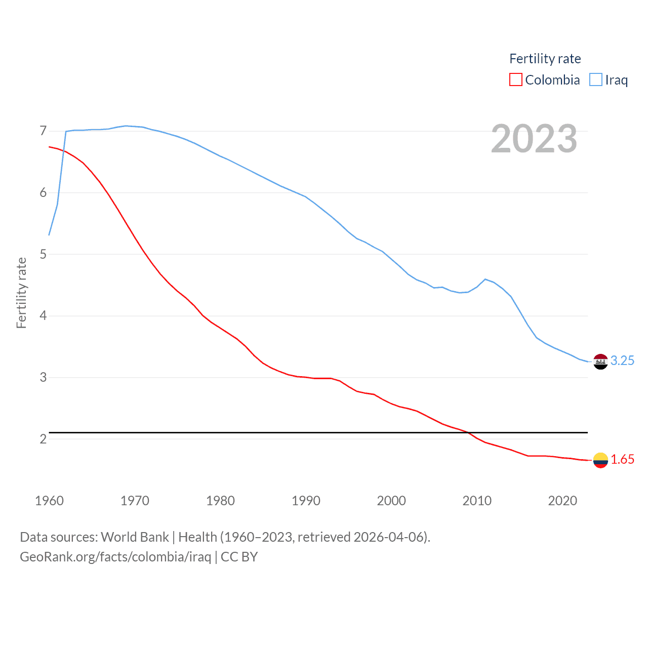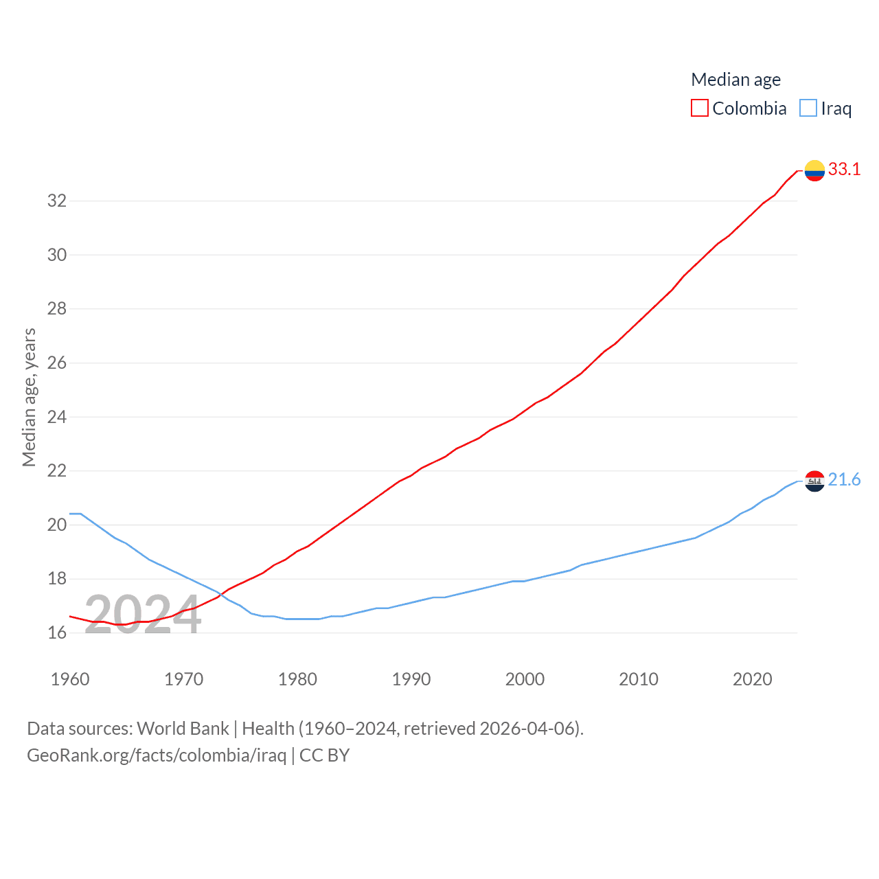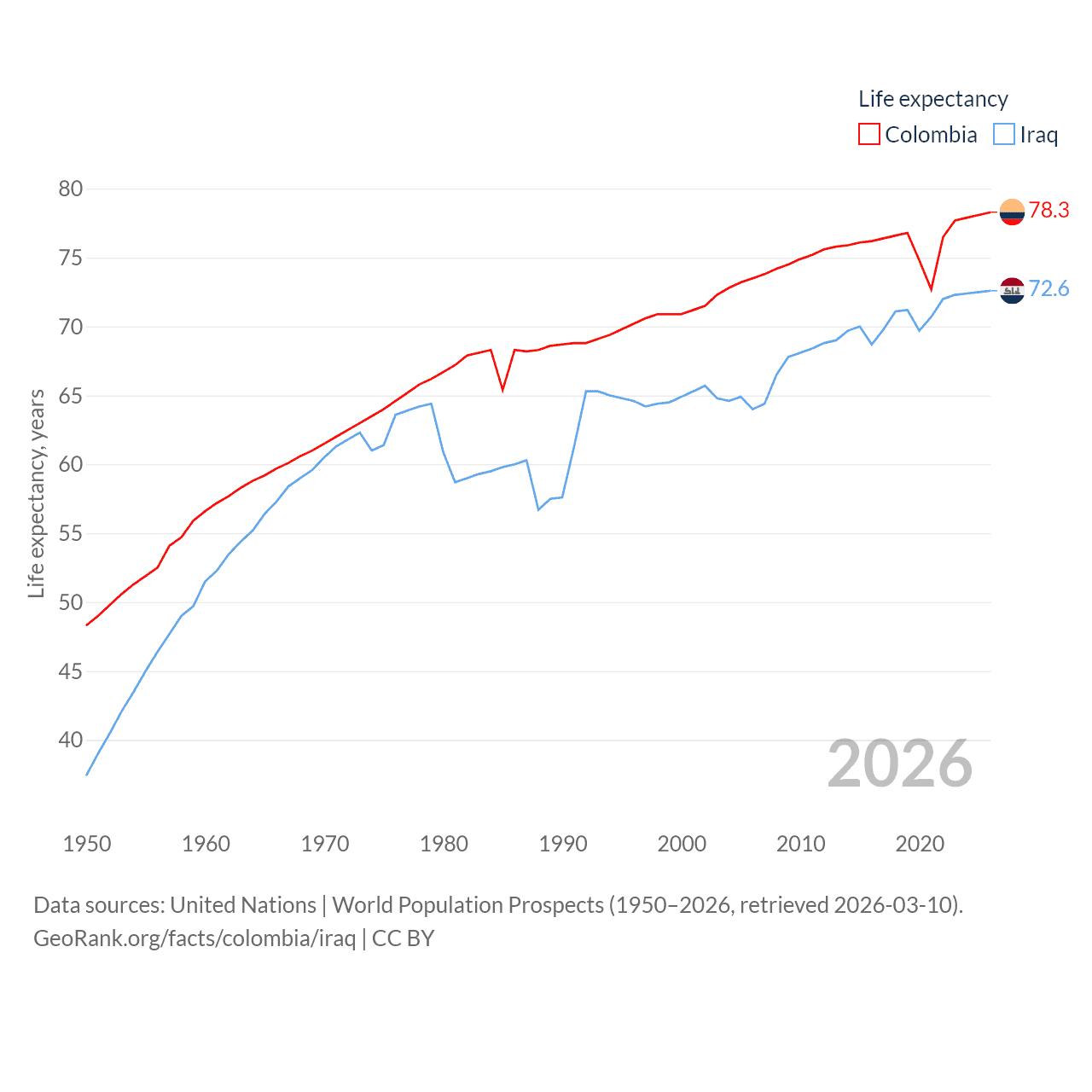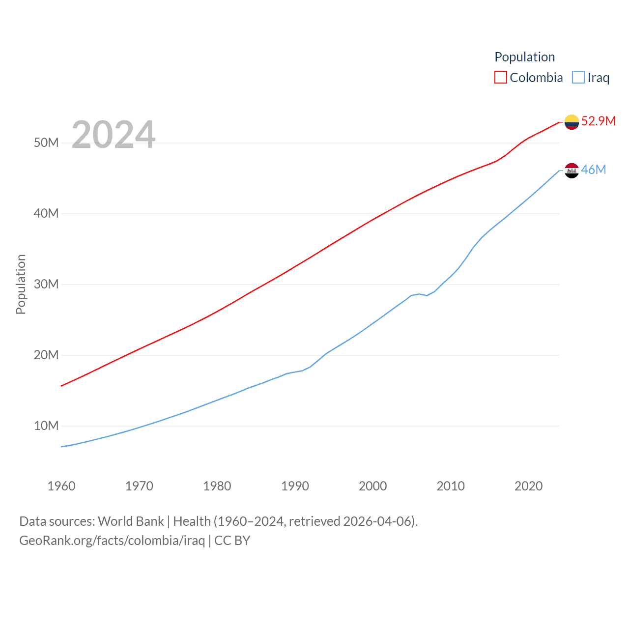 Colombia has a population of 52.9M (ranked 28/197), compared with 46M in Iraq (ranked 34/197). Colombia's land area is 428,380 sq mi versus 167,619 sq mi for Iraq (ranked 26th vs. 57th).