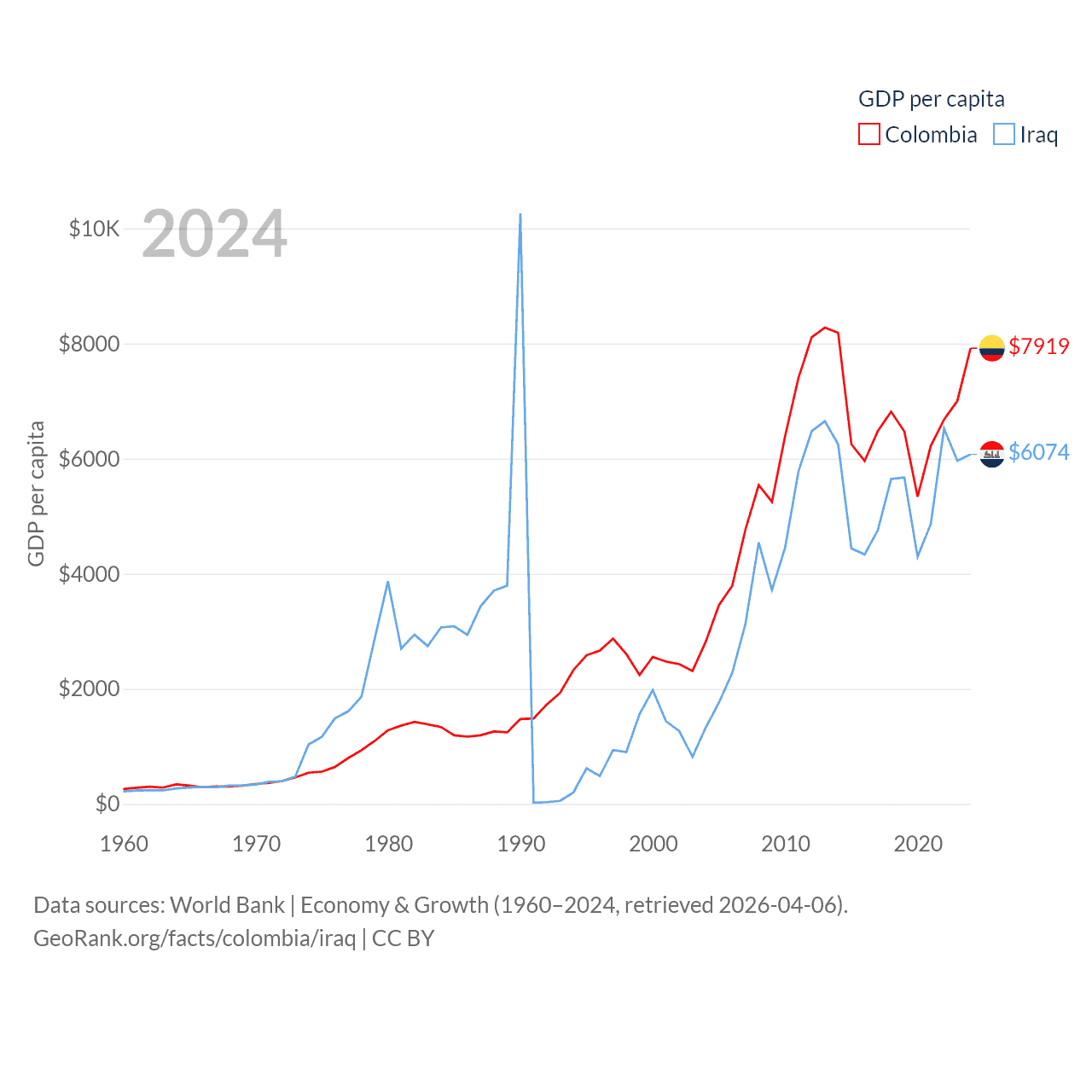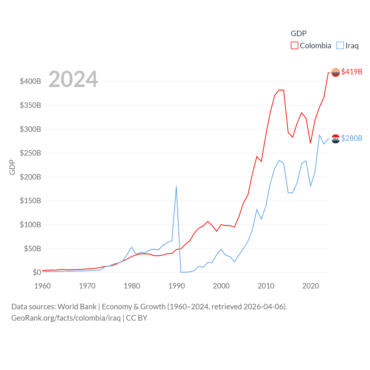 By GDP, Colombia ranks 39/197 ($419B) and Iraq ranks 50/197 ($280B). By GDP per capita, Colombia ranks 94/197 ($7,919), while Iraq ranks 113/197 ($6,074).