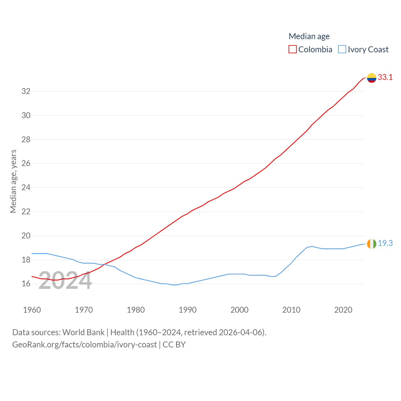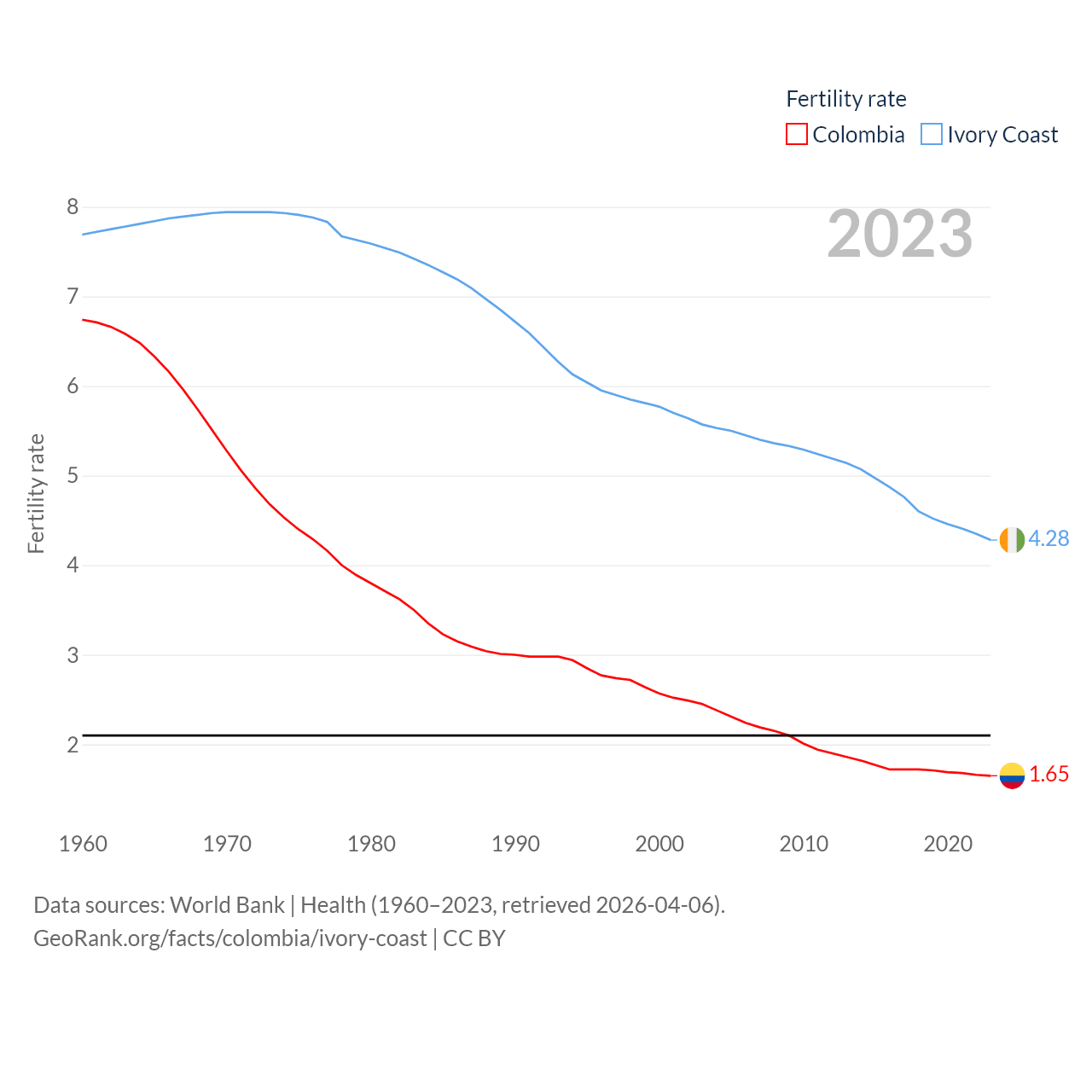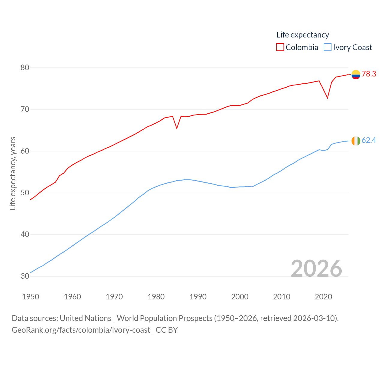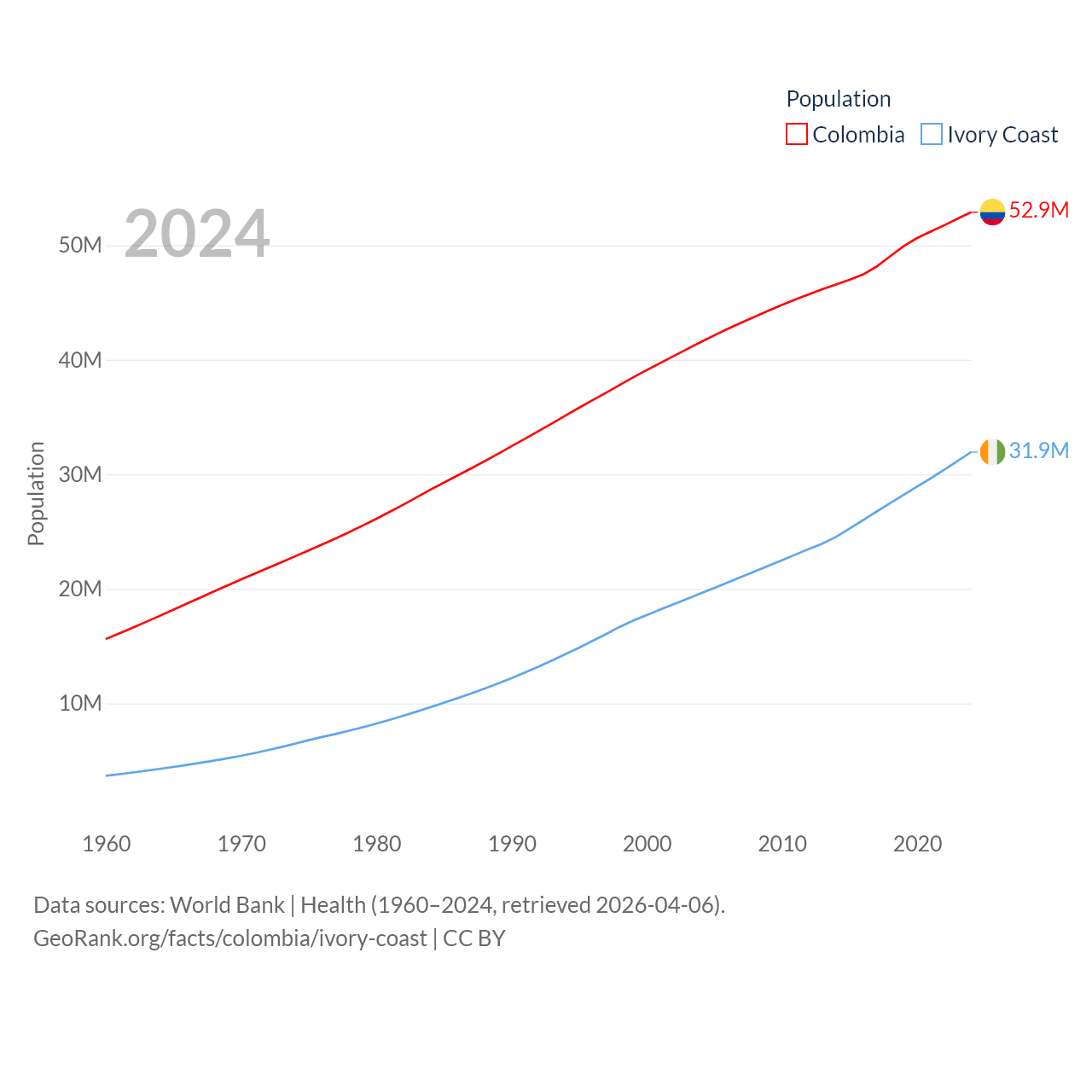 Colombia has a population of 52.9M (ranked 28/197), compared with 31.9M in Ivory Coast (ranked 50/197). Colombia's land area is 428,380 sq mi versus 122,780 sq mi for Ivory Coast (ranked 26th vs. 66th).
