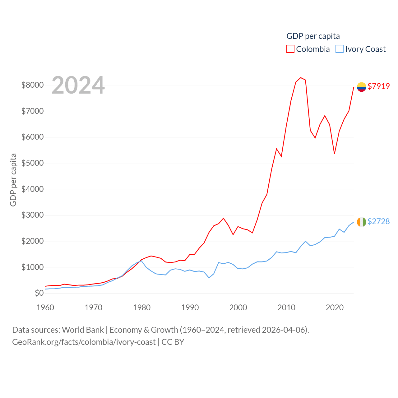 By GDP, Colombia ranks 39/197 ($419B) and Ivory Coast ranks 77/197 ($87.1B). By GDP per capita, Colombia ranks 94/197 ($7,919), while Ivory Coast ranks 142/197 ($2,728).