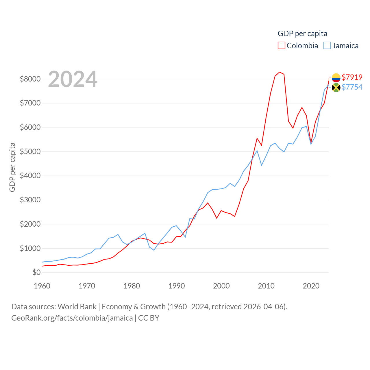 By GDP, Colombia ranks 39/197 ($419B) and Jamaica ranks 124/197 ($22B). By GDP per capita, Colombia ranks 94/197 ($7,919), while Jamaica ranks 95/197 ($7,754).