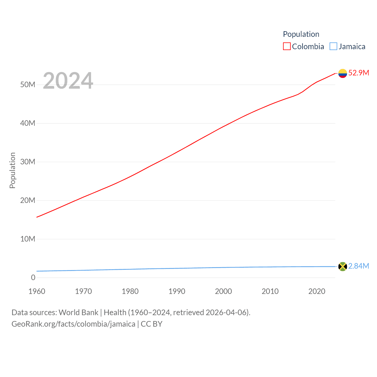 Colombia has a population of 52.9M (ranked 28/197), compared with 2.84M in Jamaica (ranked 139/197). Colombia's land area is 428,380 sq mi versus 4,181 sq mi for Jamaica (ranked 26th vs. 159th).