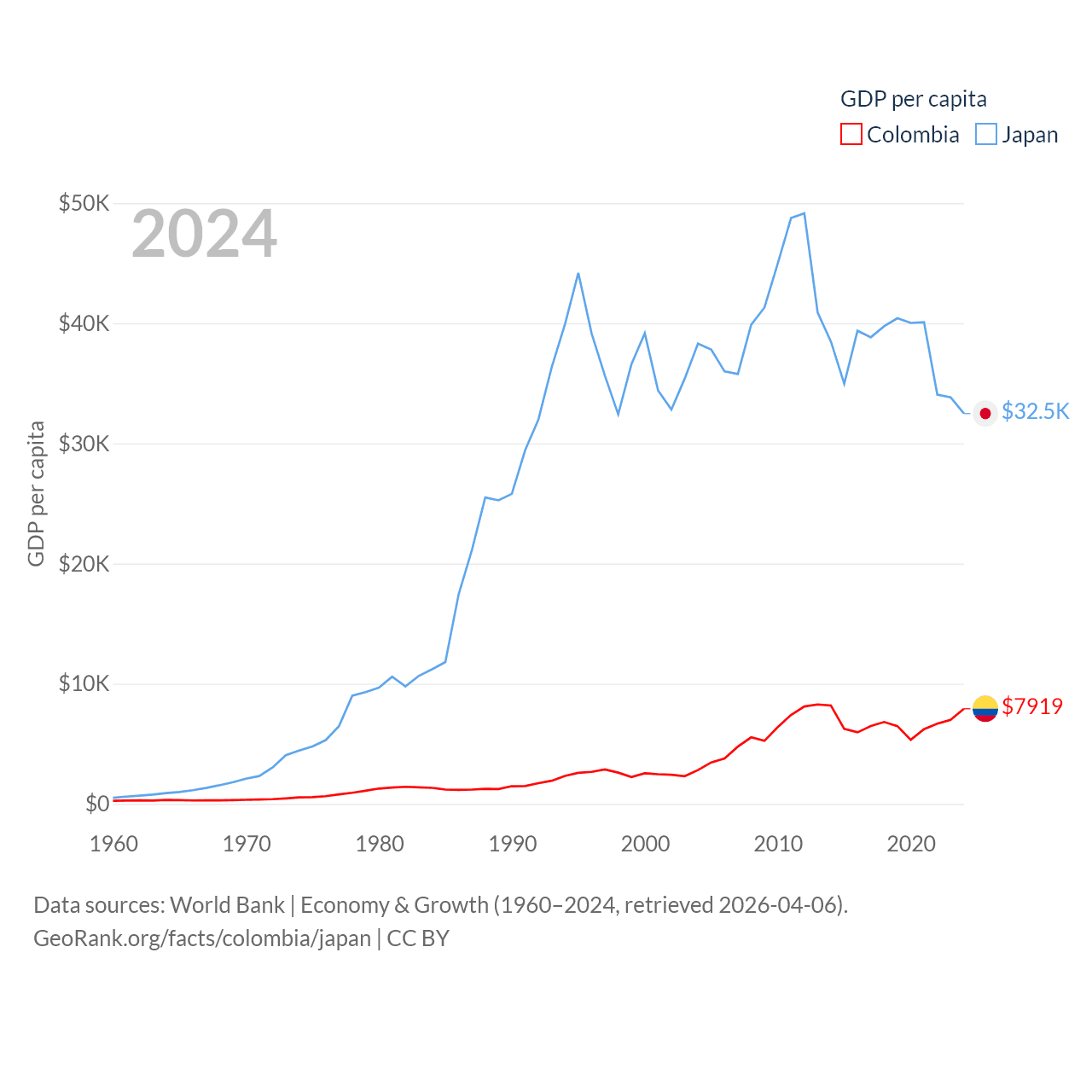 By GDP, Colombia ranks 39/197 ($419B) and Japan ranks 4/197 ($4.03T). By GDP per capita, Colombia ranks 94/197 ($7,919), while Japan ranks 38/197 ($32,487).
