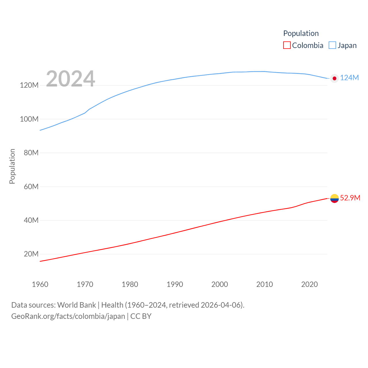 Colombia has a population of 52.9M (ranked 28/197), compared with 124M in Japan (ranked 12/197). Colombia's land area is 428,380 sq mi versus 140,761 sq mi for Japan (ranked 26th vs. 61st).