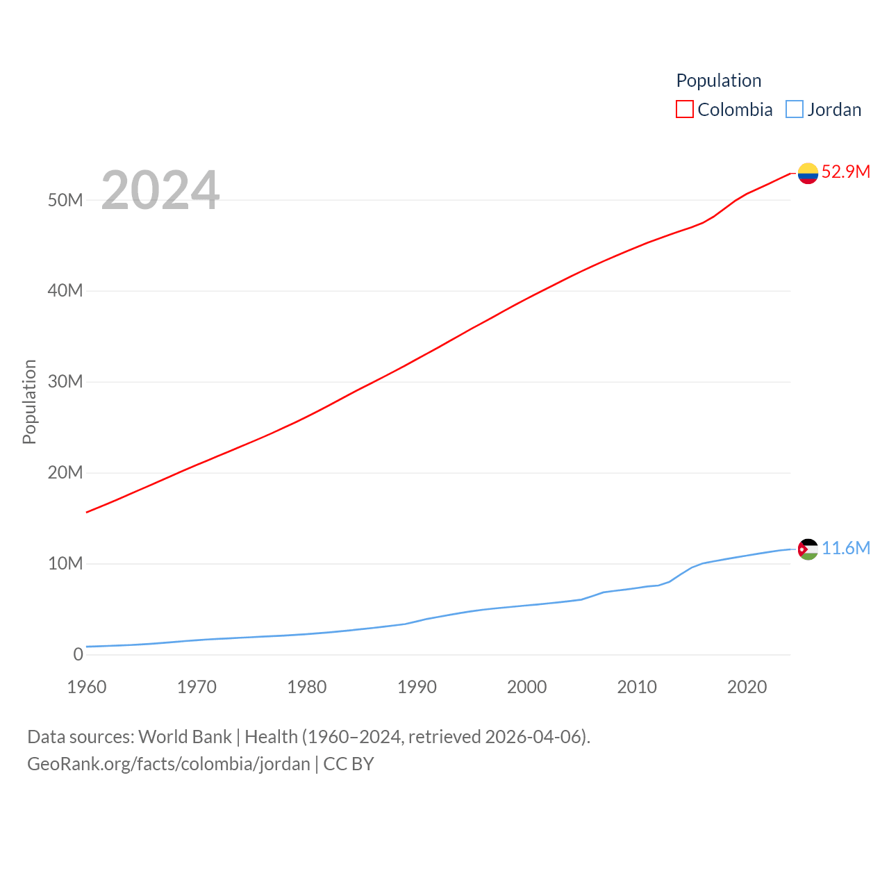 Colombia has a population of 52.9M (ranked 28/197), compared with 11.6M in Jordan (ranked 84/197). Colombia's land area is 428,380 sq mi versus 34,284 sq mi for Jordan (ranked 26th vs. 110th).