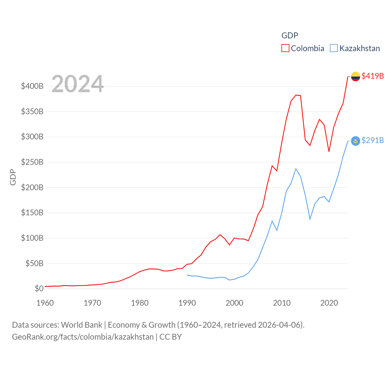 By GDP, Colombia ranks 39/197 ($419B) and Kazakhstan ranks 48/197 ($291B). By GDP per capita, Colombia ranks 94/197 ($7,919), while Kazakhstan ranks 71/197 ($14,155).