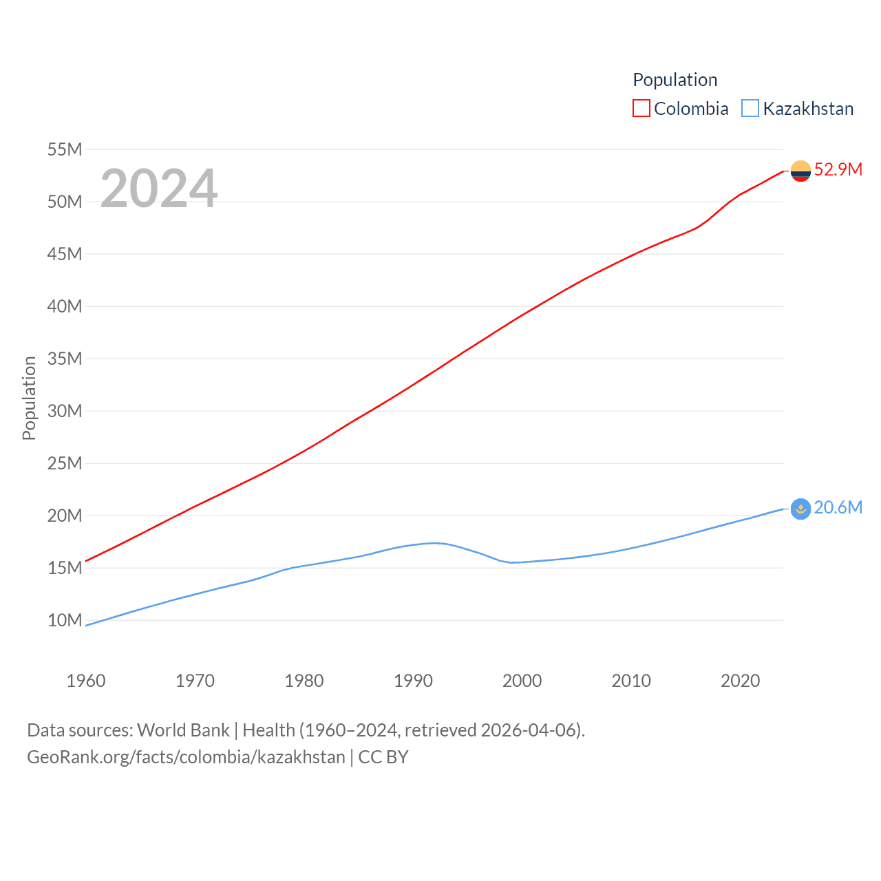 Colombia has a population of 52.9M (ranked 28/197), compared with 20.6M in Kazakhstan (ranked 64/197). Colombia's land area is 428,380 sq mi versus 1,042,360 sq mi for Kazakhstan (ranked 26th vs. 9th).
