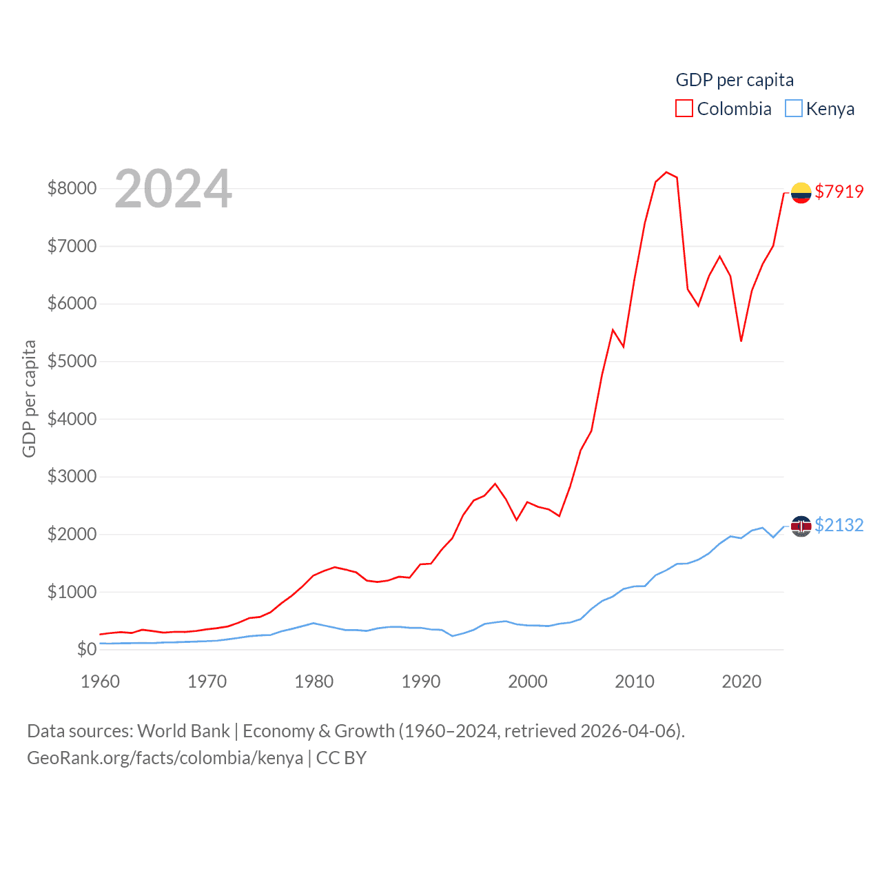 By GDP, Colombia ranks 39/197 ($419B) and Kenya ranks 64/197 ($120B). By GDP per capita, Colombia ranks 94/197 ($7,919), while Kenya ranks 154/197 ($2,132).