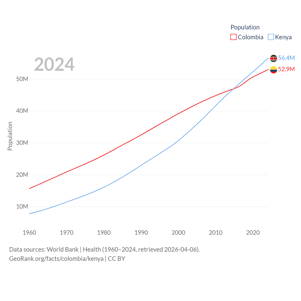 Colombia has a population of 52.9M (ranked 28/197), compared with 56.4M in Kenya (ranked 26/197). Colombia's land area is 428,380 sq mi versus 224,278 sq mi for Kenya (ranked 26th vs. 45th).
