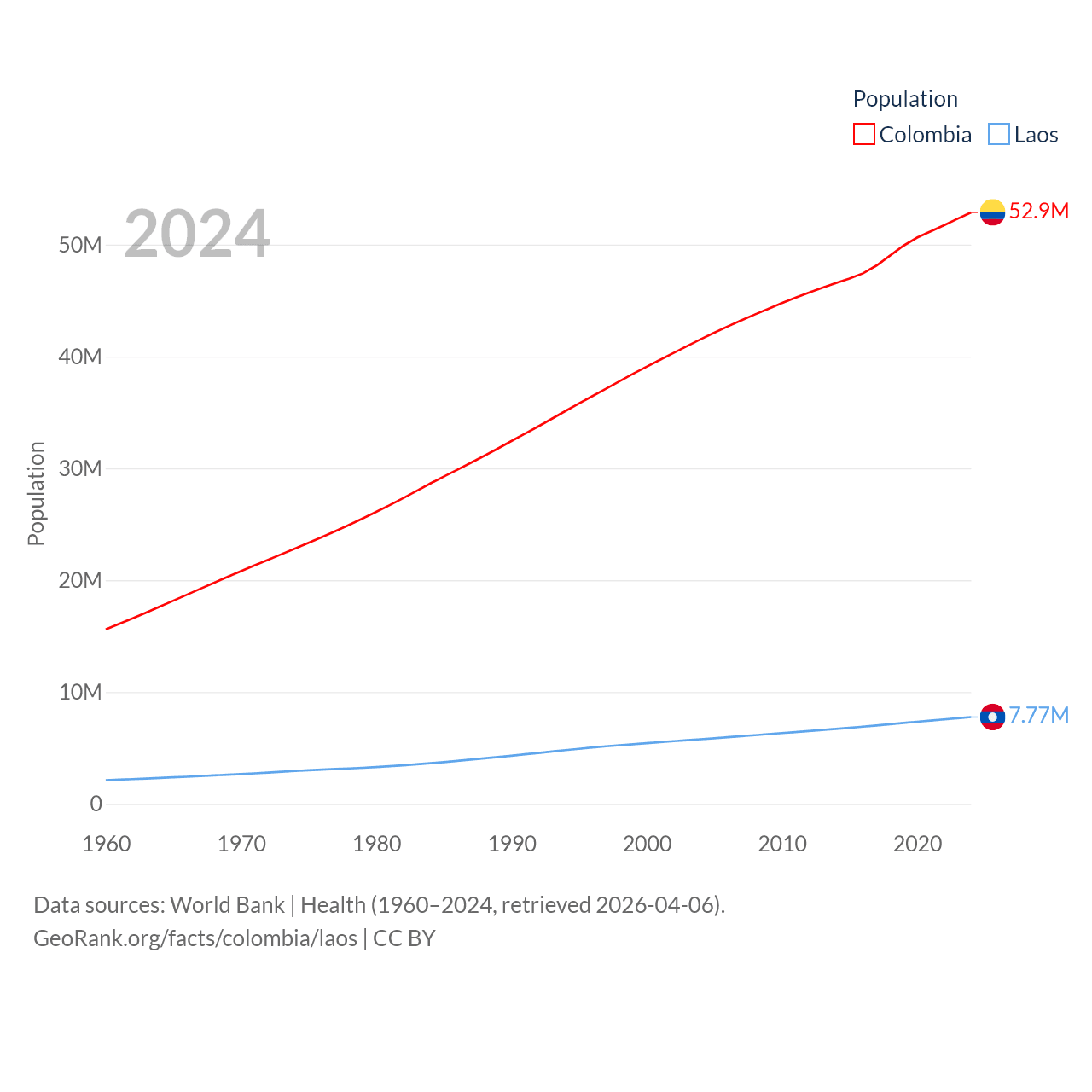 Colombia has a population of 52.9M (ranked 28/197), compared with 7.77M in Laos (ranked 103/197). Colombia's land area is 428,380 sq mi versus 89,112 sq mi for Laos (ranked 26th vs. 79th).