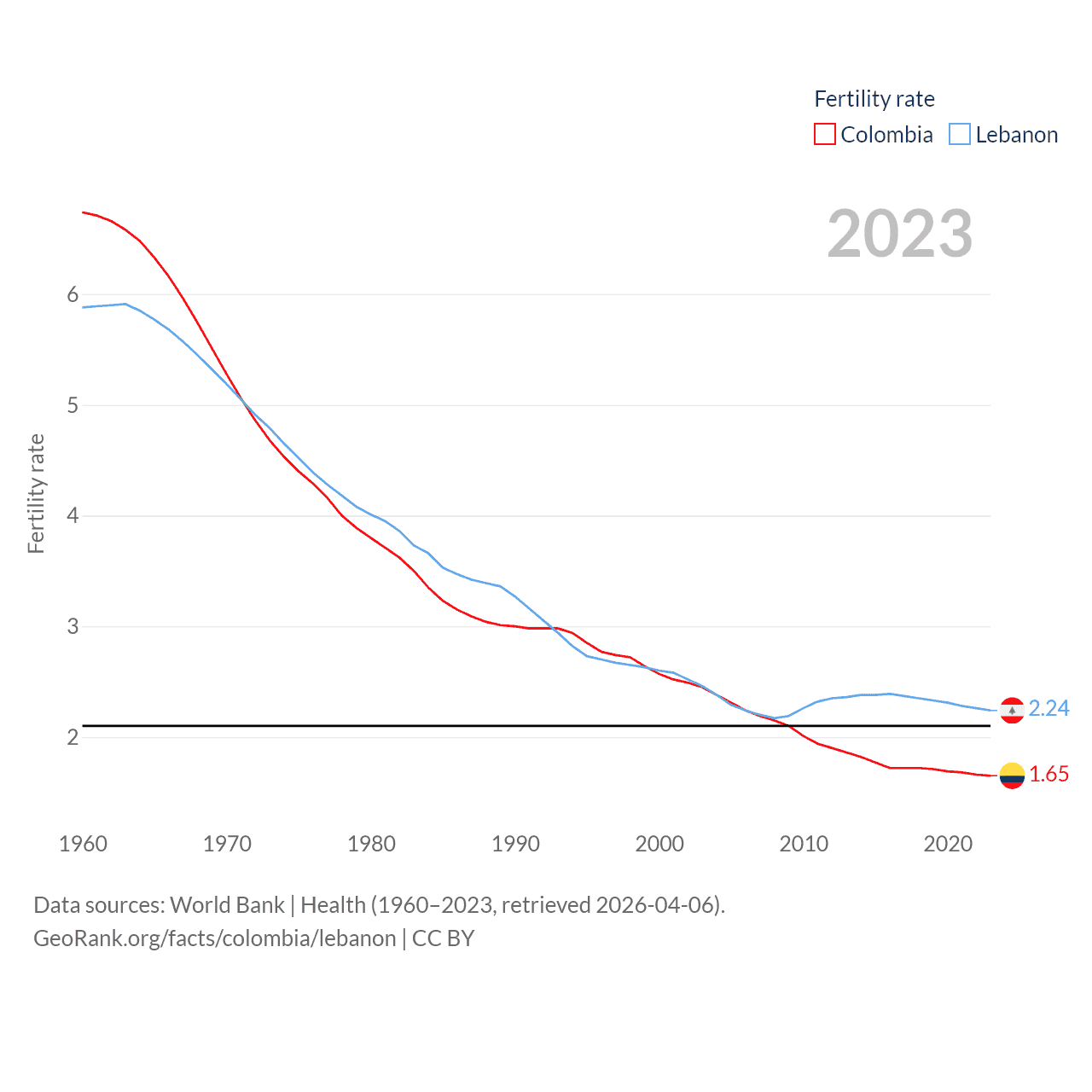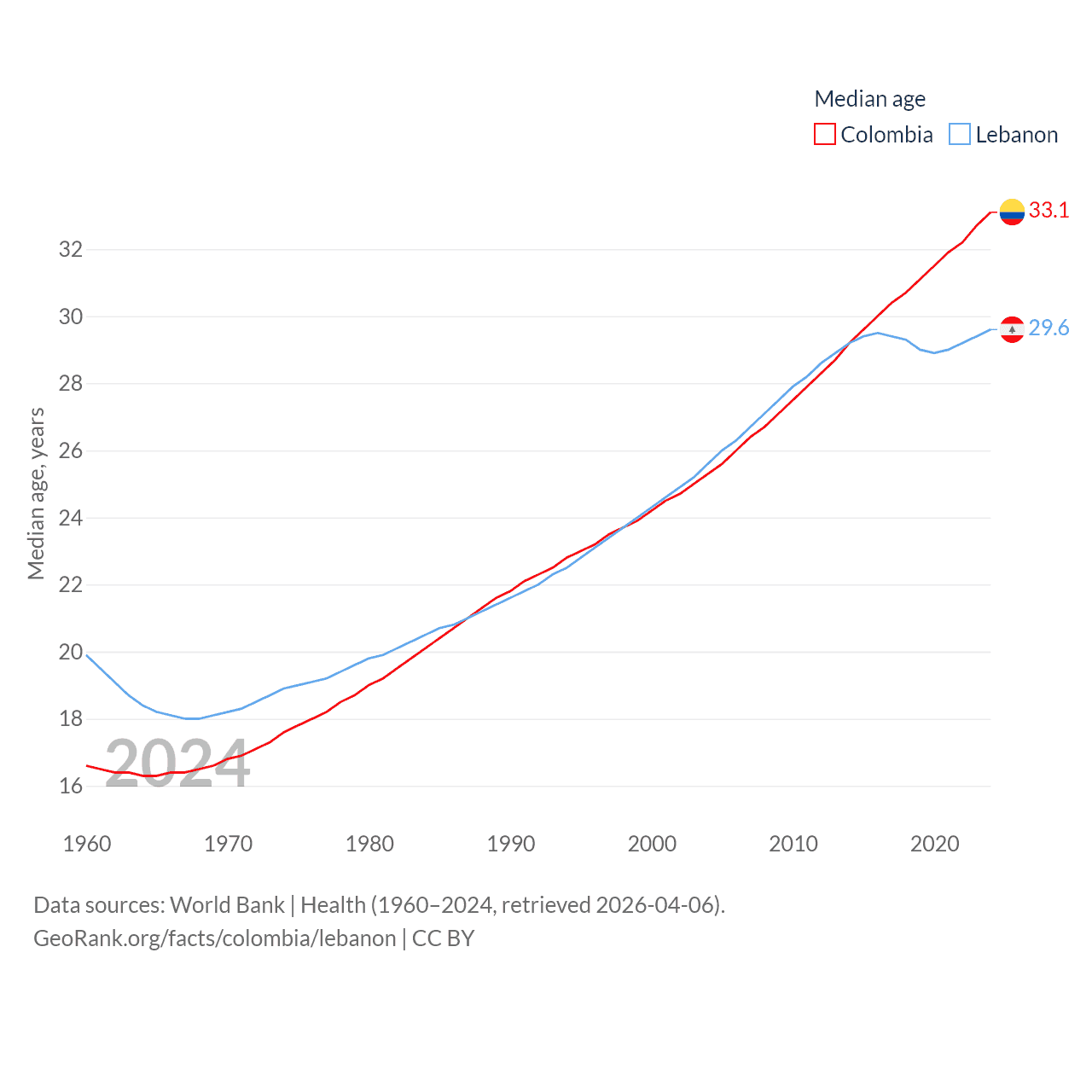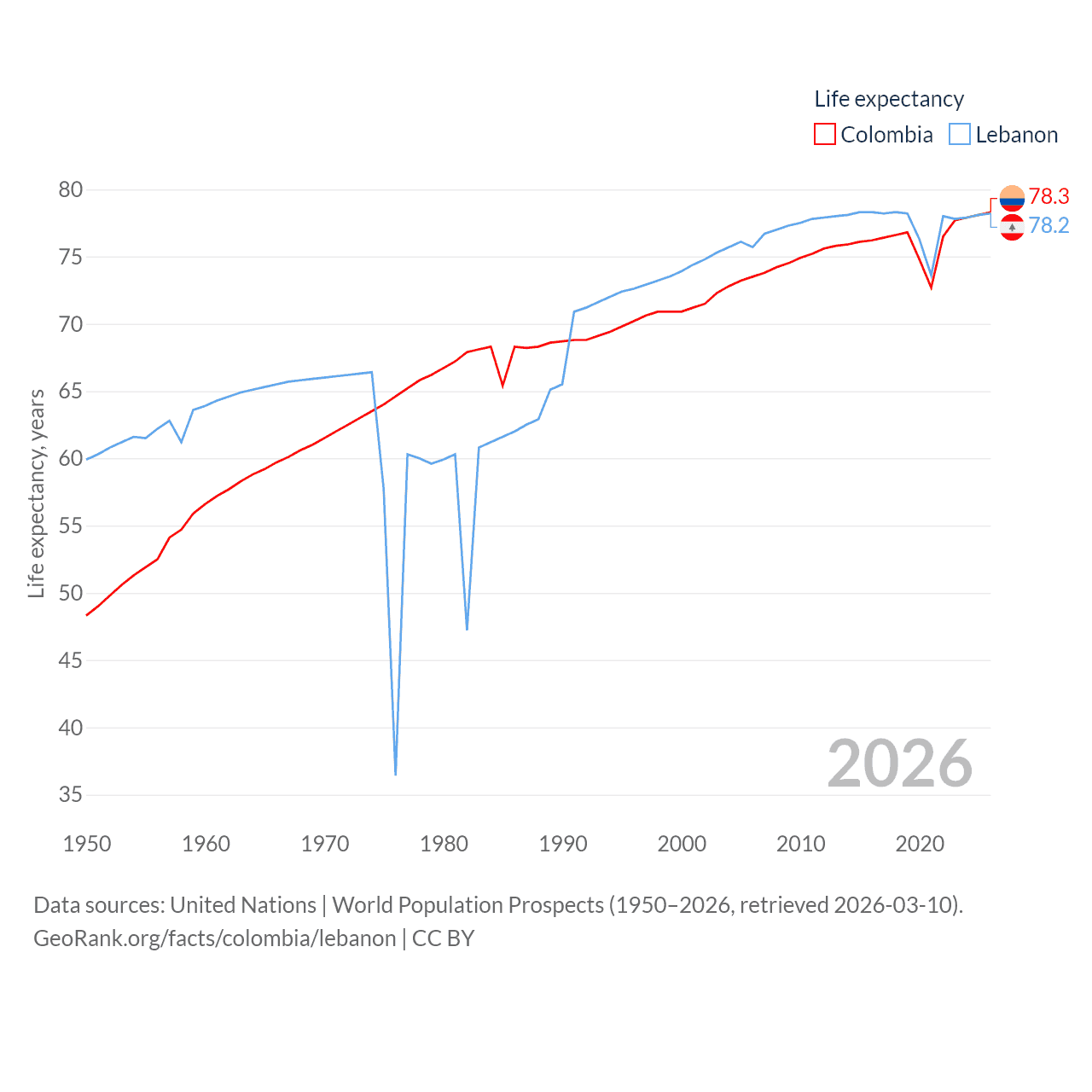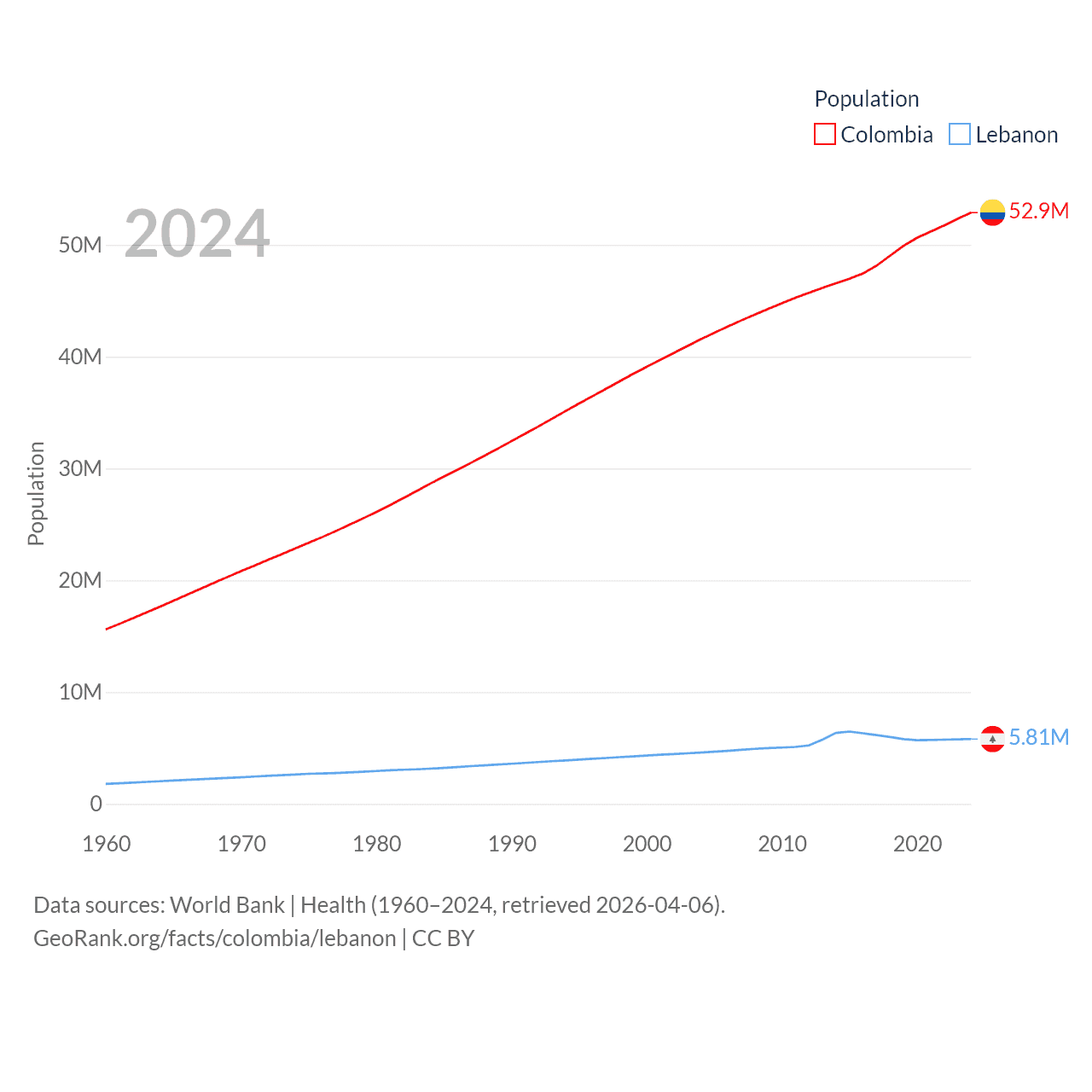 Colombia has a population of 52.9M (ranked 28/197), compared with 5.81M in Lebanon (ranked 115/197). Colombia's land area is 428,380 sq mi versus 3,950 sq mi for Lebanon (ranked 26th vs. 160th).