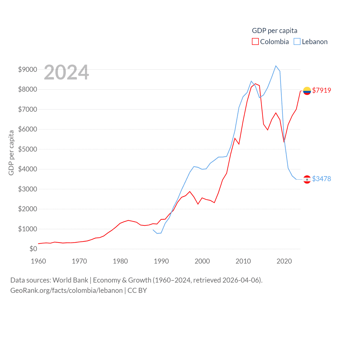 By GDP, Colombia ranks 39/197 ($419B) and Lebanon ranks 128/197 ($20.1B). By GDP per capita, Colombia ranks 94/197 ($7,919), while Lebanon ranks 135/197 ($3,478).