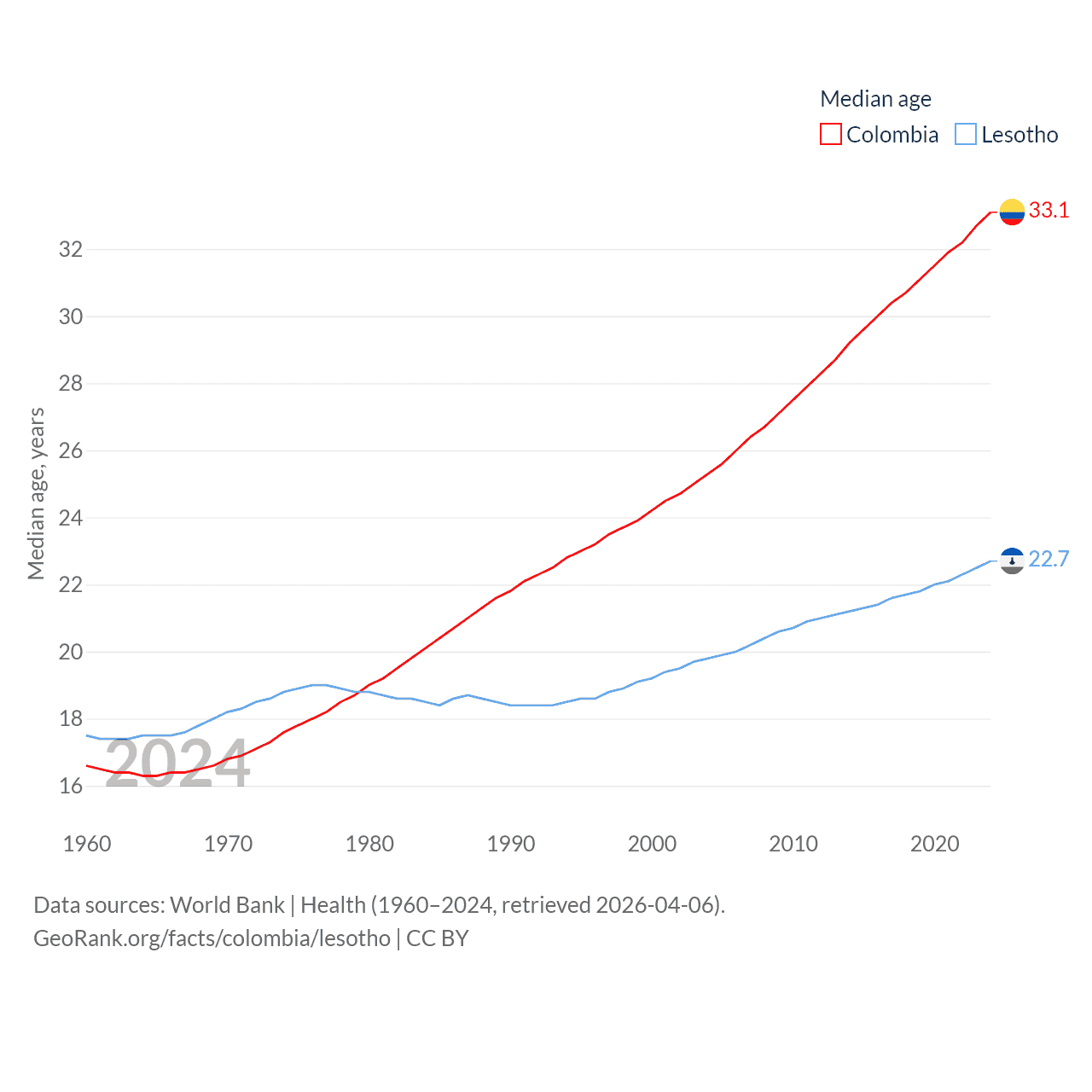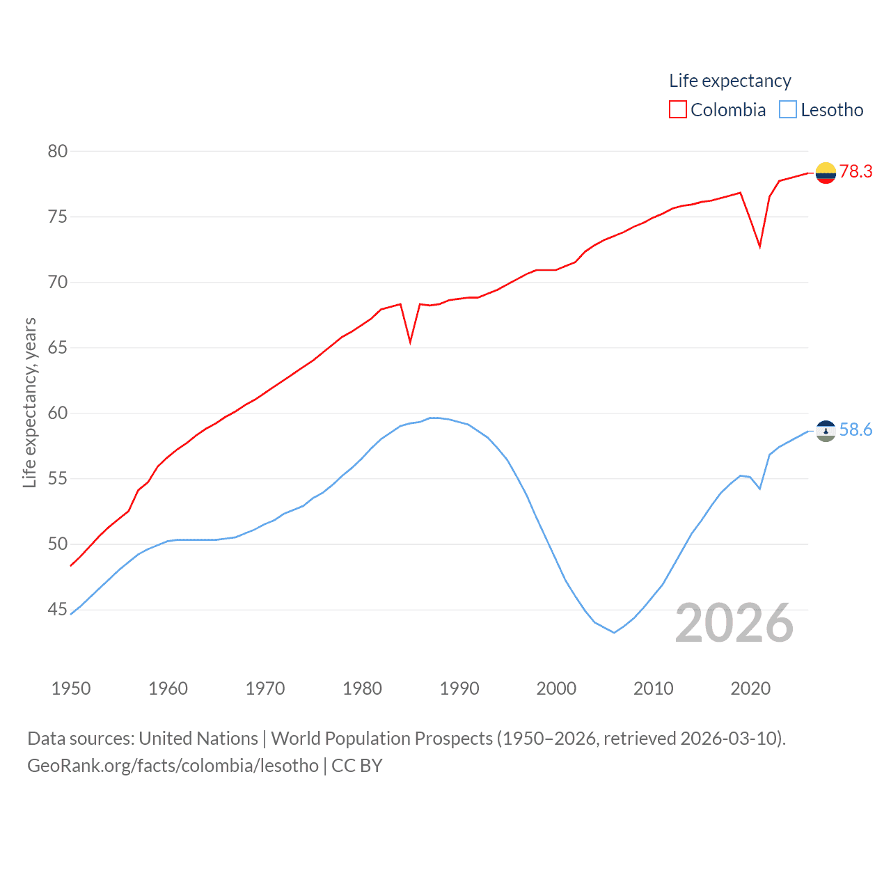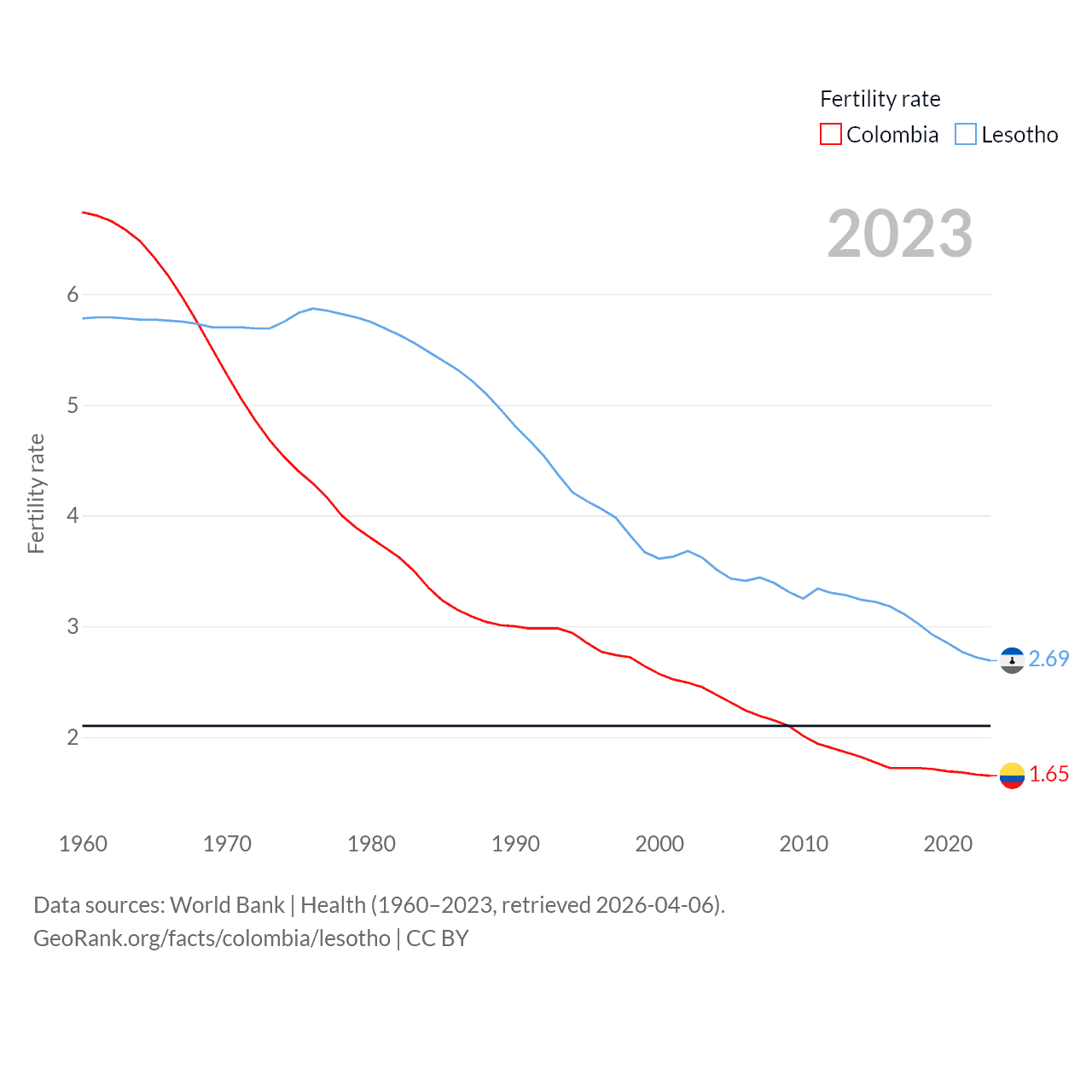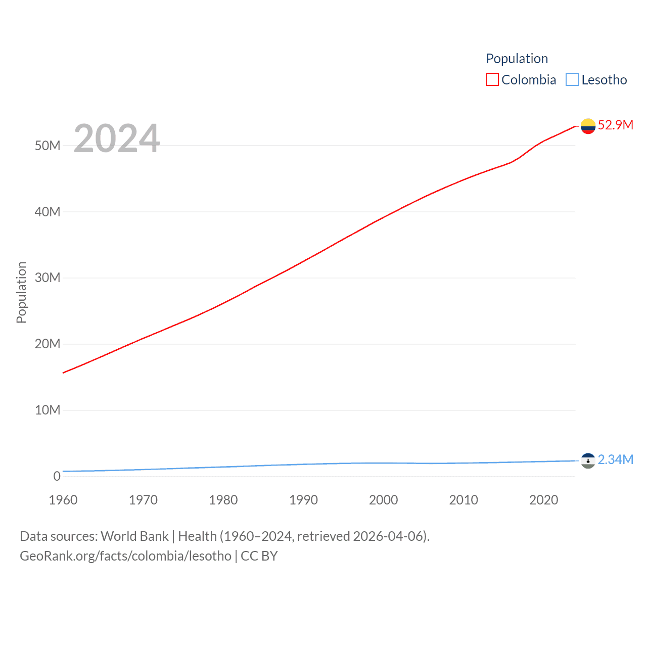 Colombia has a population of 52.9M (ranked 28/197), compared with 2.34M in Lesotho (ranked 145/197). Colombia's land area is 428,380 sq mi versus 11,722 sq mi for Lesotho (ranked 26th vs. 137th).