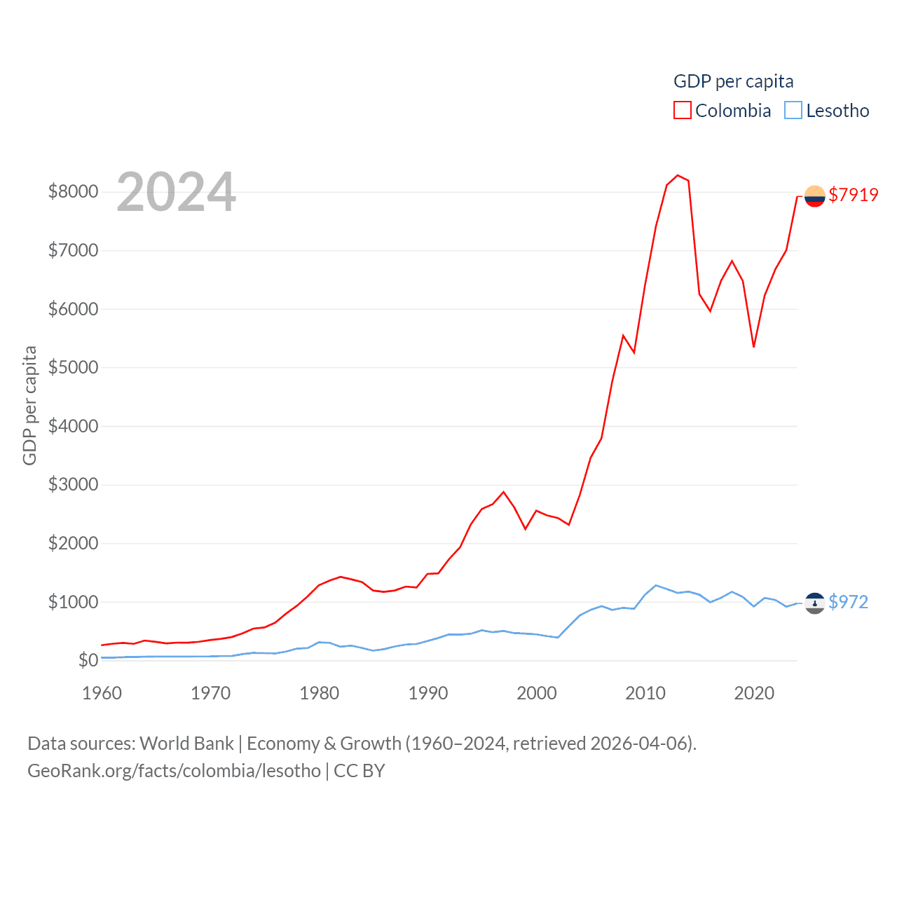 By GDP, Colombia ranks 39/197 ($419B) and Lesotho ranks 175/197 ($2.27B). By GDP per capita, Colombia ranks 94/197 ($7,919), while Lesotho ranks 181/197 ($972).